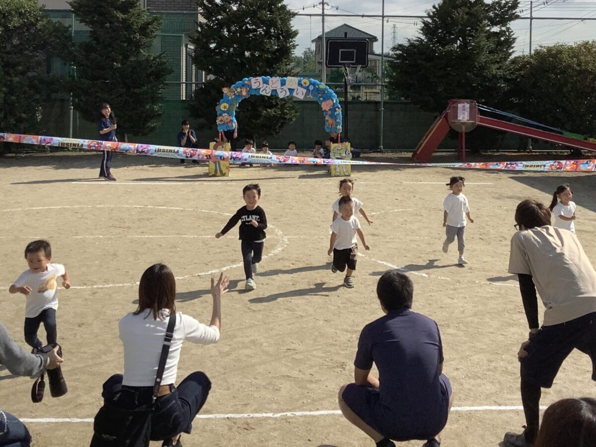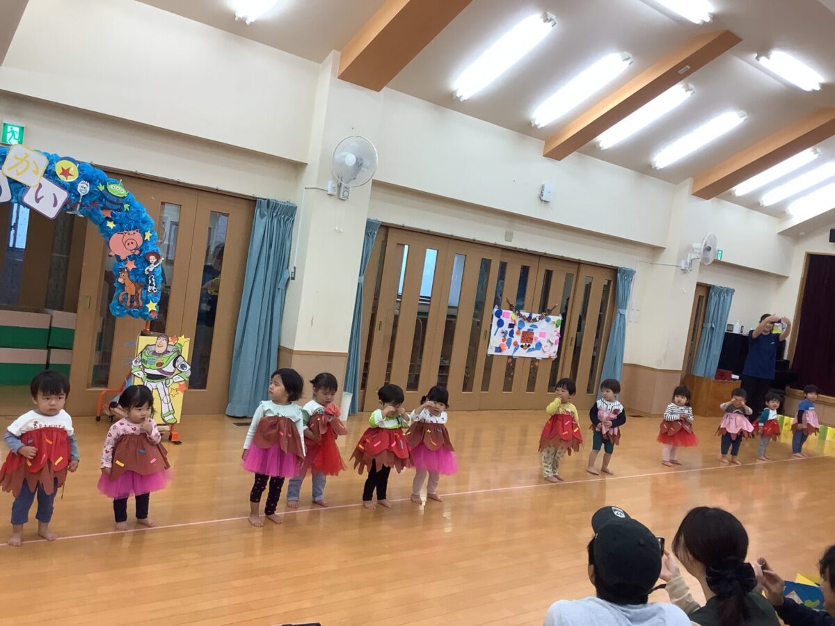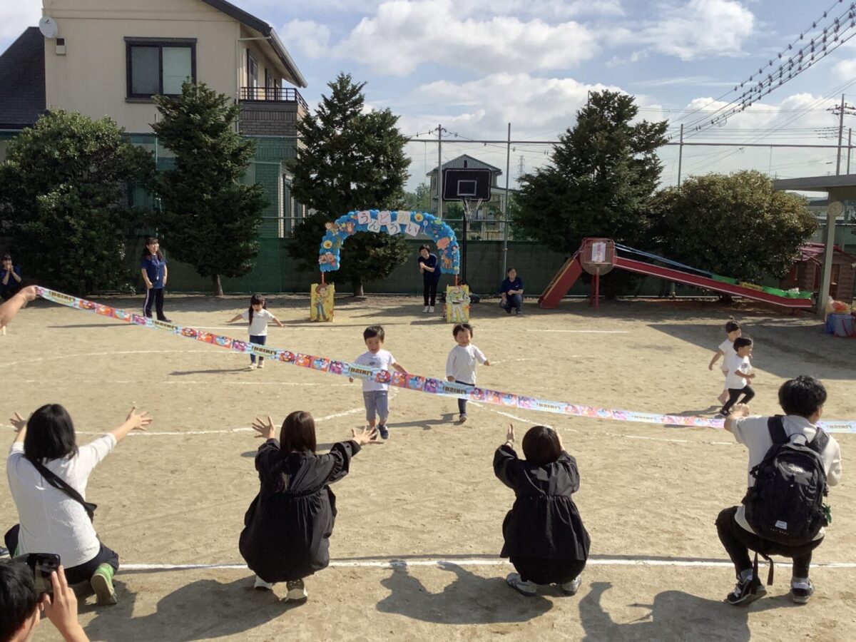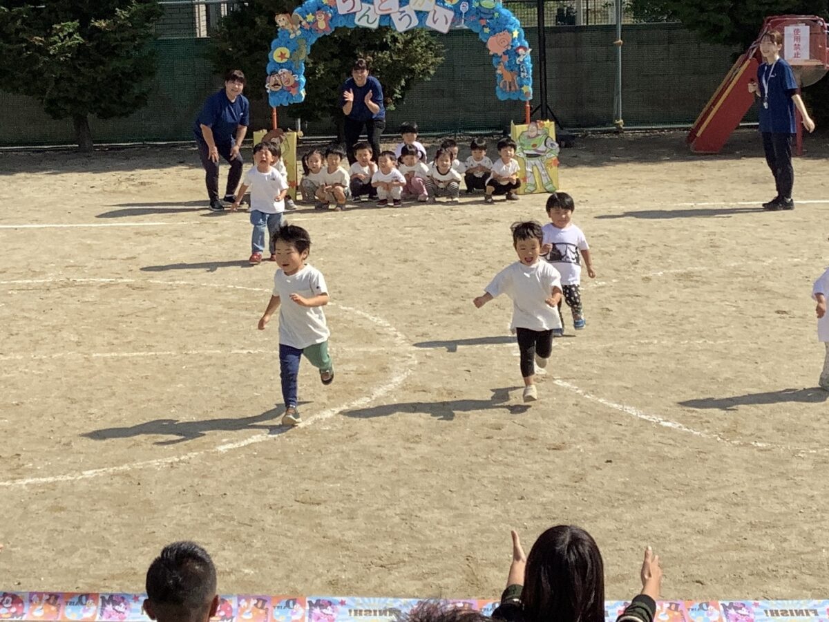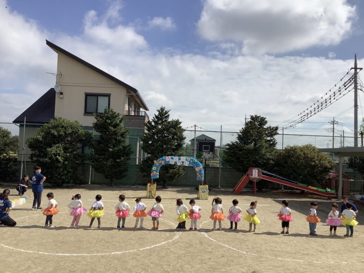 お遊戯では可愛らしい衣装を身につけニコニコ笑顔の子どもたち。かけっこでは元気なお返事と一生懸命最後まで走りきるかっこいい姿を見せてくれました!