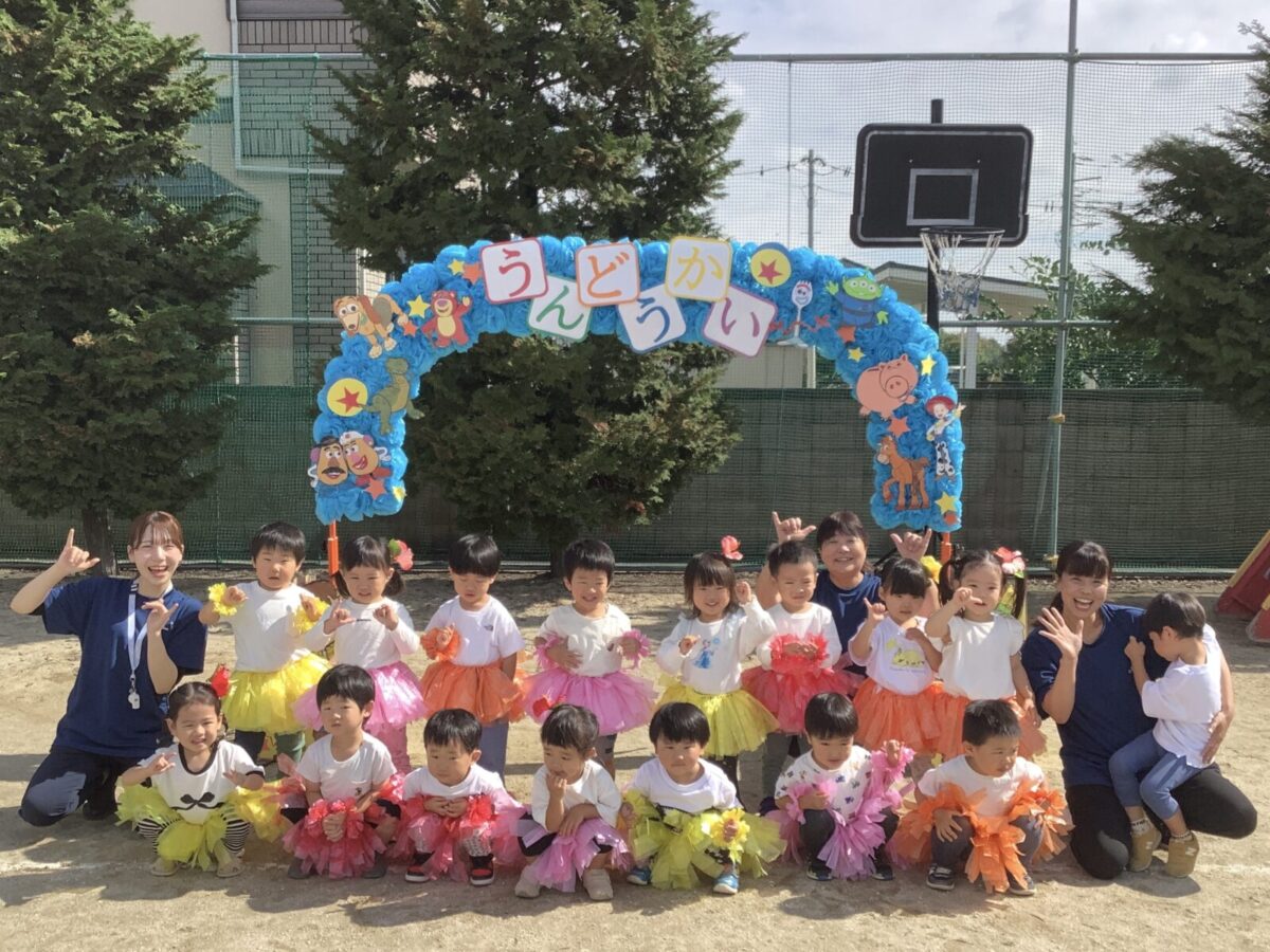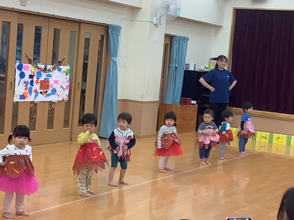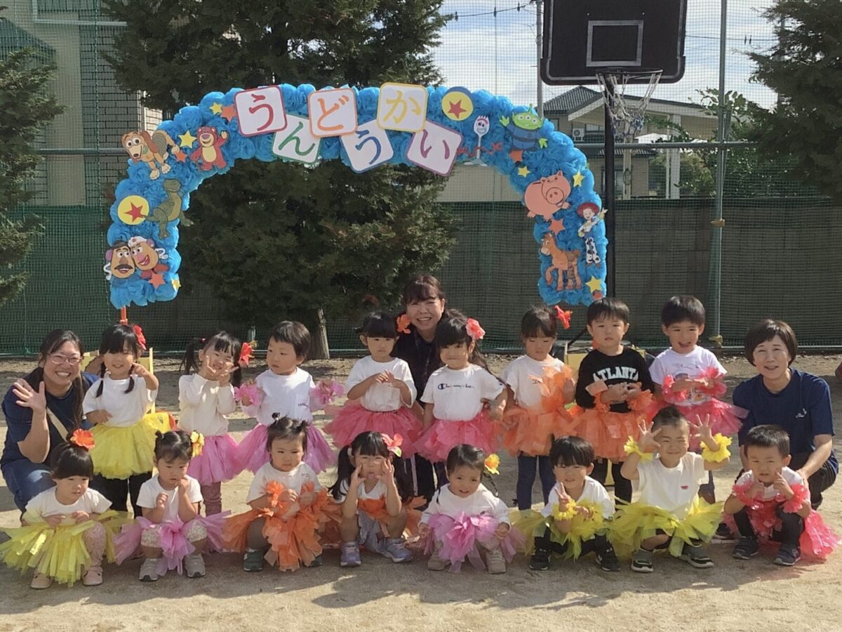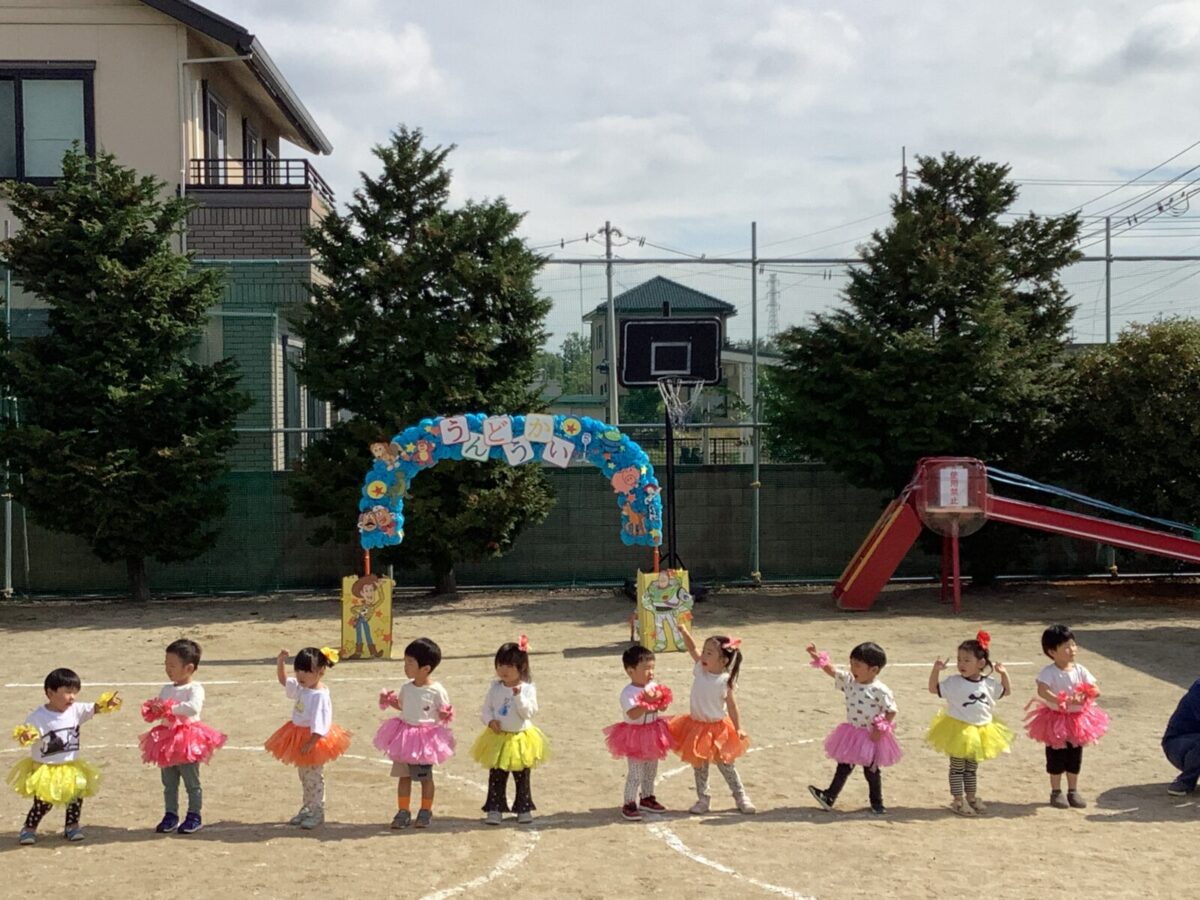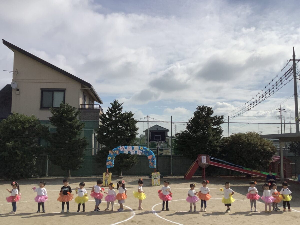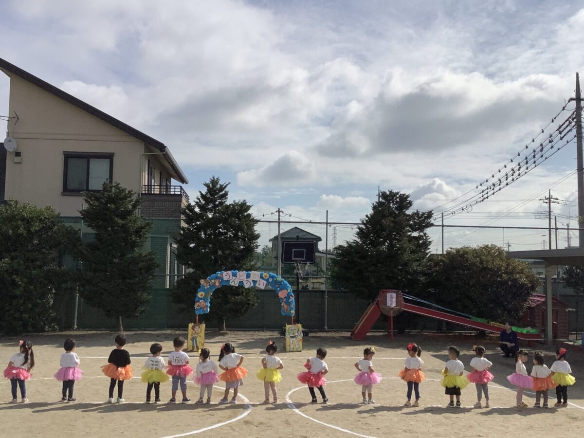 お遊戯では可愛らしい衣装を身につけニコニコ笑顔の子どもたち。かけっこでは元気なお返事と一生懸命最後まで走りきるかっこいい姿を見せてくれました!