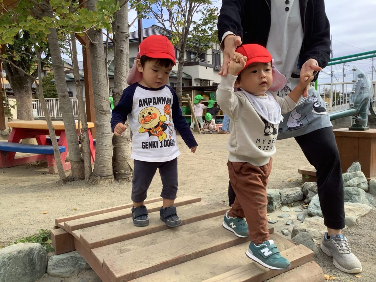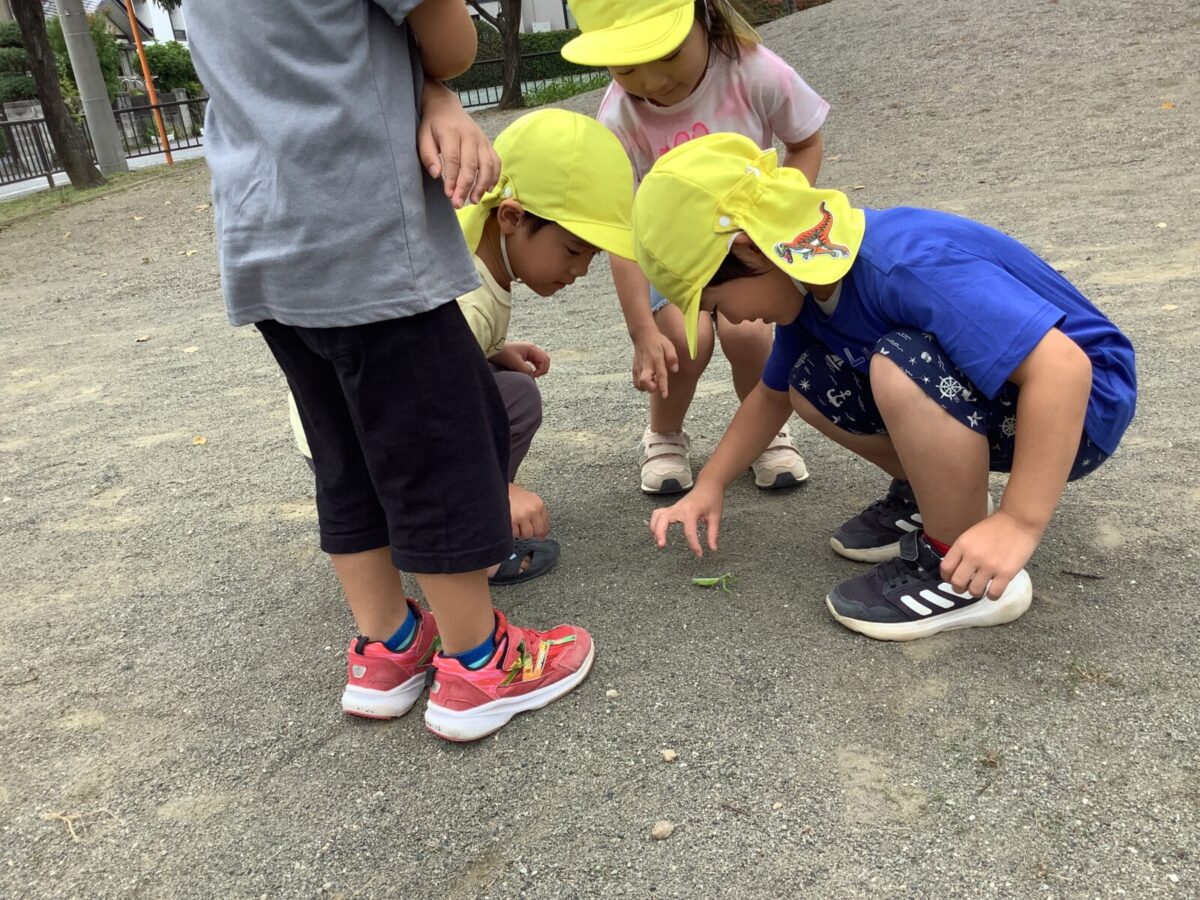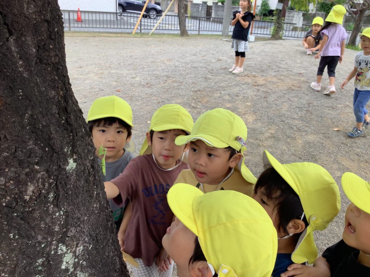 天気の良い日ににじ組は八反田公園に行きました。保育園にはない遊具での遊びを楽しんだり、カマキリを見つけ触れ合ったりと様々な発見があり、自然を感じることができました。