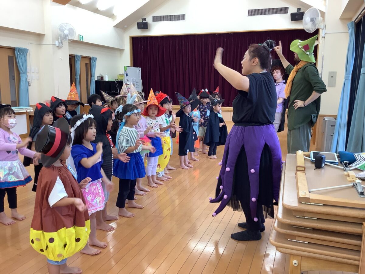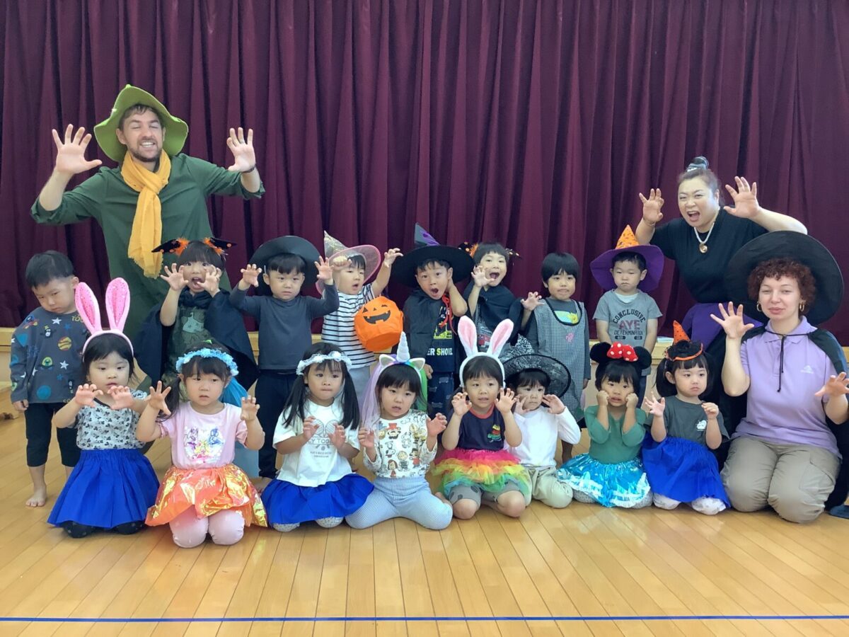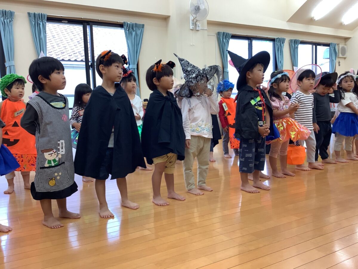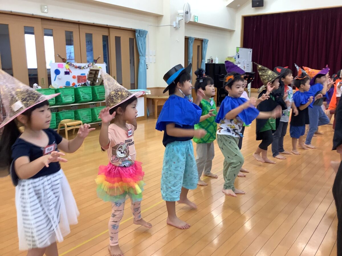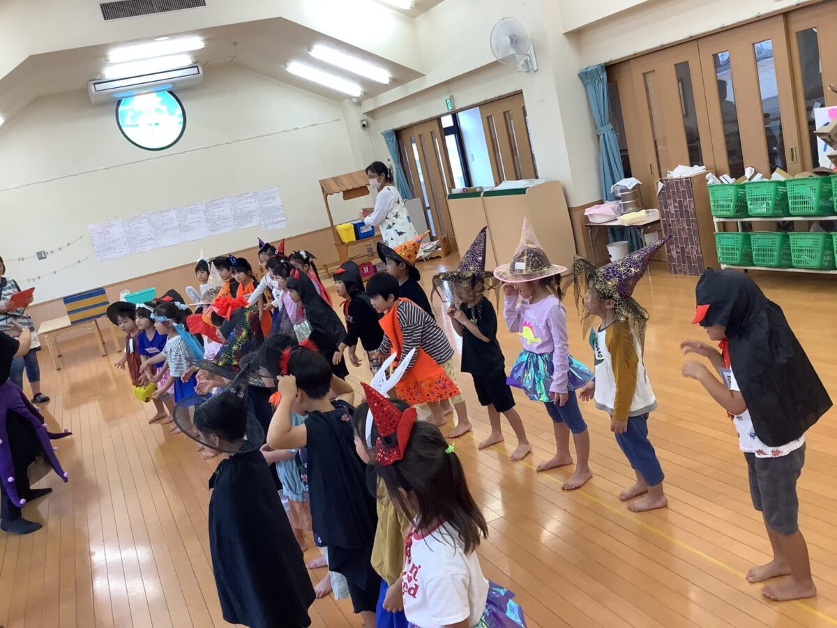 2、3、4、5歳児は毎月2回英語遊びをしています。今月はハロウィンということもあり、仮装をして英語遊びに参加しました。カラフルな衣装を身にまとい、目をキラキラ輝かせる子どもたちでした。