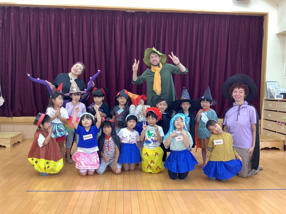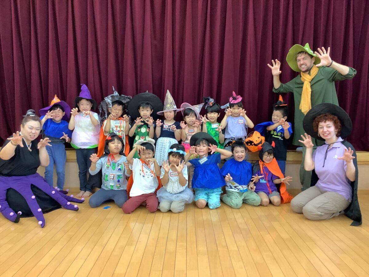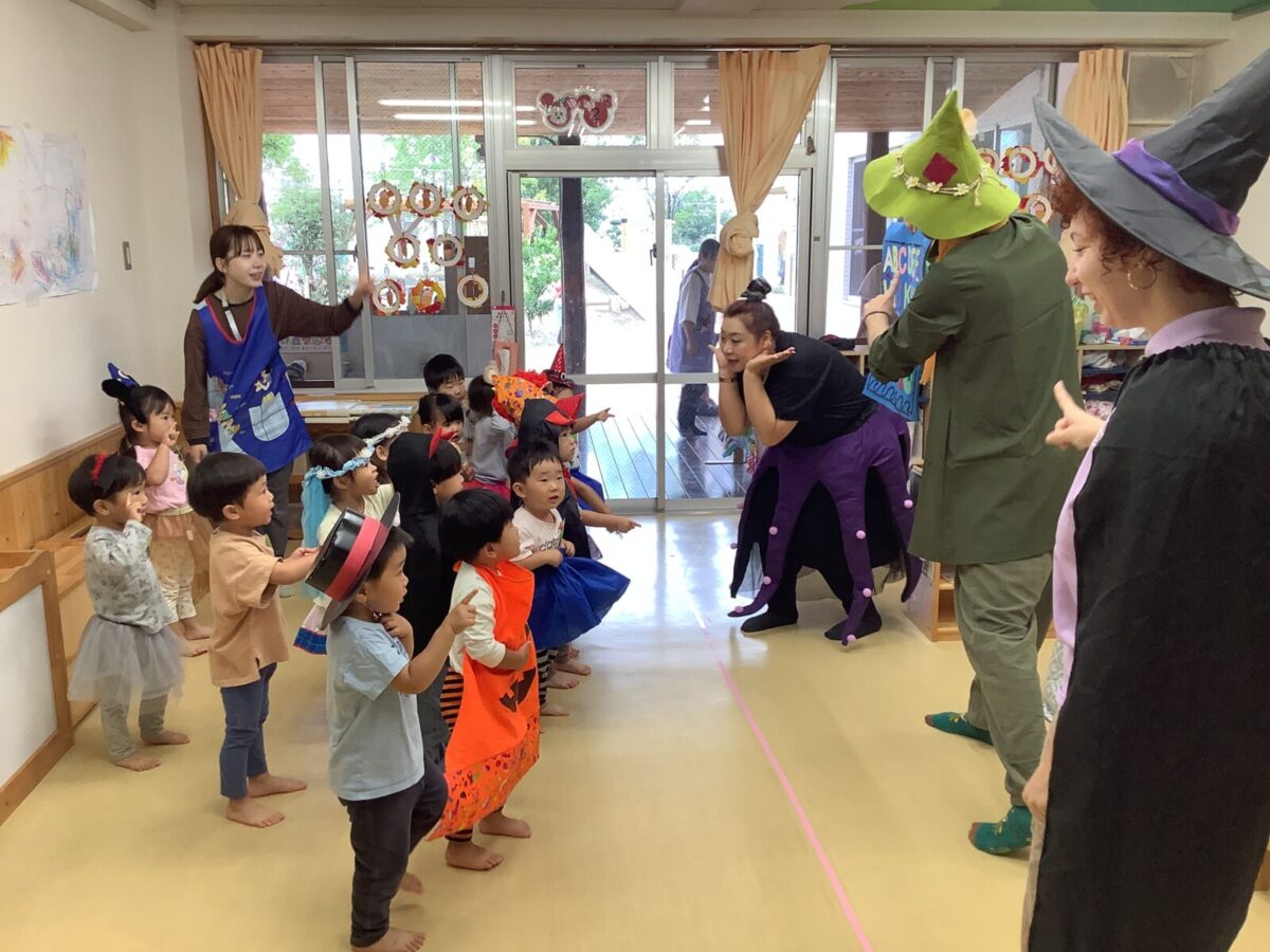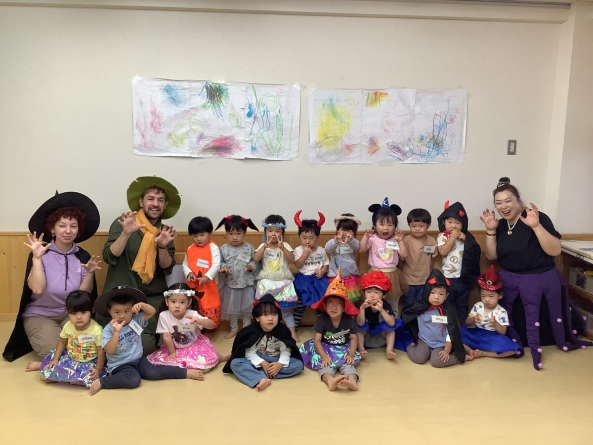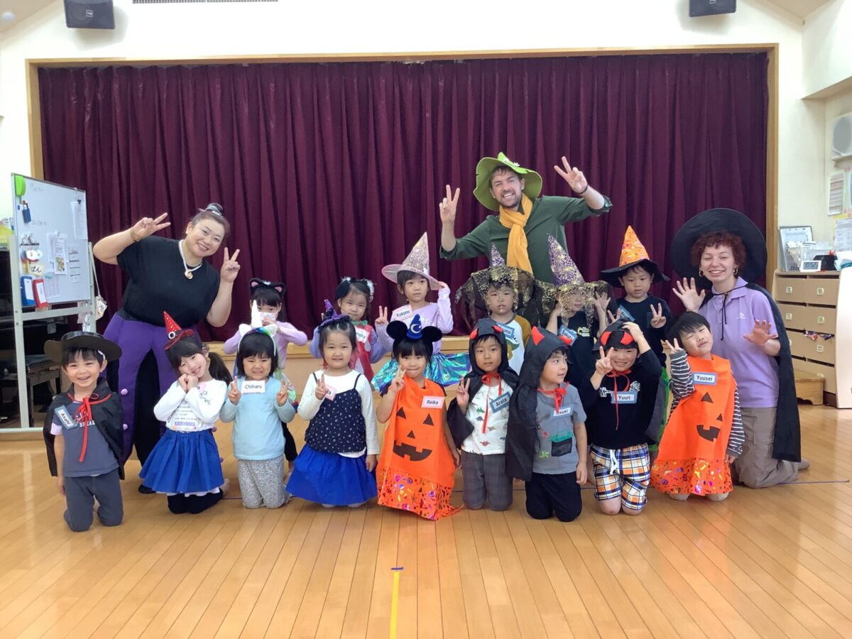 2、3、4、5歳児は毎月2回英語遊びをしています。今月はハロウィンということもあり、仮装をして英語遊びに参加しました。カラフルな衣装を身にまとい、目をキラキラ輝かせる子どもたちでした。