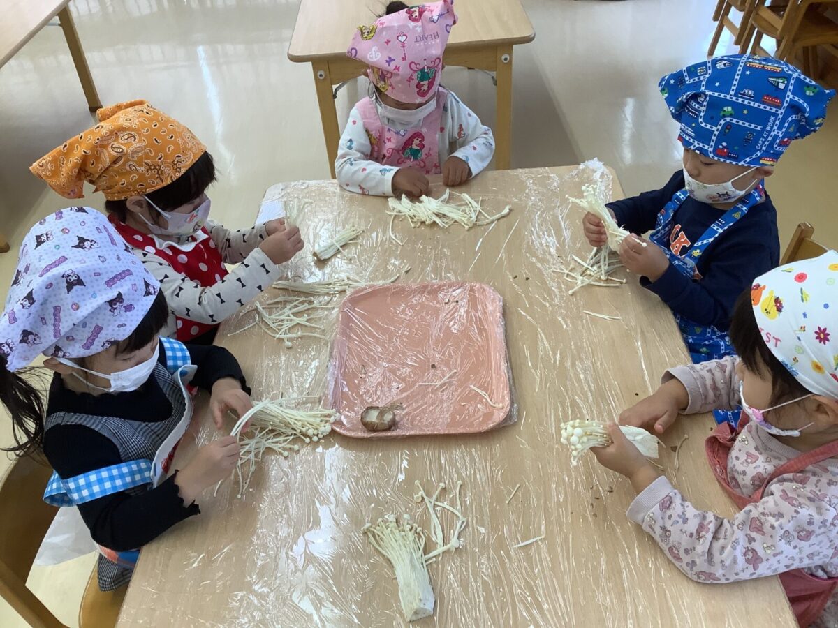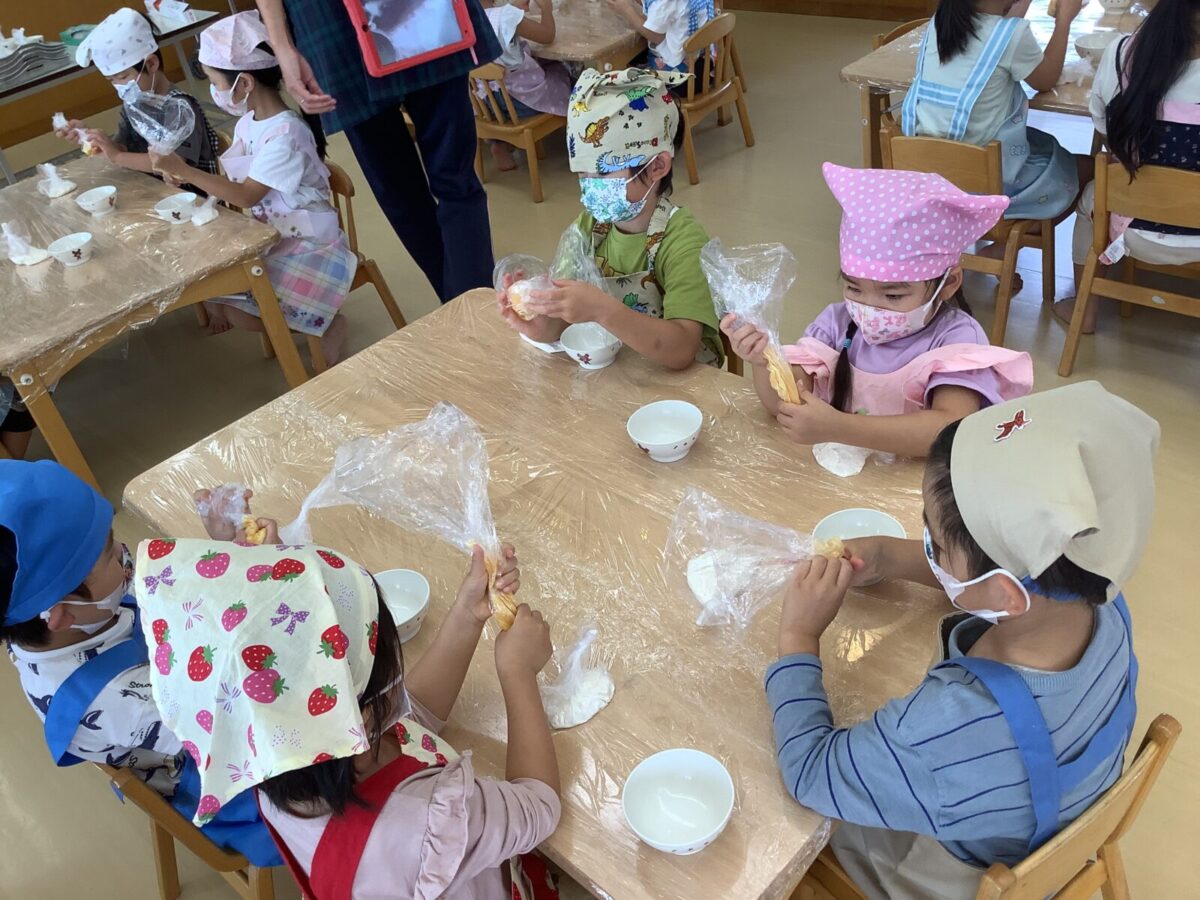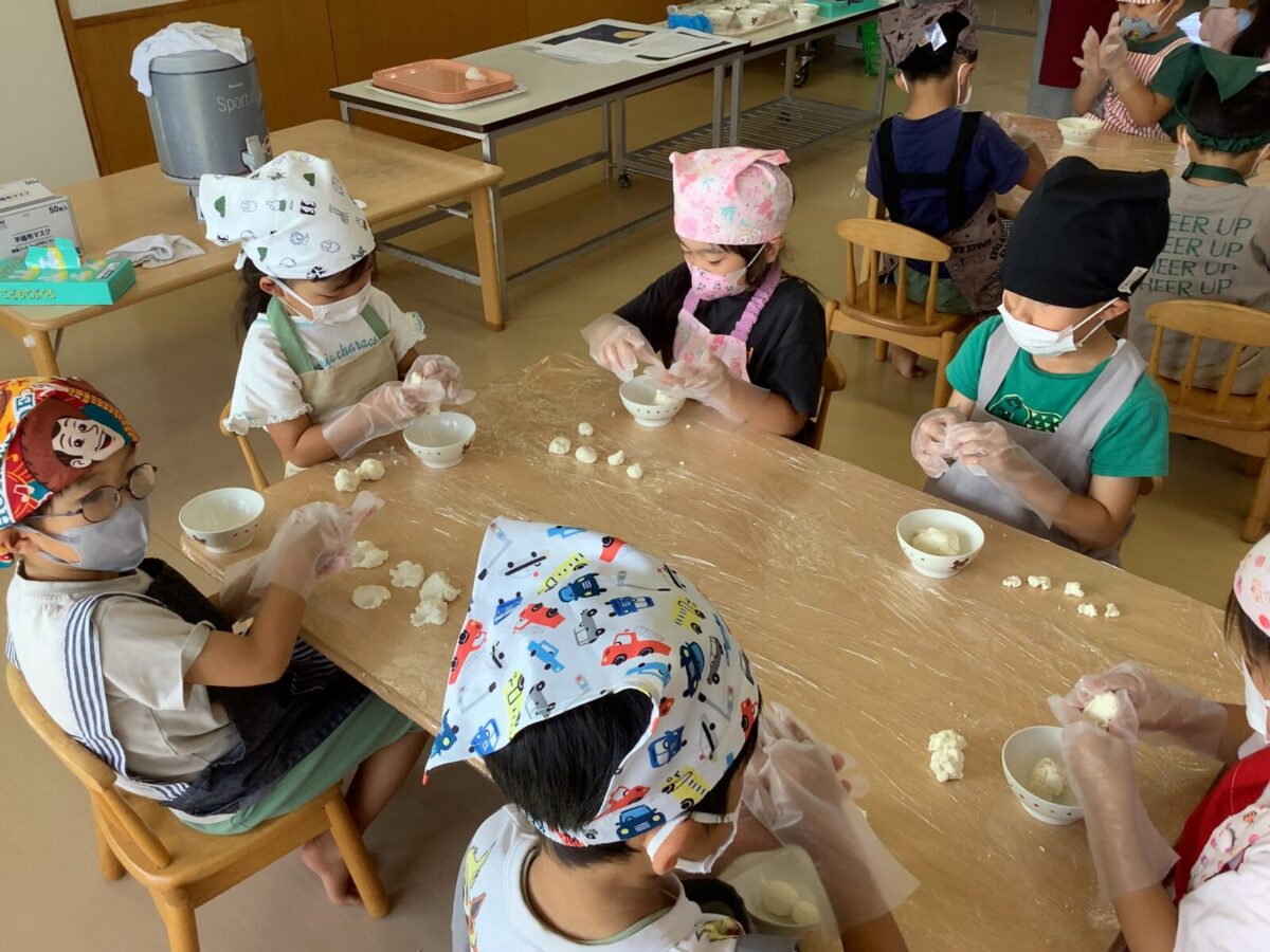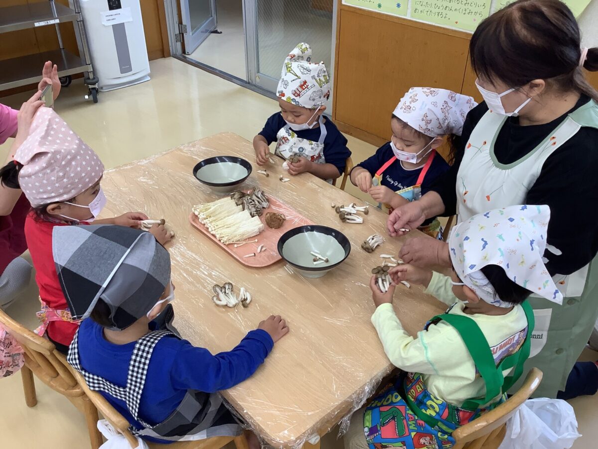 今月の食育では、つき組は「きのこに触れてみよう」にじ組は「クッキー作り」そら組は「お月見団子作り」をしました。野菜の匂いや生地の感触を存分に感じ、食に対する興味が高まったように感じます。