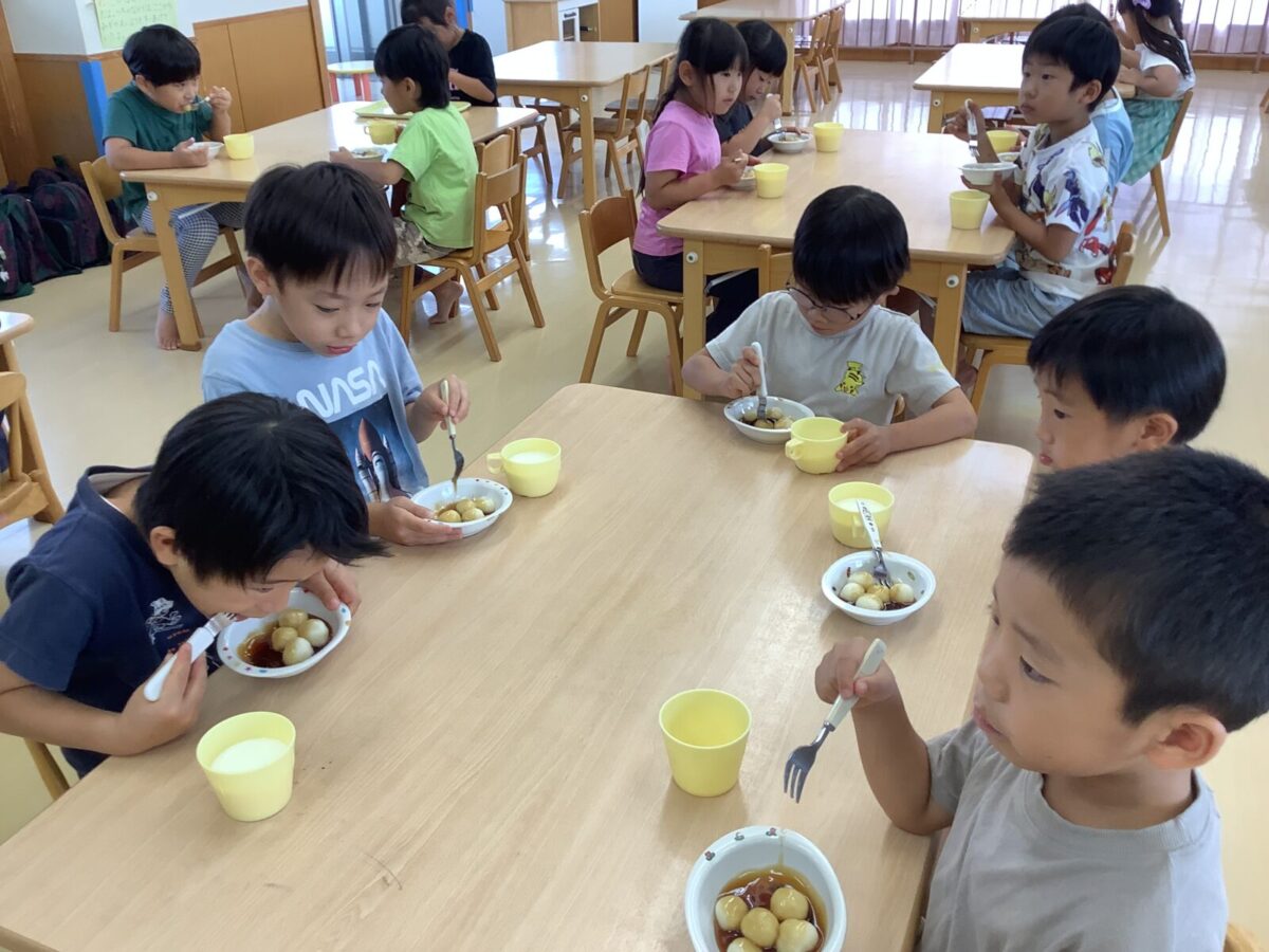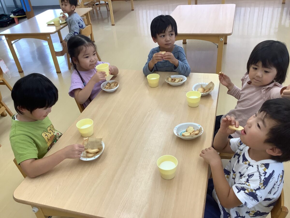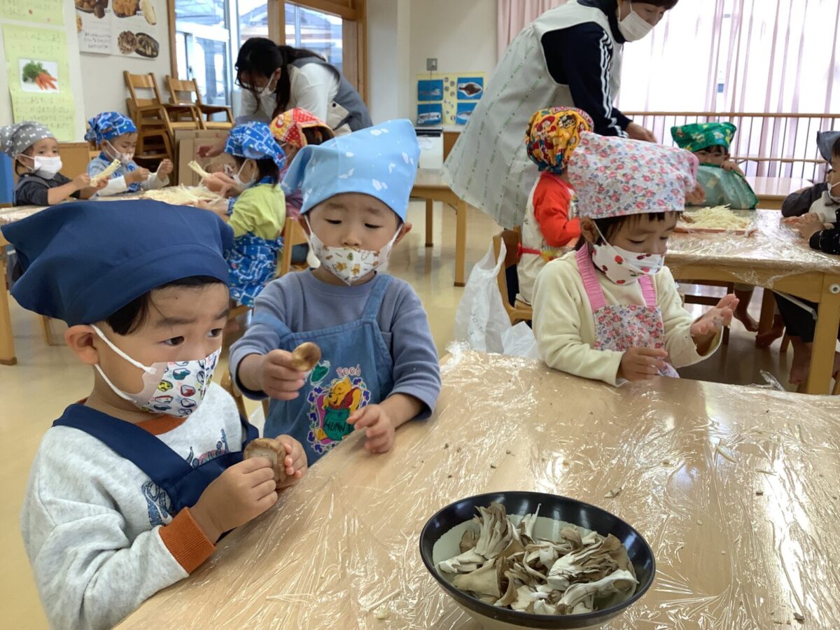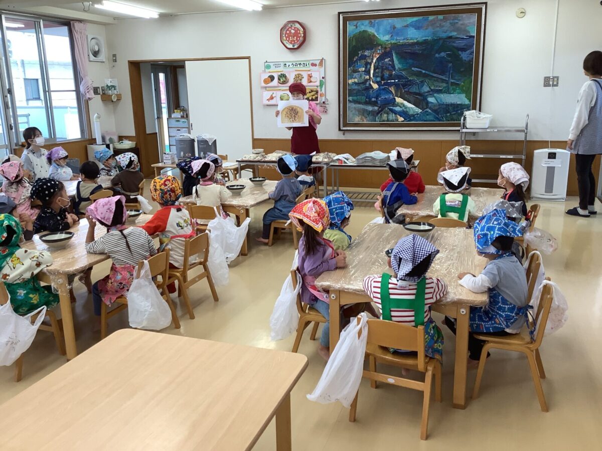 今月の食育では、つき組は「きのこに触れてみよう」にじ組は「クッキー作り」そら組は「お月見団子作り」をしました。野菜の匂いや生地の感触を存分に感じ、食に対する興味が高まったように感じます。
