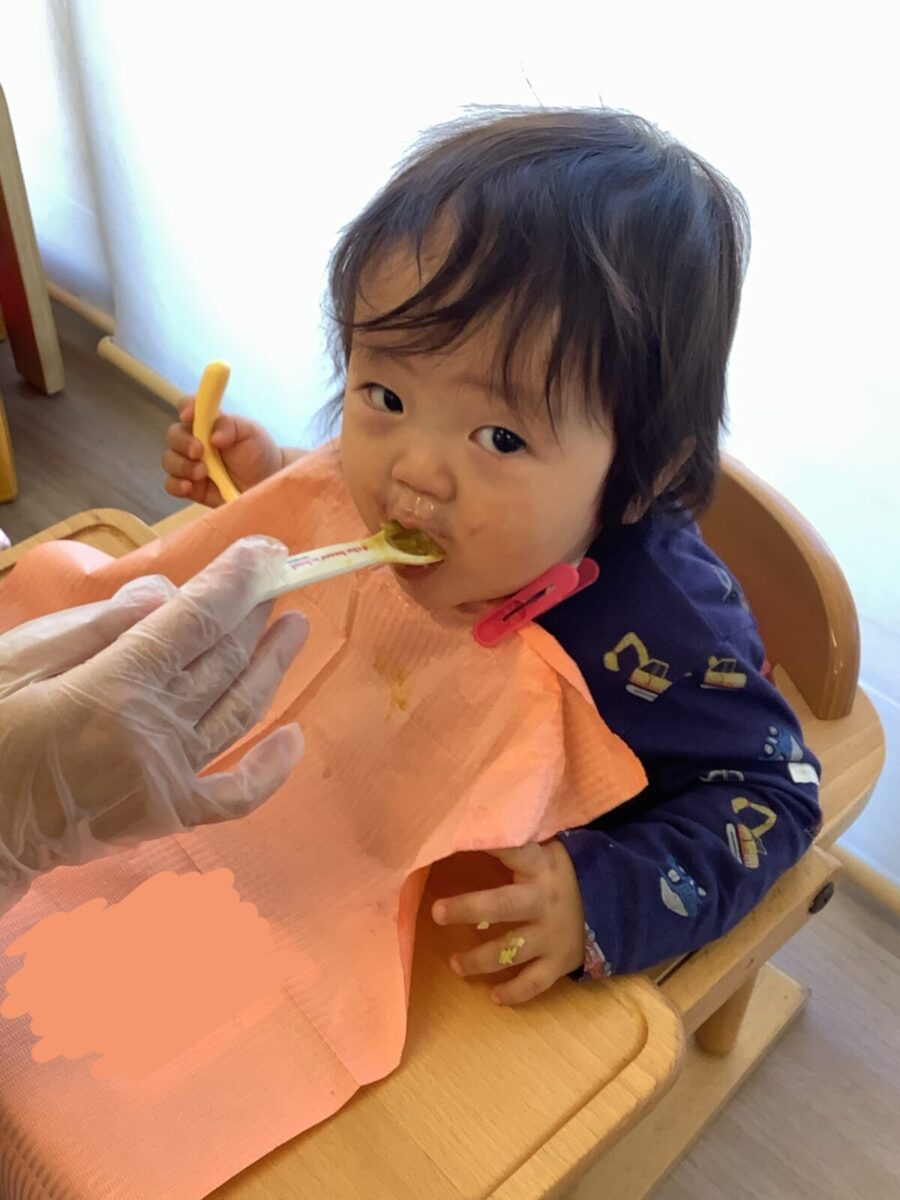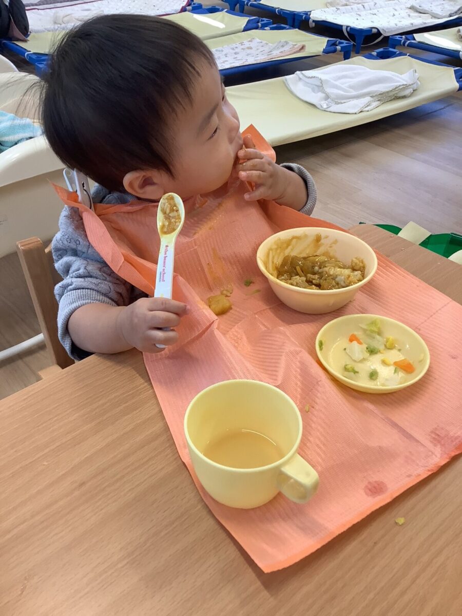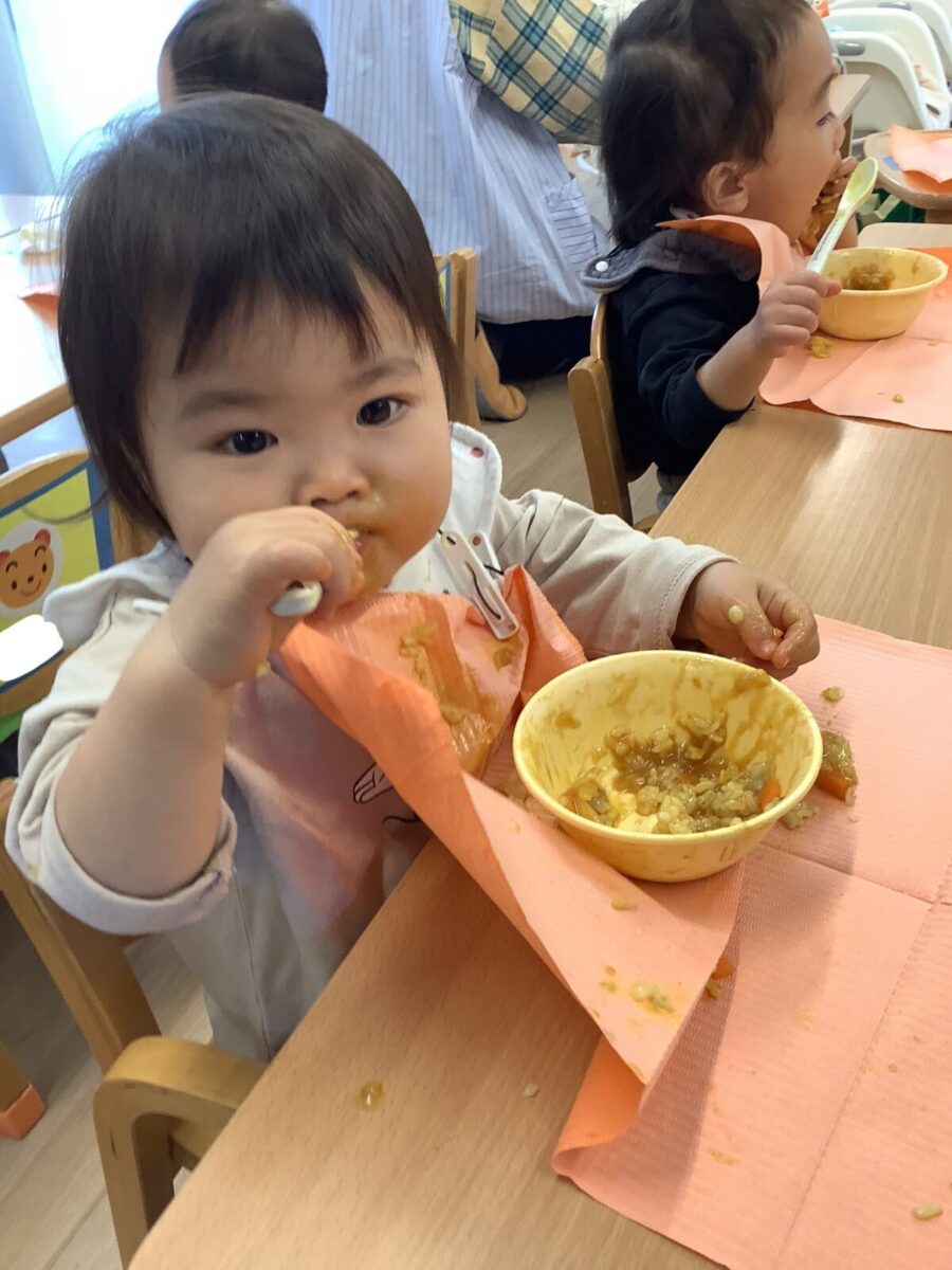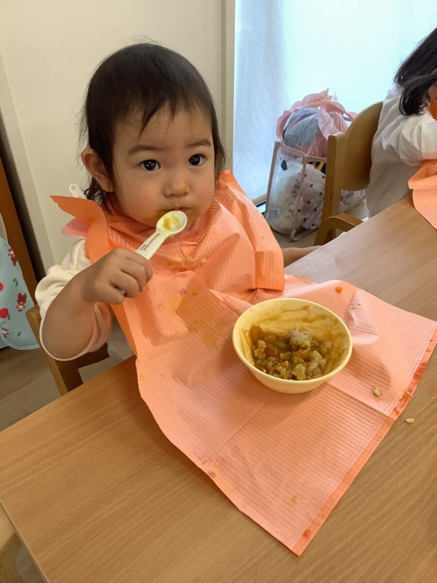 〈食事〉自分でスプーンを持って食べられるようになってきましたよ!
