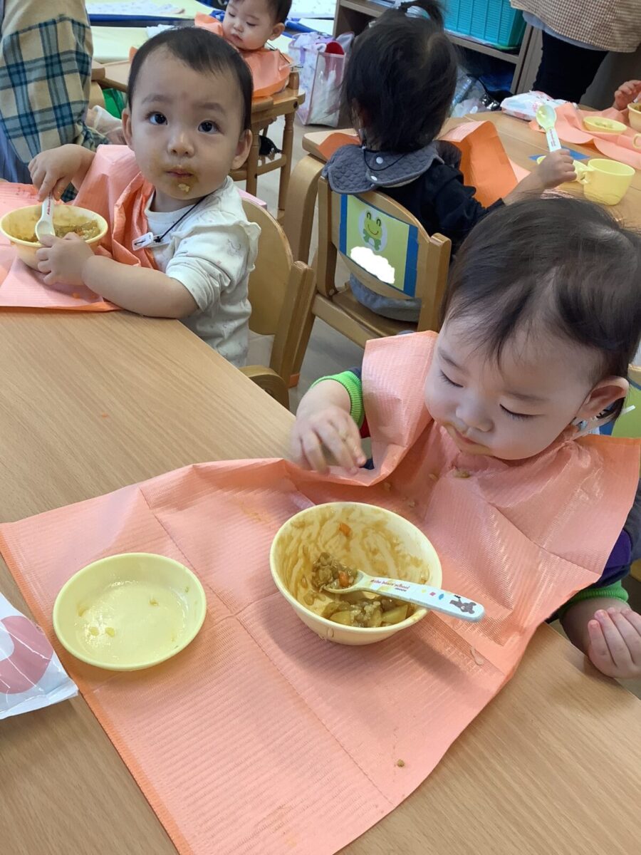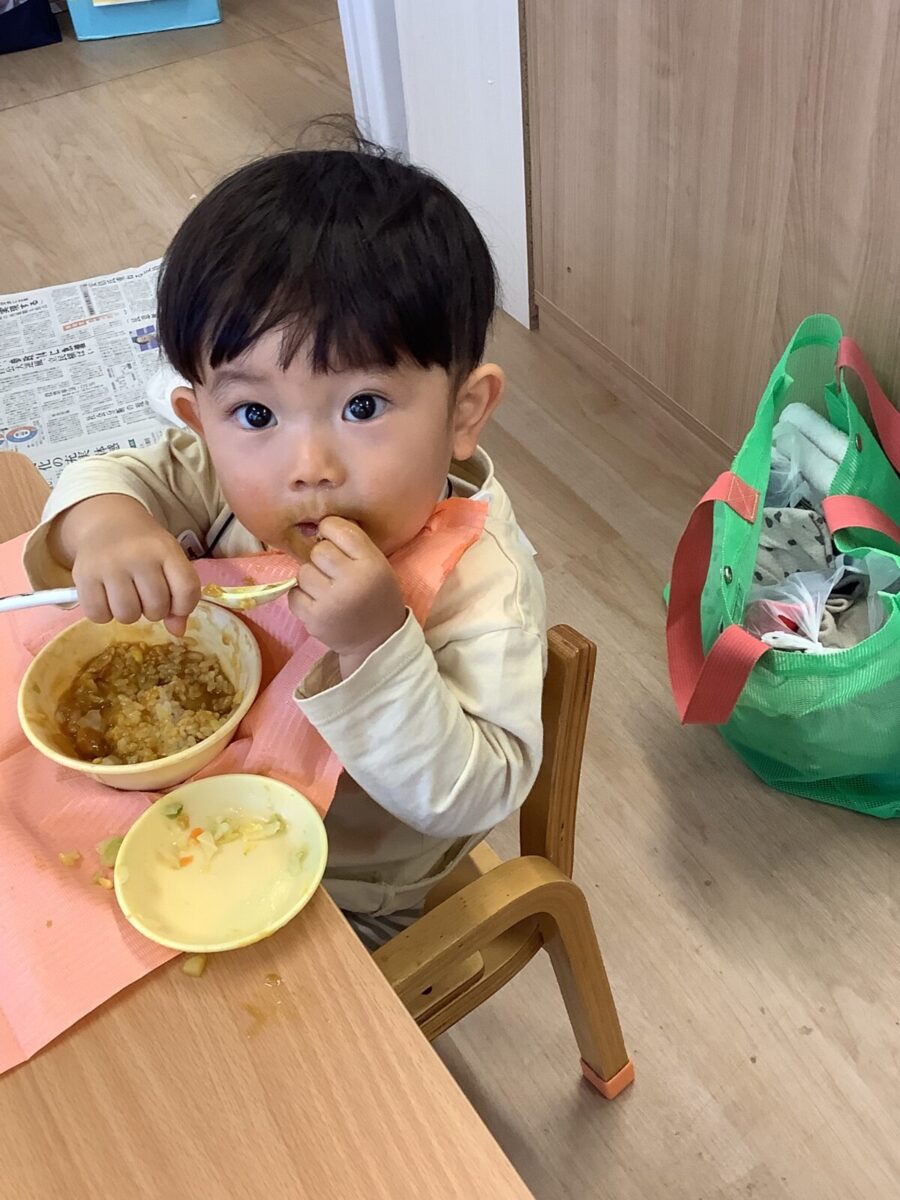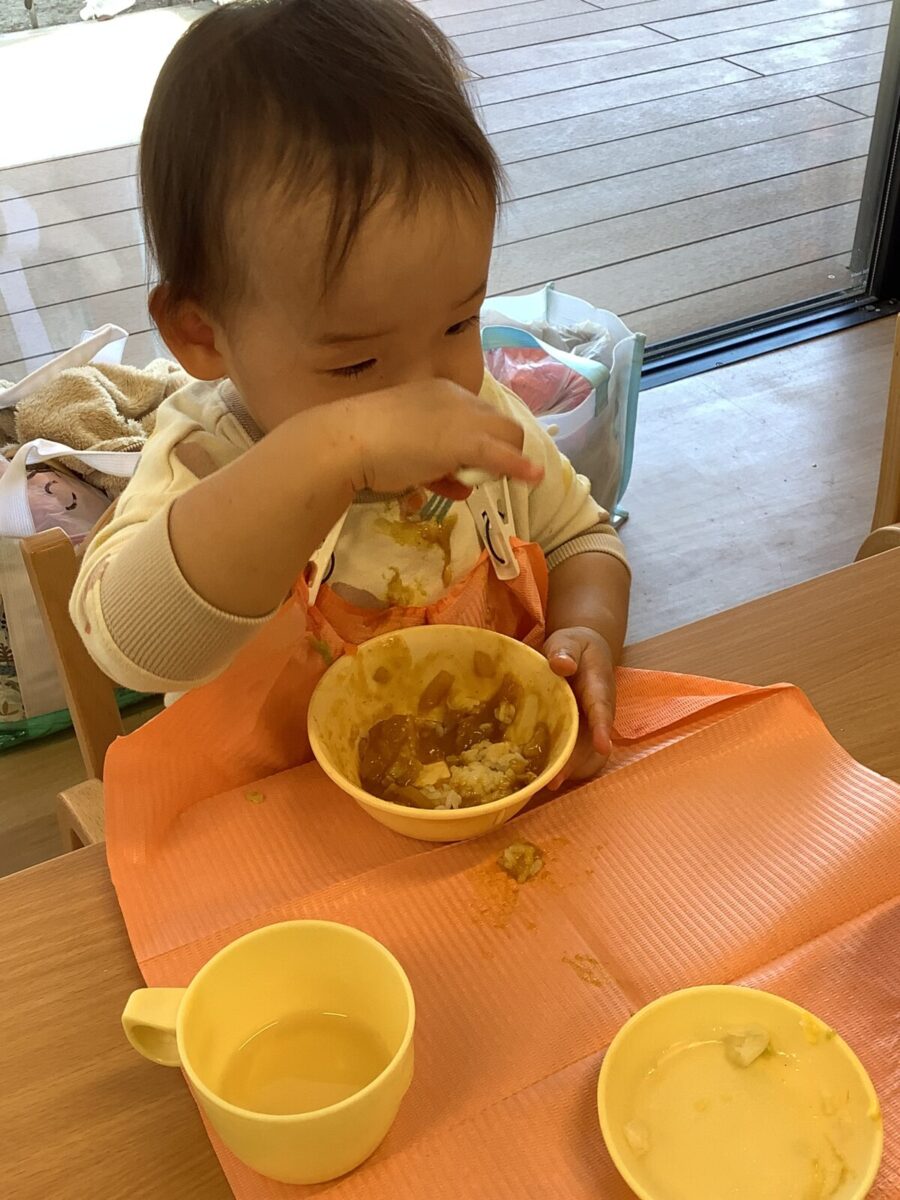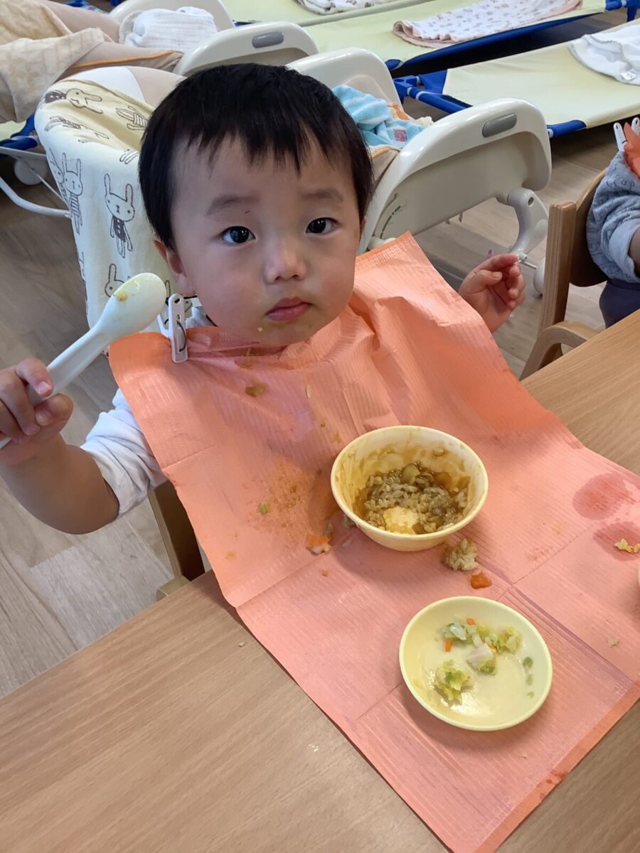〈食事〉自分でスプーンを持って食べられるようになってきましたよ!