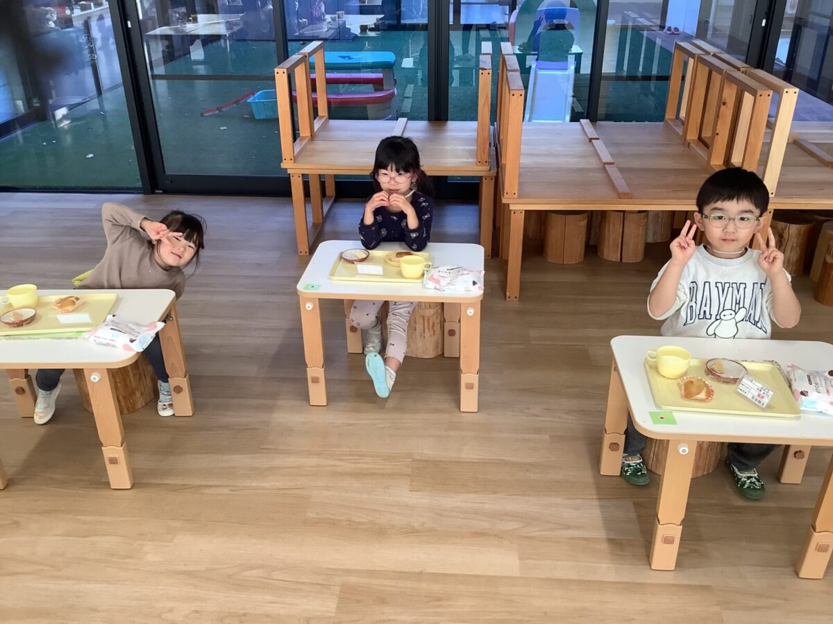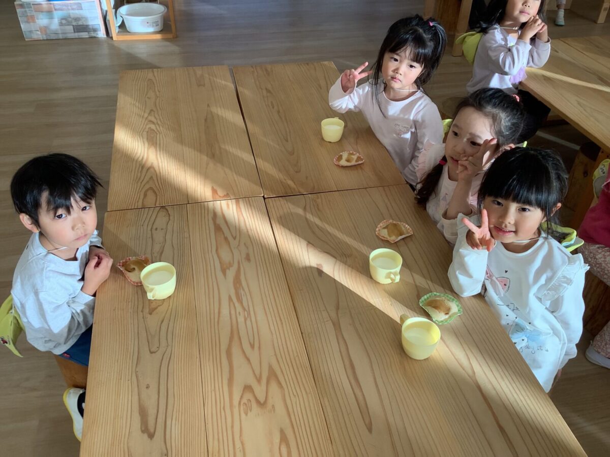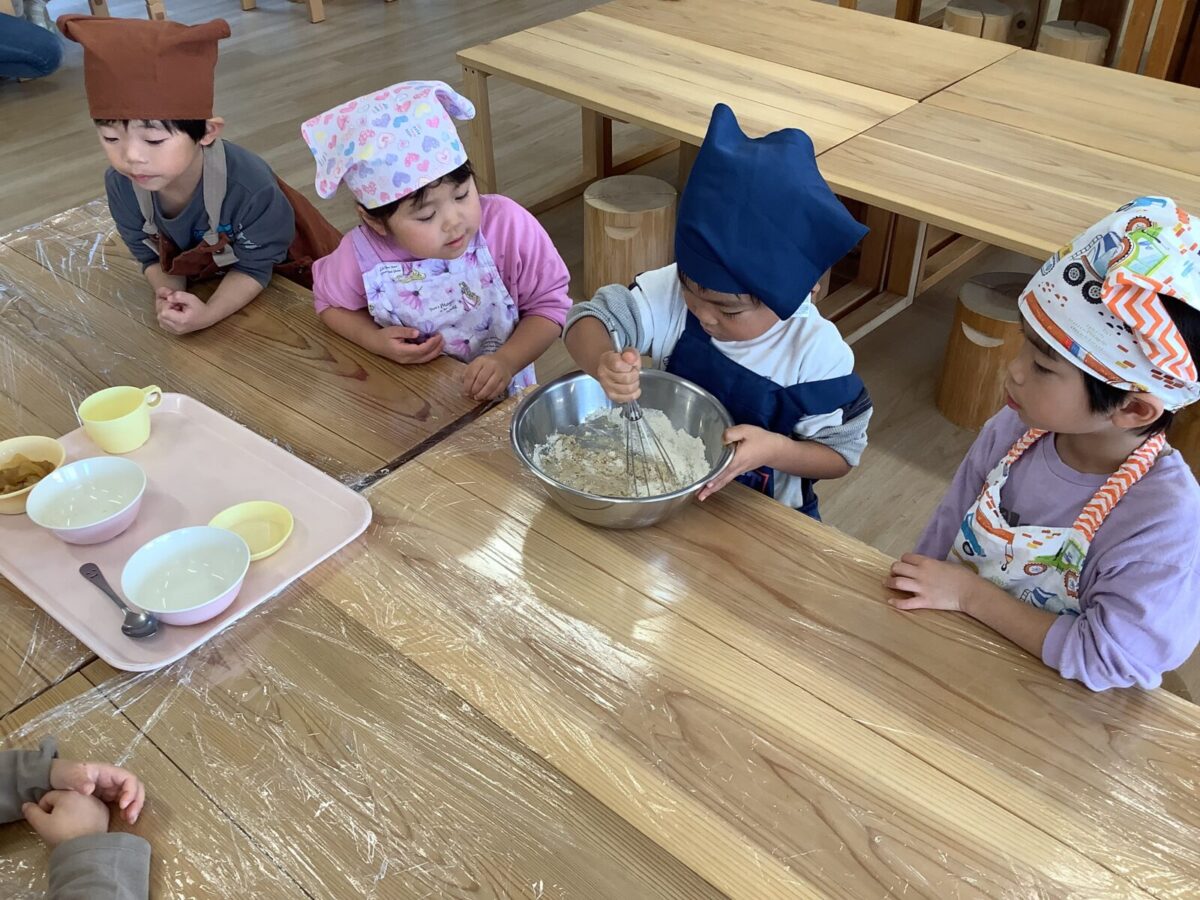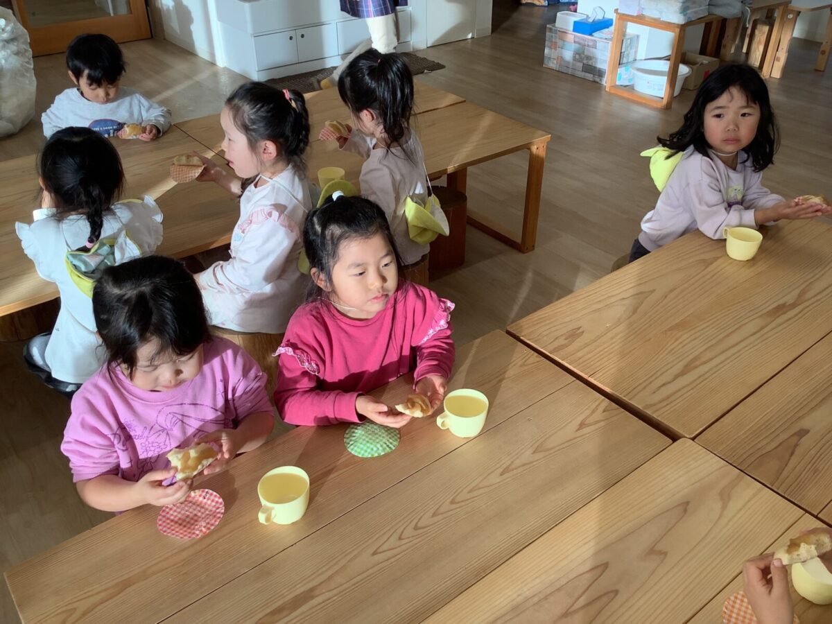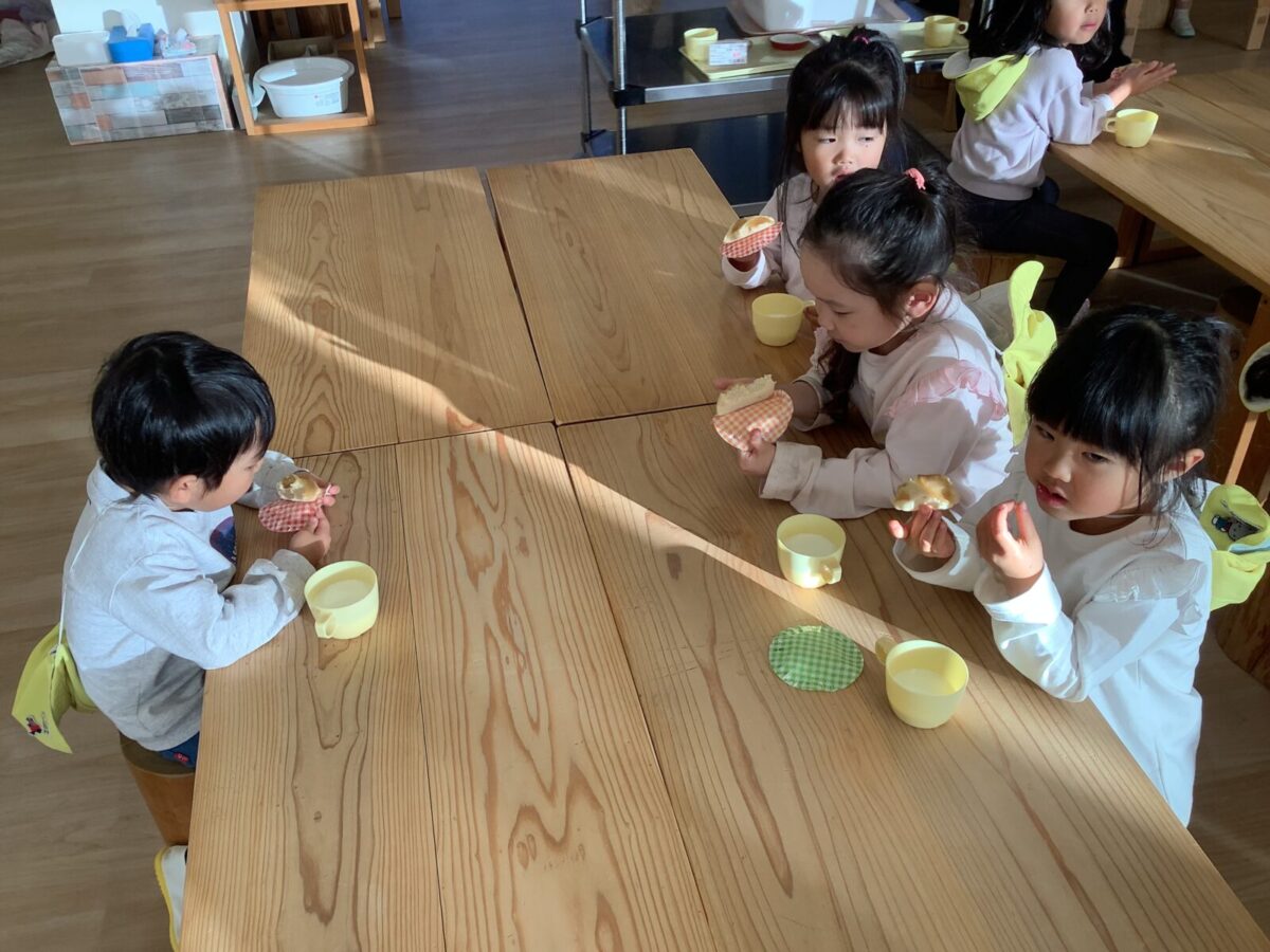 先月ではありますが、食育でりんご蒸しパン作りをしました。自分で作ったおやつはとっても美味しくて、「毎日これがいい!!」という子もいましたよ!