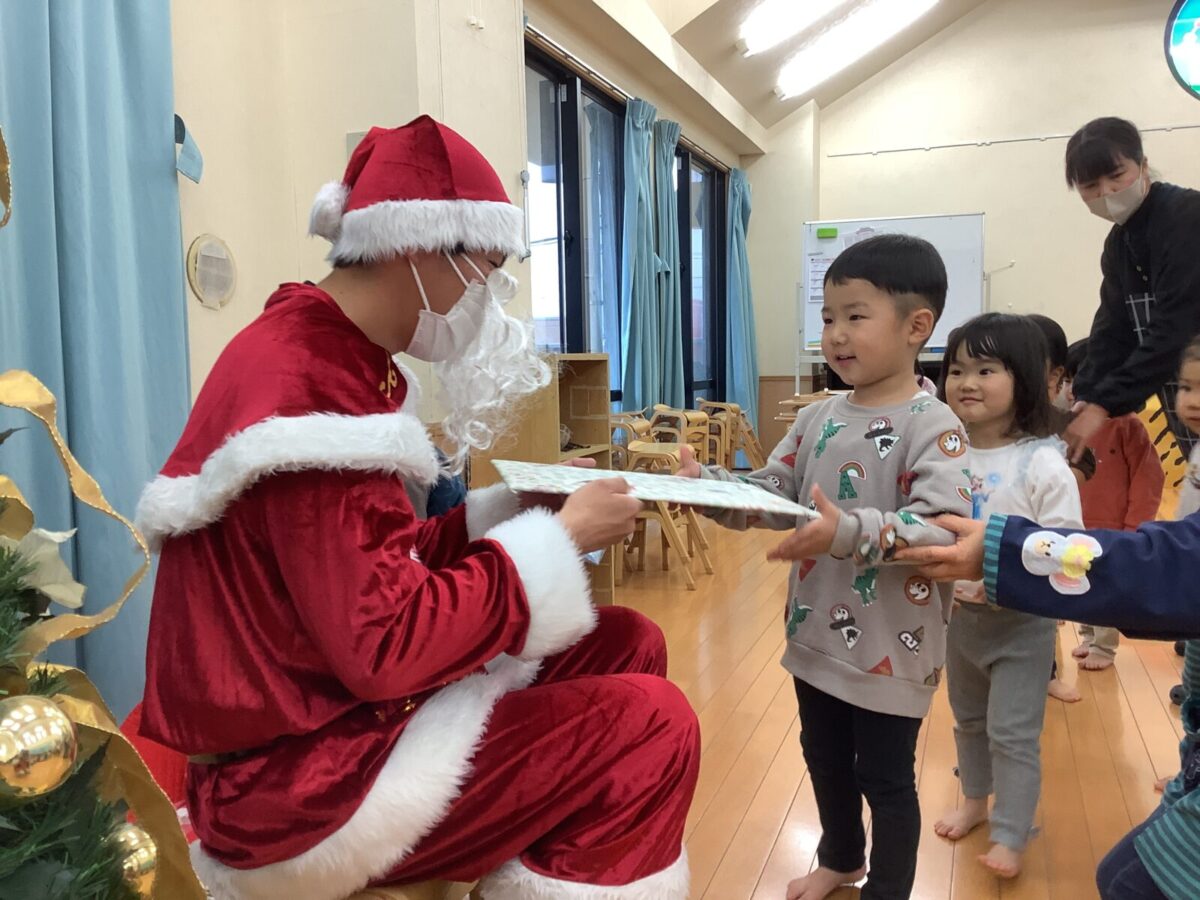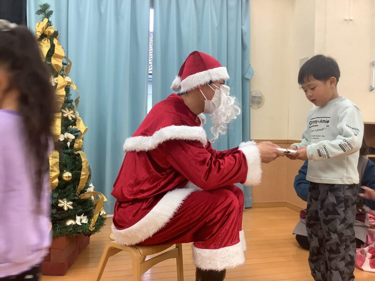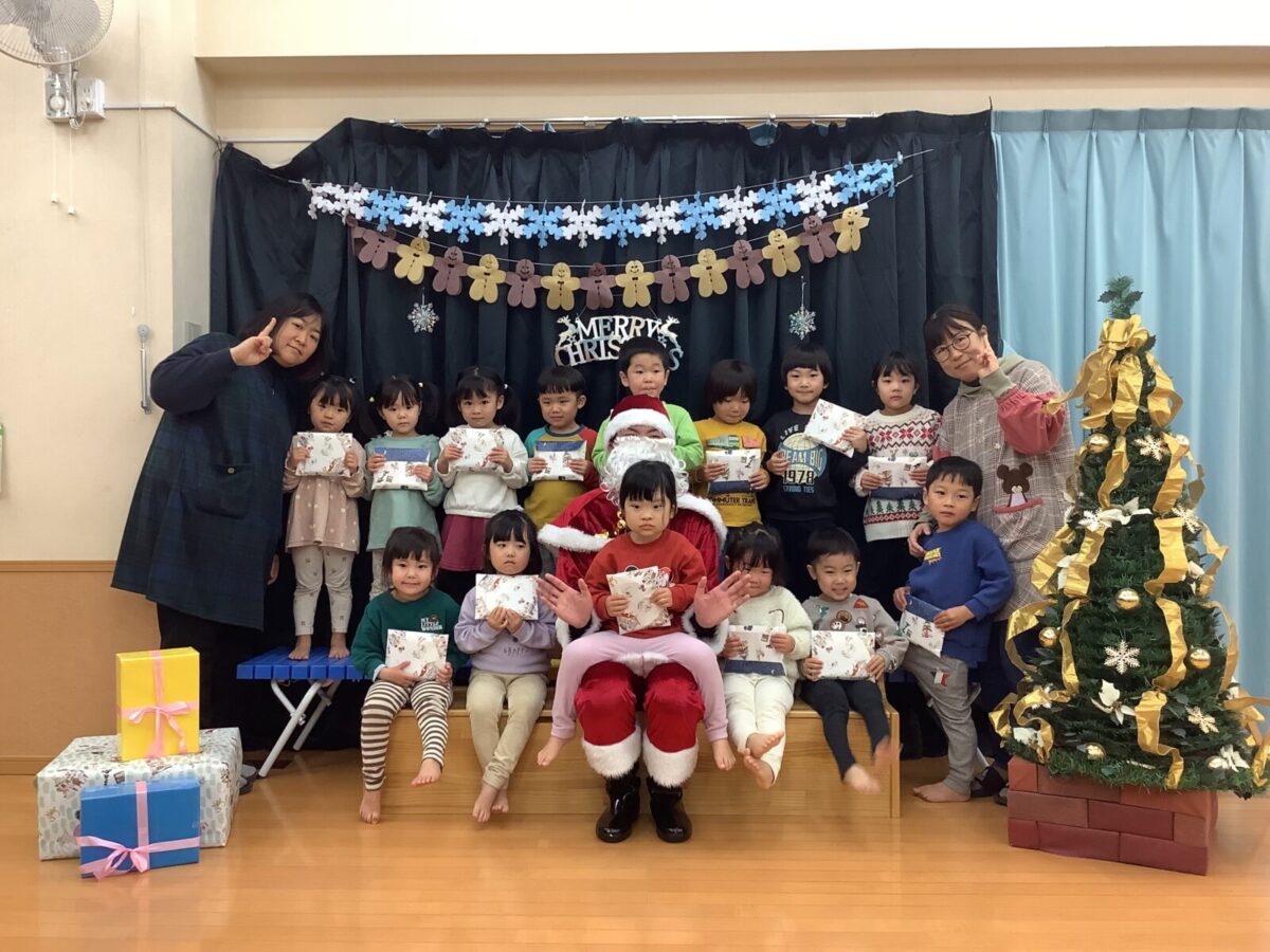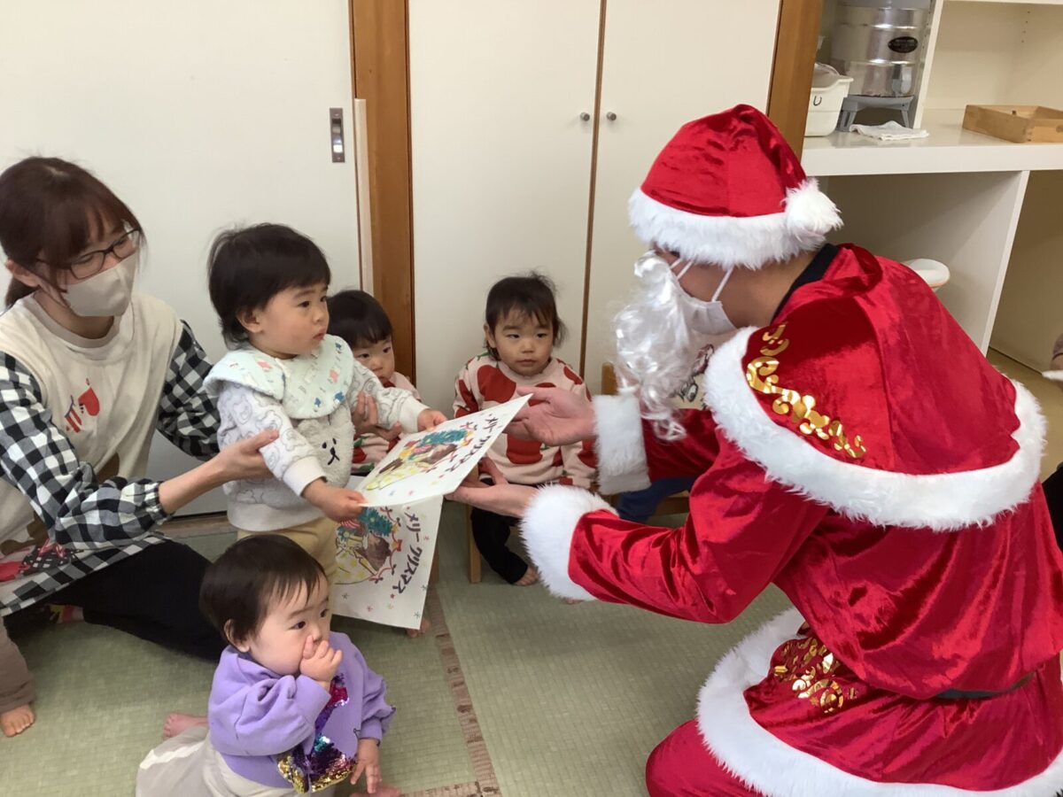 0、1歳児クラスは保育室にサンタさんが登場し、プレゼントをもらいました。初めは驚いて涙する子もいましたが、ハイタッチをしたりプレゼントをもらう中で少しずつ笑顔が増えていきましたよ♪