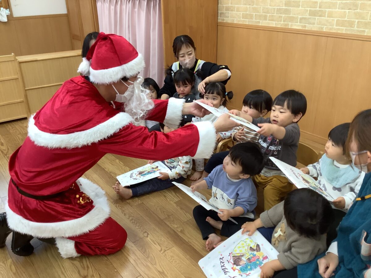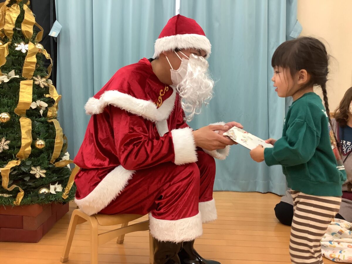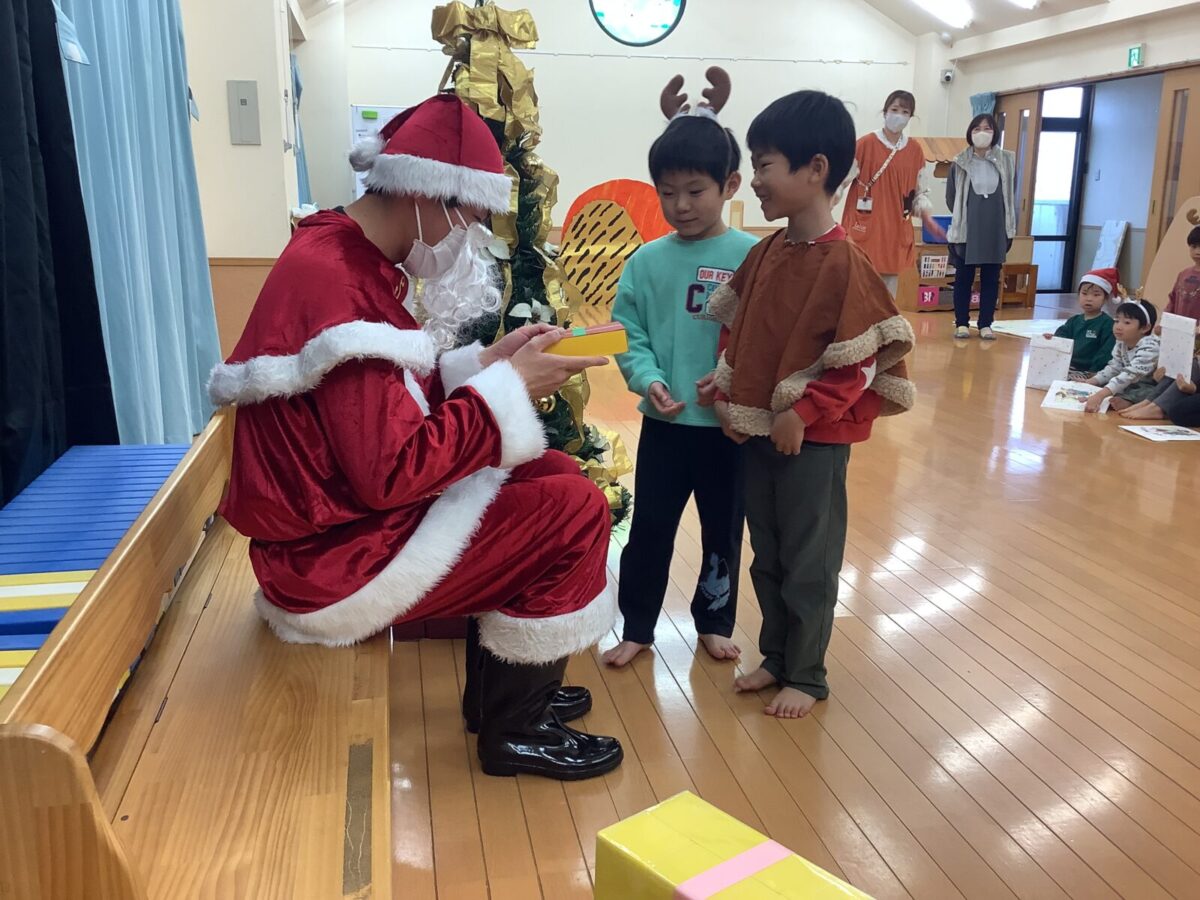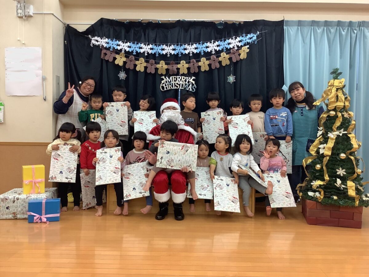 0、1歳児クラスは保育室にサンタさんが登場し、プレゼントをもらいました。初めは驚いて涙する子もいましたが、ハイタッチをしたりプレゼントをもらう中で少しずつ笑顔が増えていきましたよ♪
