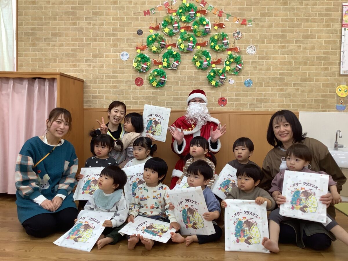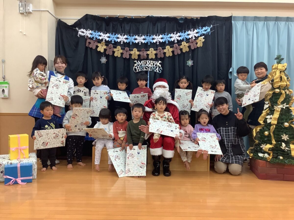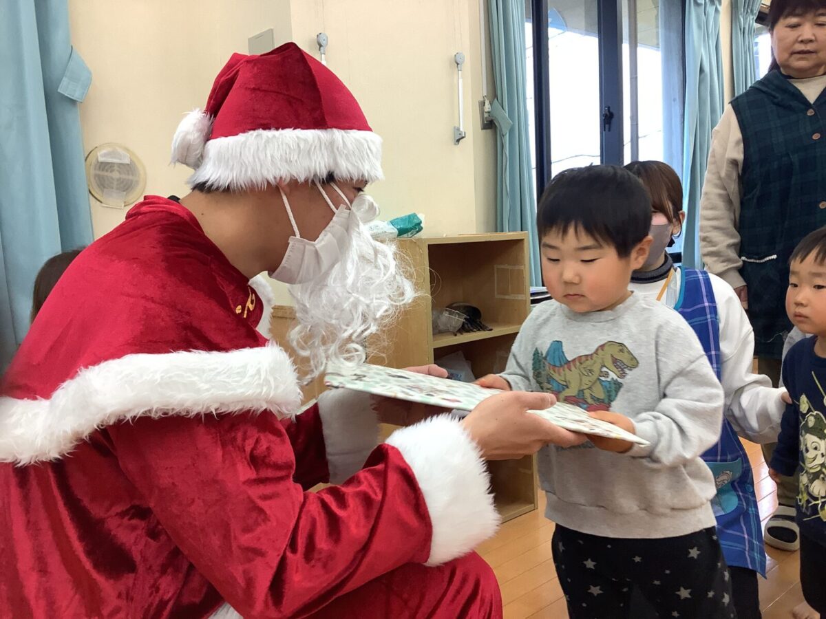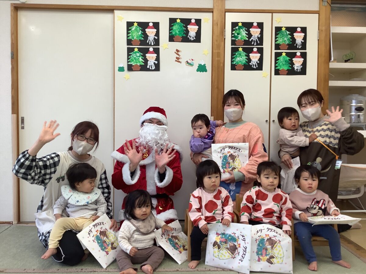 0、1歳児クラスは保育室にサンタさんが登場し、プレゼントをもらいました。初めは驚いて涙する子もいましたが、ハイタッチをしたりプレゼントをもらう中で少しずつ笑顔が増えていきましたよ♪