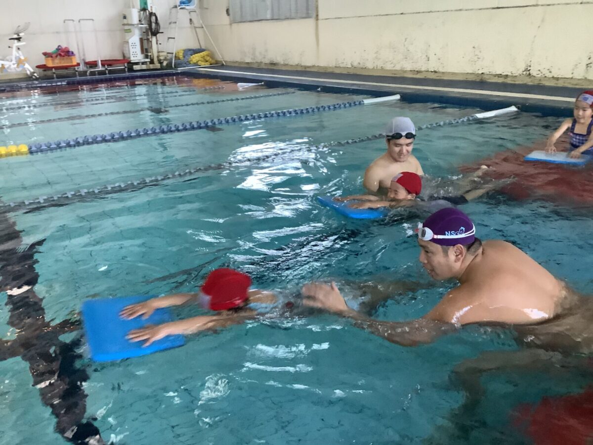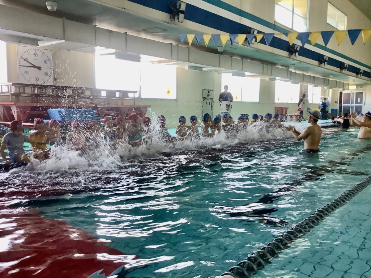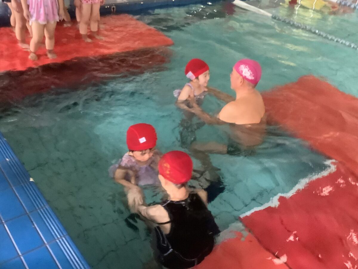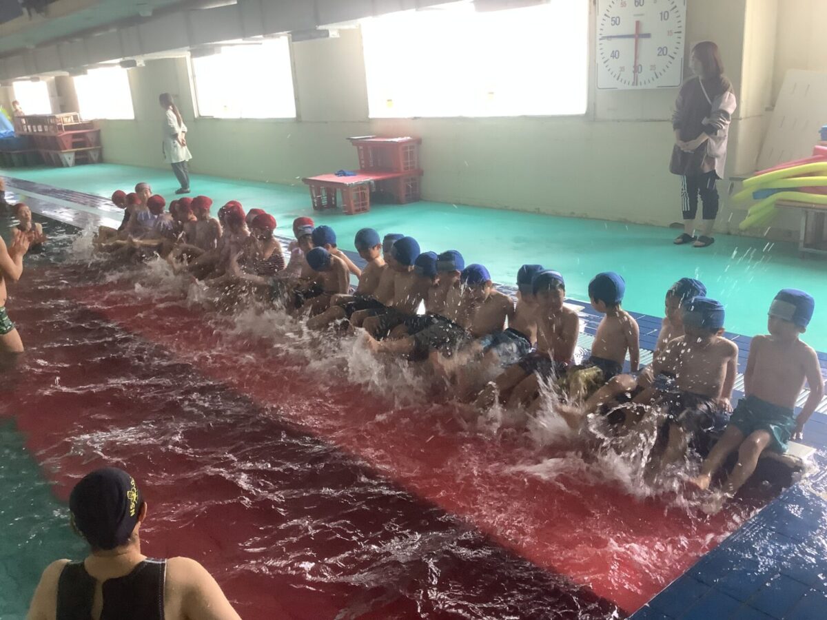 年中・年長は月に2回スイミングスクールへ行きスイミングに参加しています。初めは水に対して恐怖心を持つ子もいますが、台を使っての滑り台やカニ歩き等で楽しく水に慣れ、気づけばみんなスイミングが大好きになっています。
