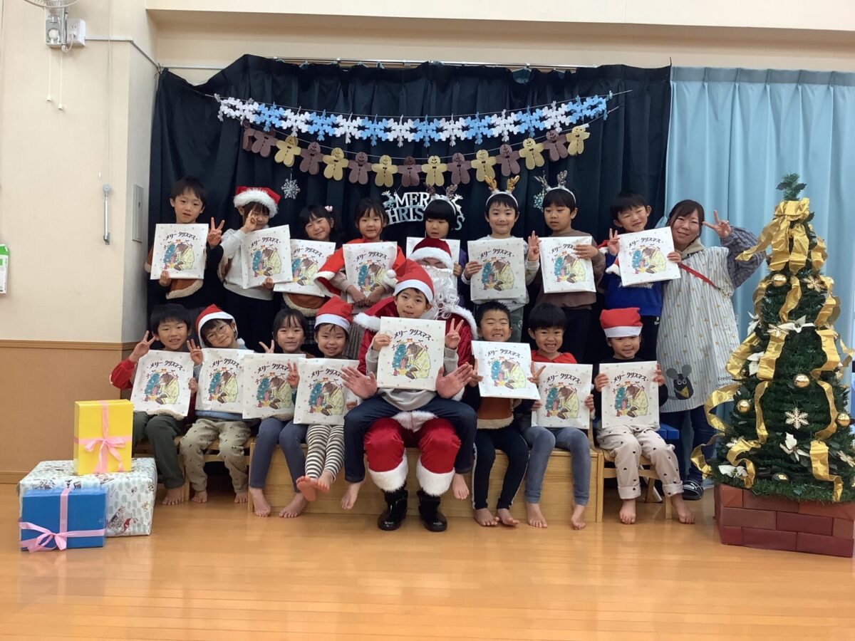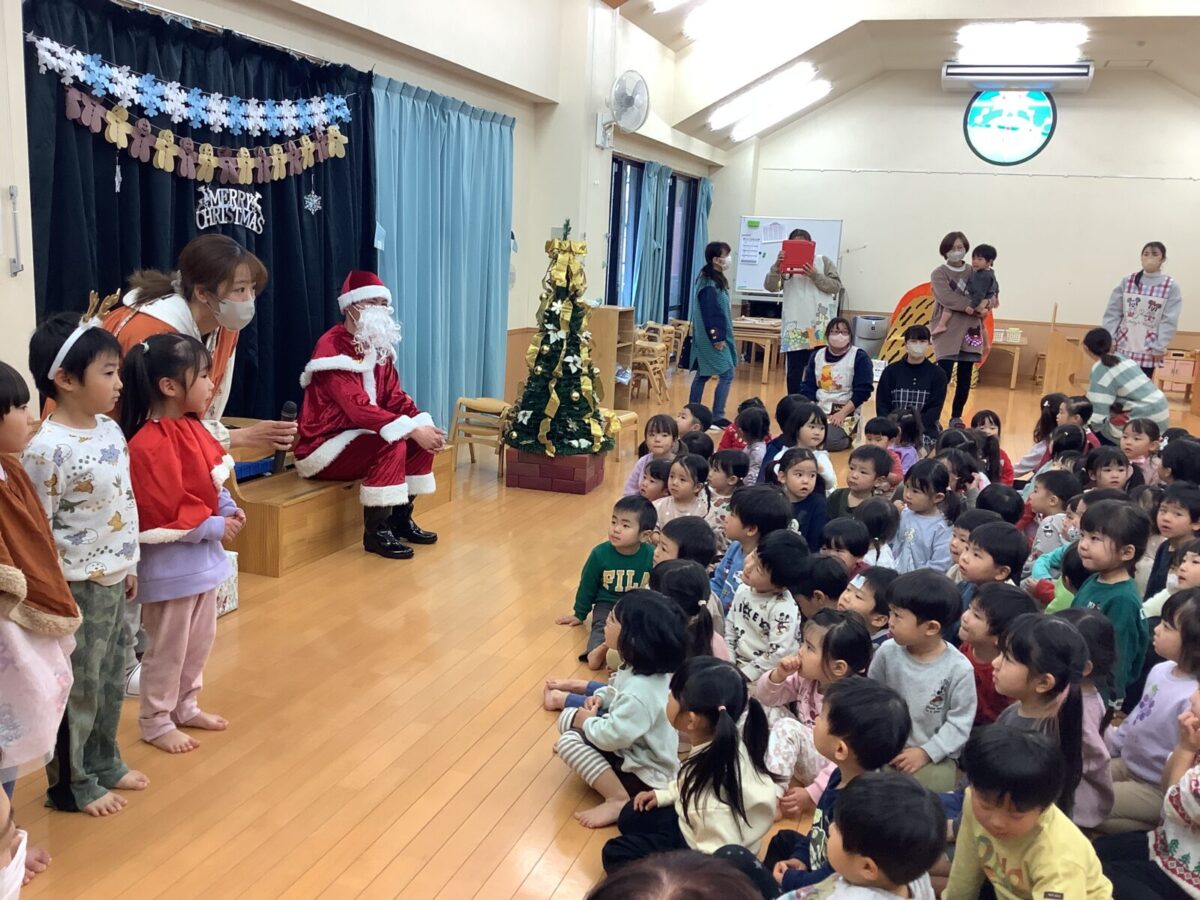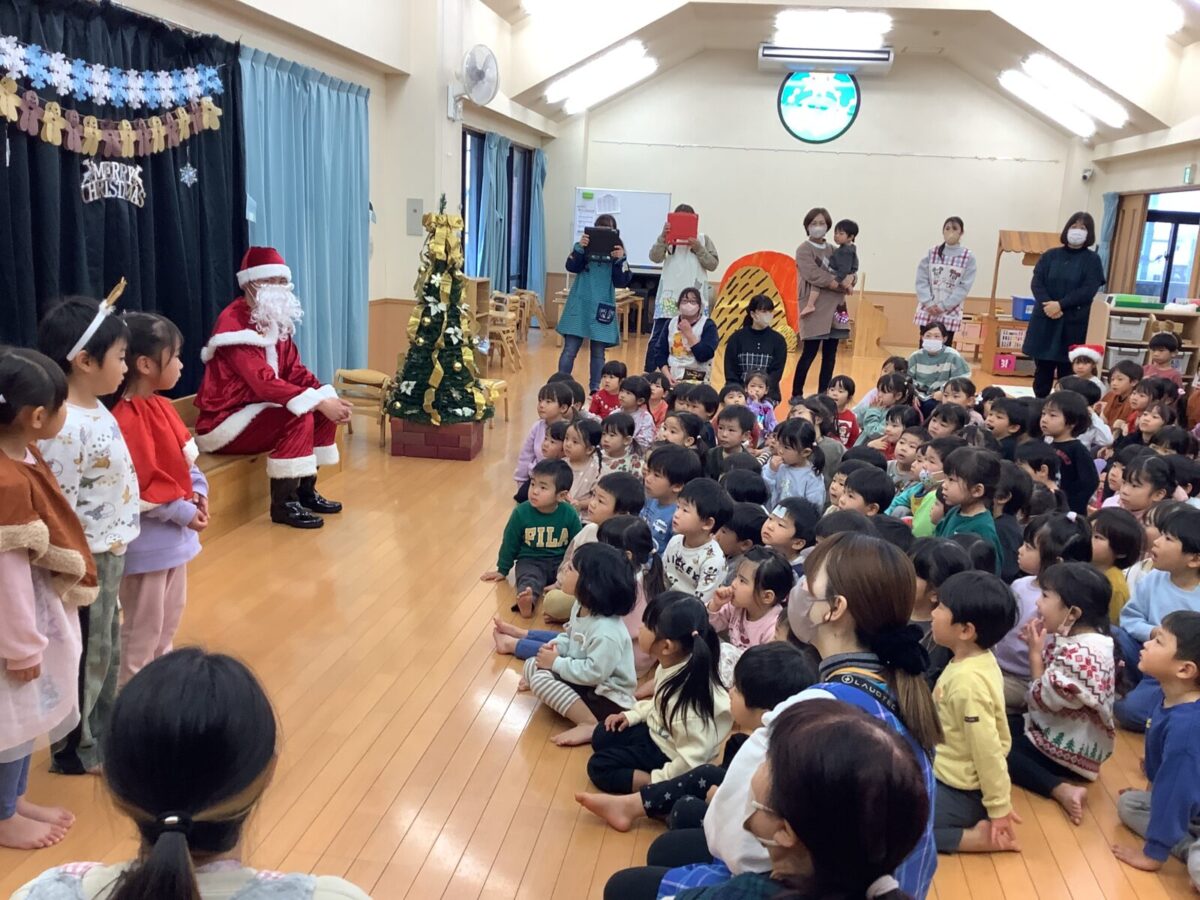 2歳児~5歳児は、ホールに集まってクリスマス会に参加しました。サンタさんと一緒に歌ったり質問をしたりと楽しい時間を過ごし、最後には一緒に記念撮影をしました!