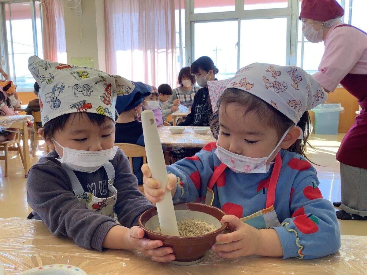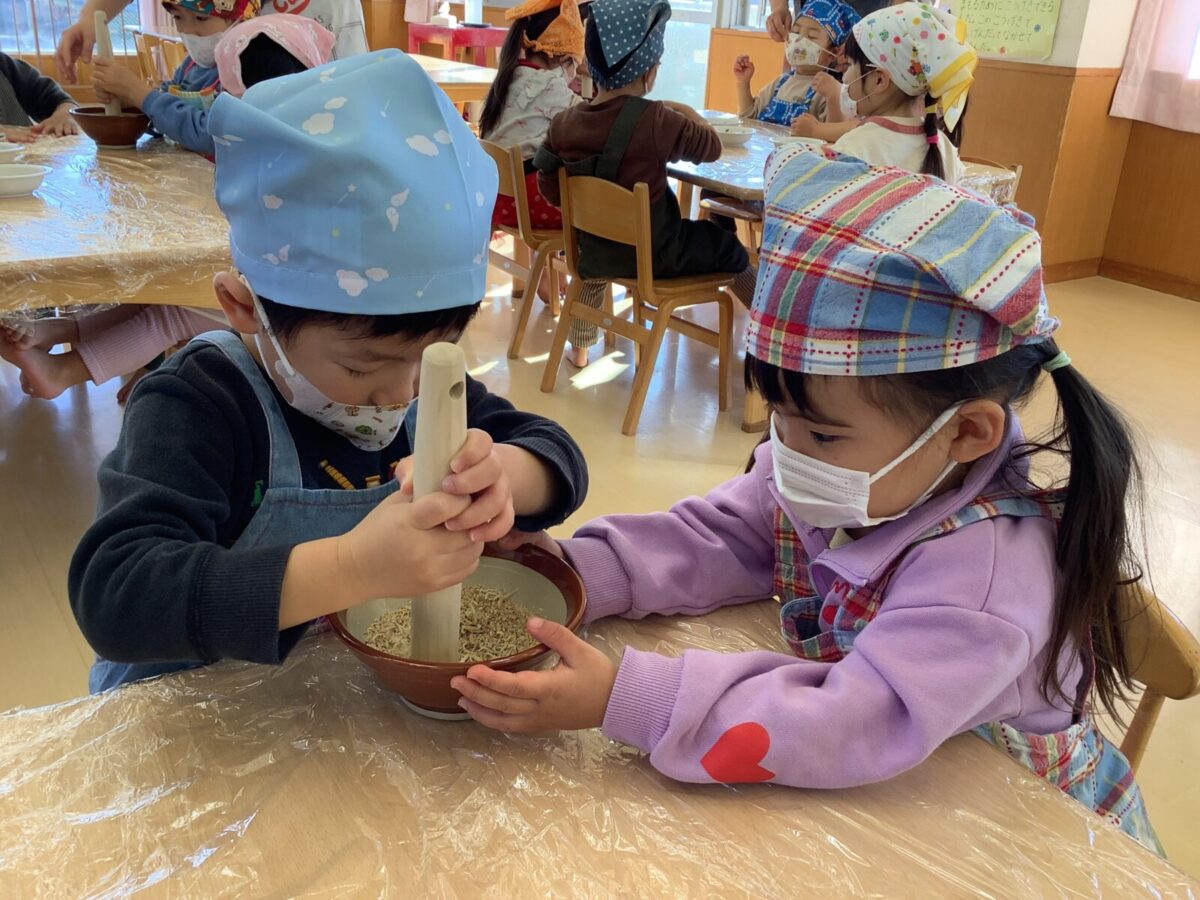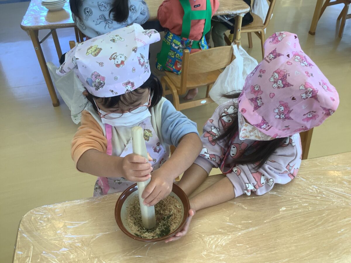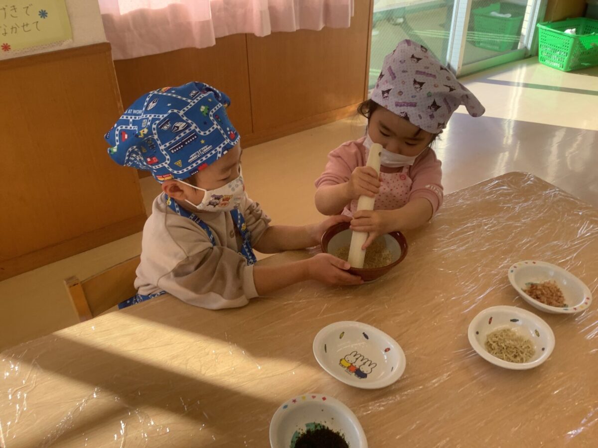 つき組さんがふりかけ作りの食育に参加しました!すり鉢を押さえる子と材料をすりつぶす子に分かれ、2人1組で協力してふりかけを作りました。匂いや形の変化を楽しみ、給食で食べてみると「おいしいね!」といつもよりたくさん食べられたつき組さんでした♪