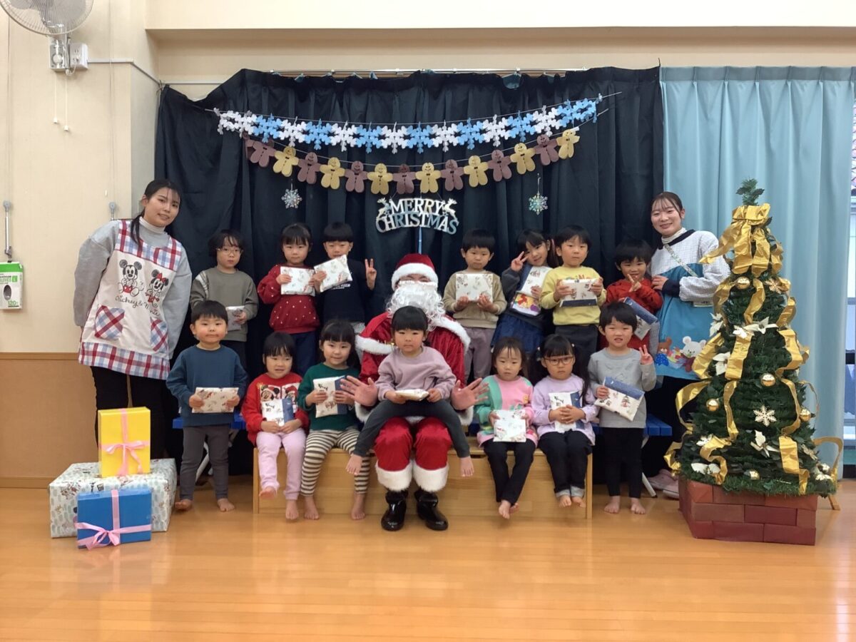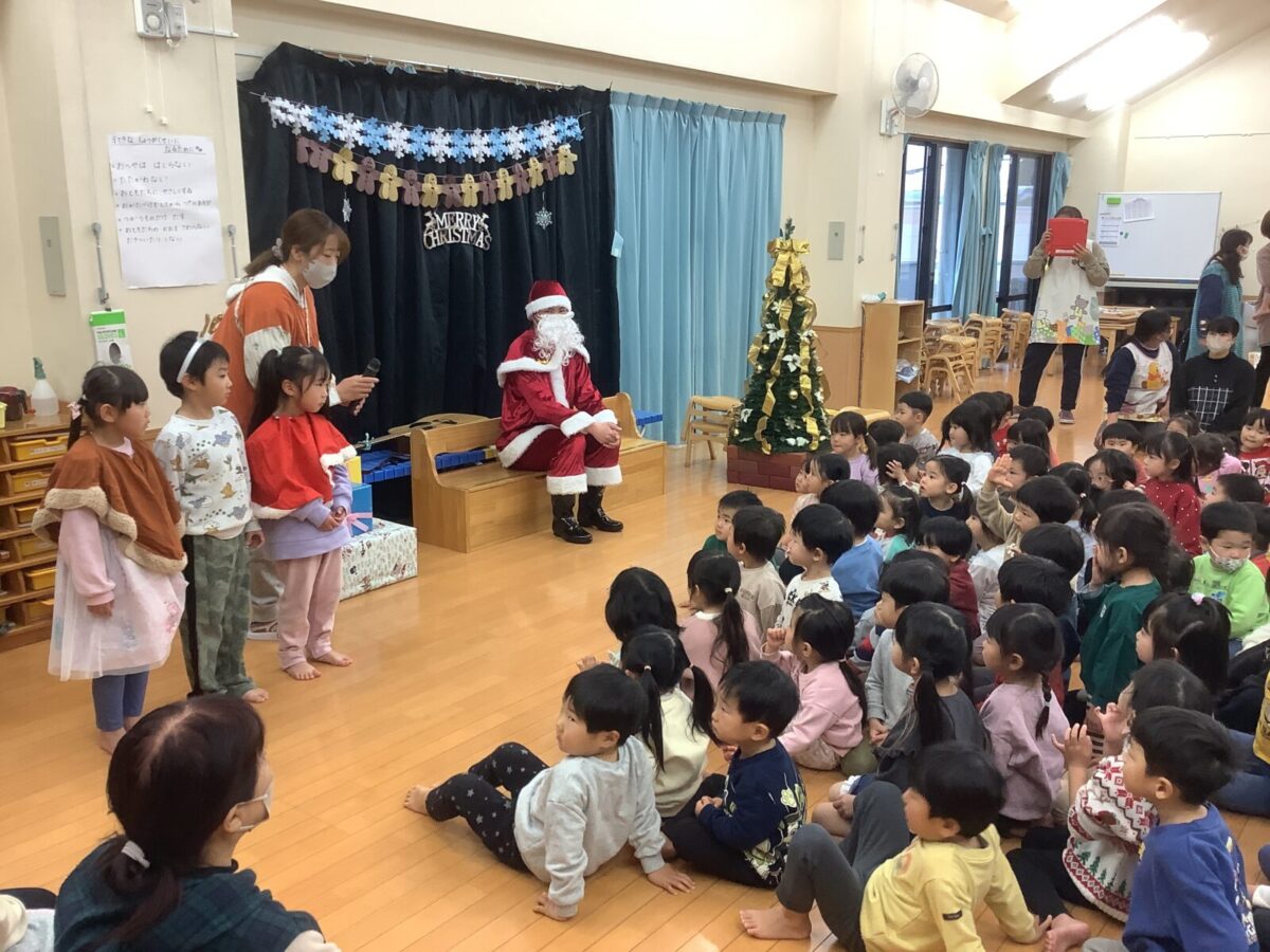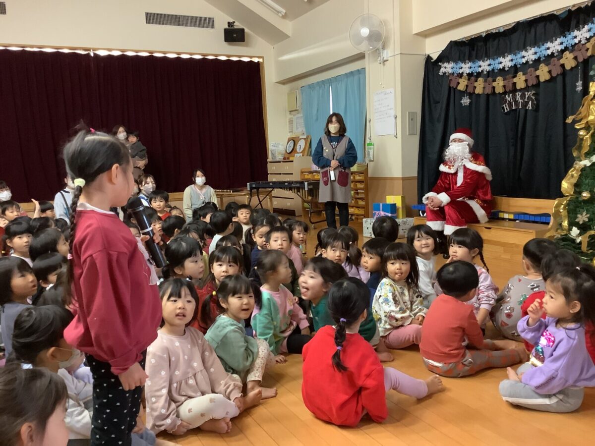 2歳児~5歳児は、ホールに集まってクリスマス会に参加しました。サンタさんと一緒に歌ったり質問をしたりと楽しい時間を過ごし、最後には一緒に記念撮影をしました!