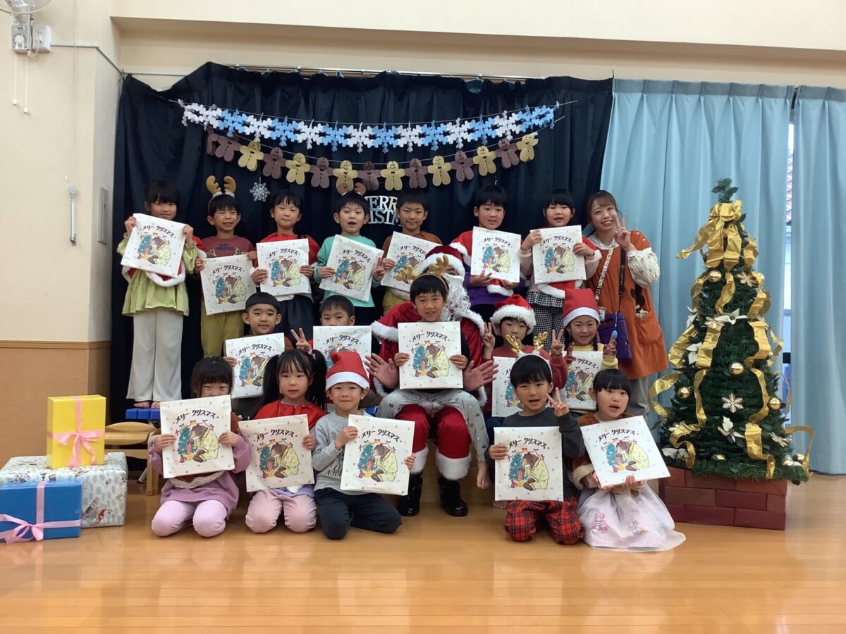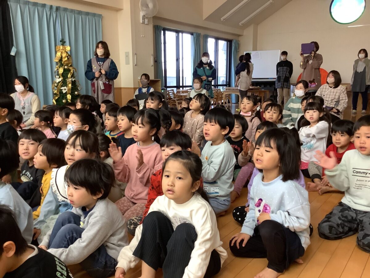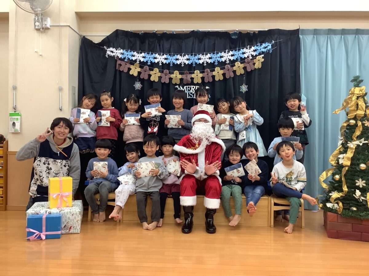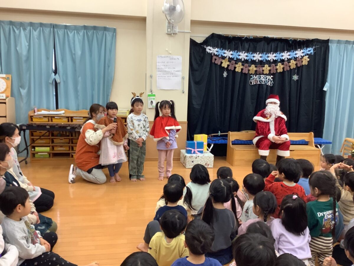 2歳児~5歳児は、ホールに集まってクリスマス会に参加しました。サンタさんと一緒に歌ったり質問をしたりと楽しい時間を過ごし、最後には一緒に記念撮影をしました!