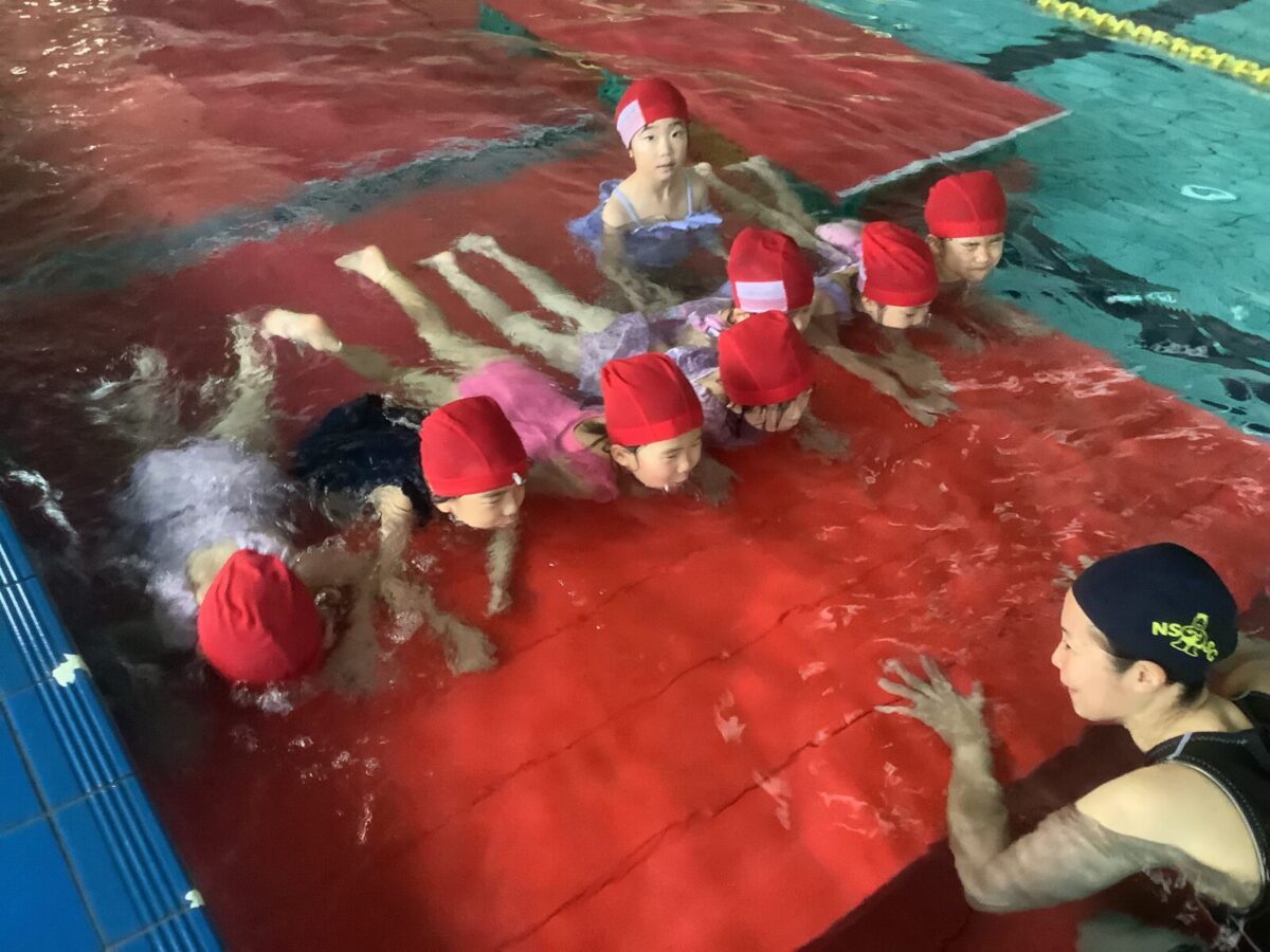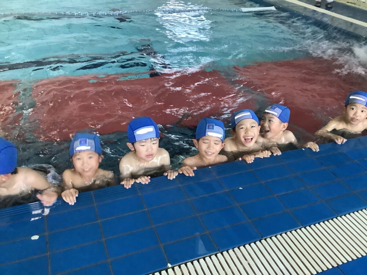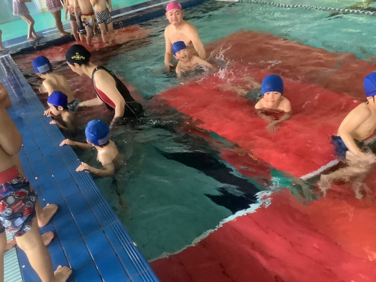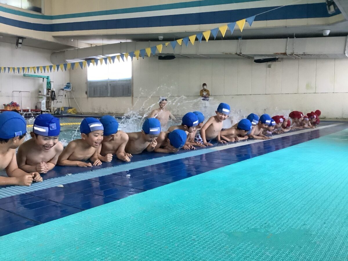 年中・年長は月に2回スイミングスクールへ行きスイミングに参加しています。初めは水に対して恐怖心を持つ子もいますが、台を使っての滑り台やカニ歩き等で楽しく水に慣れ、気づけばみんなスイミングが大好きになっています。