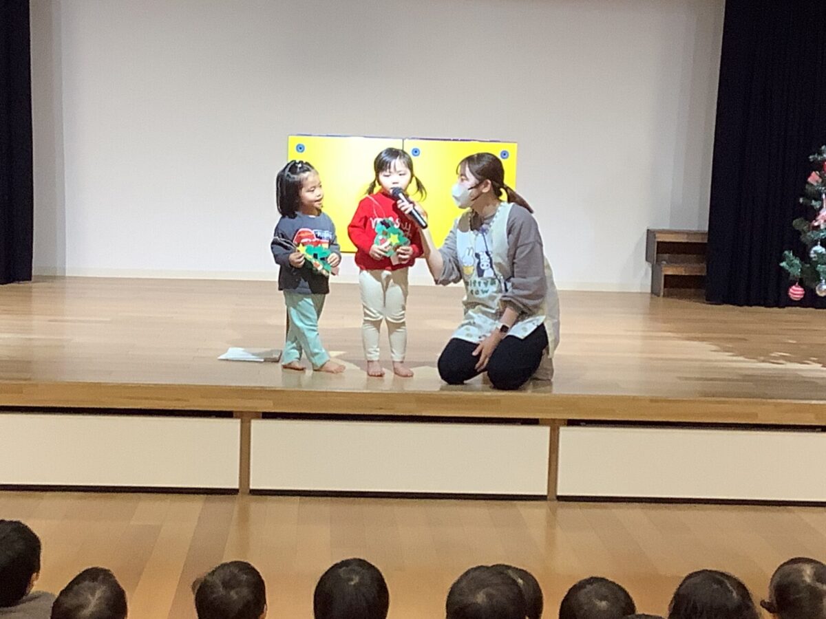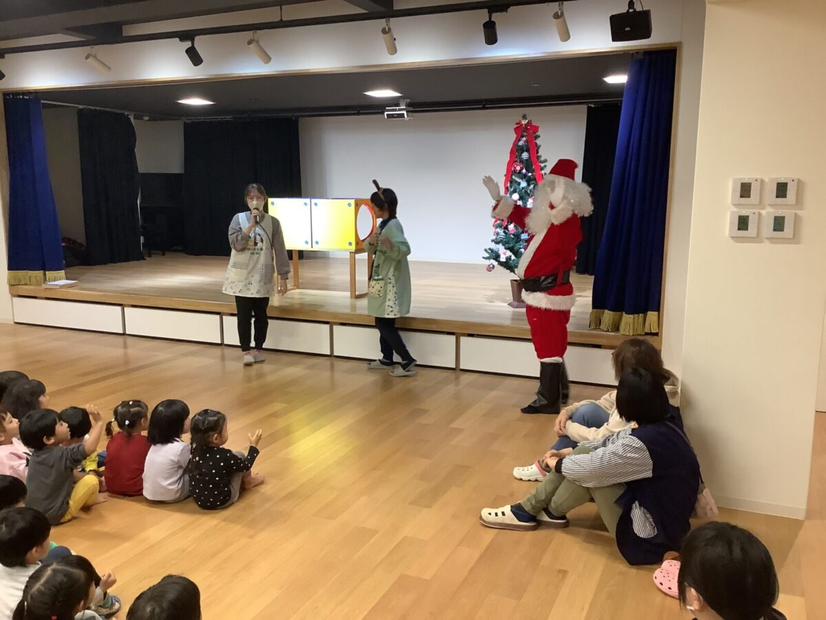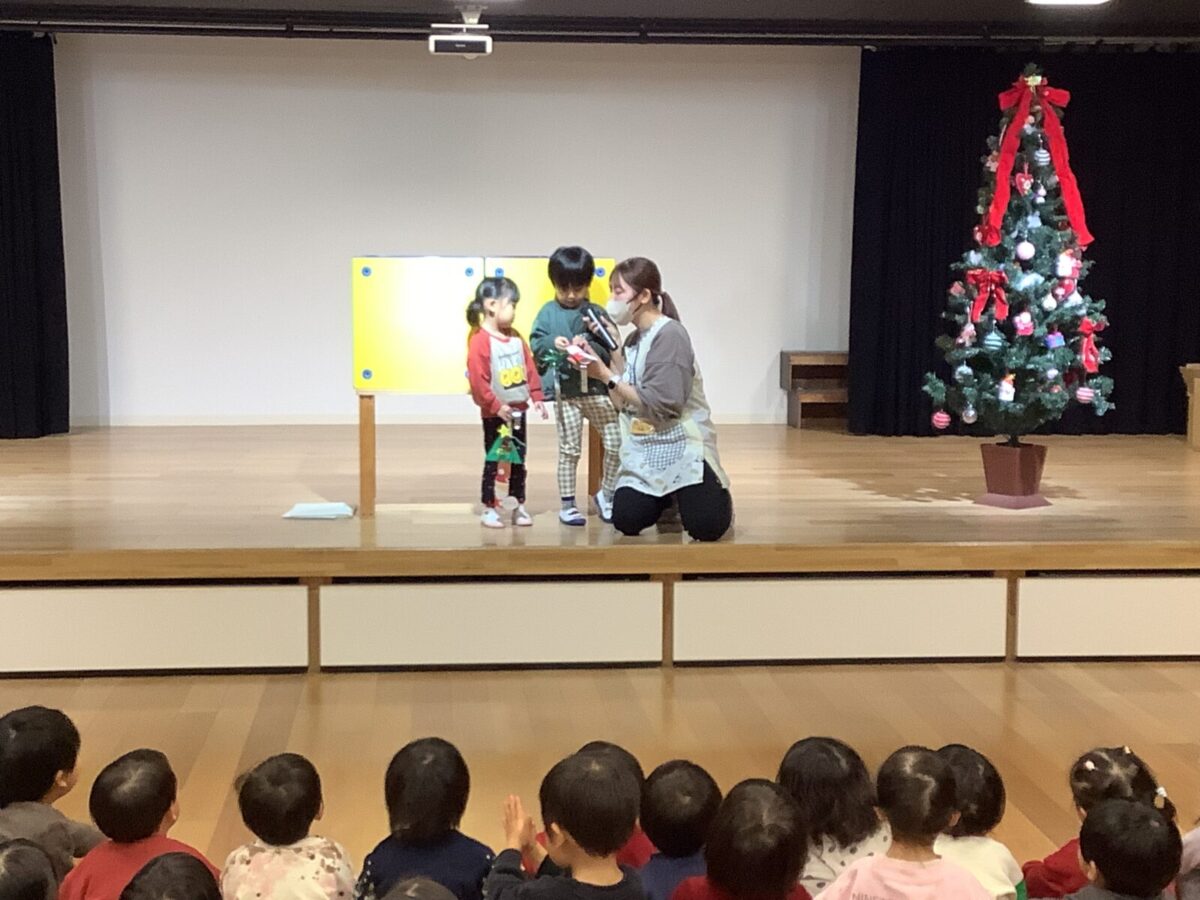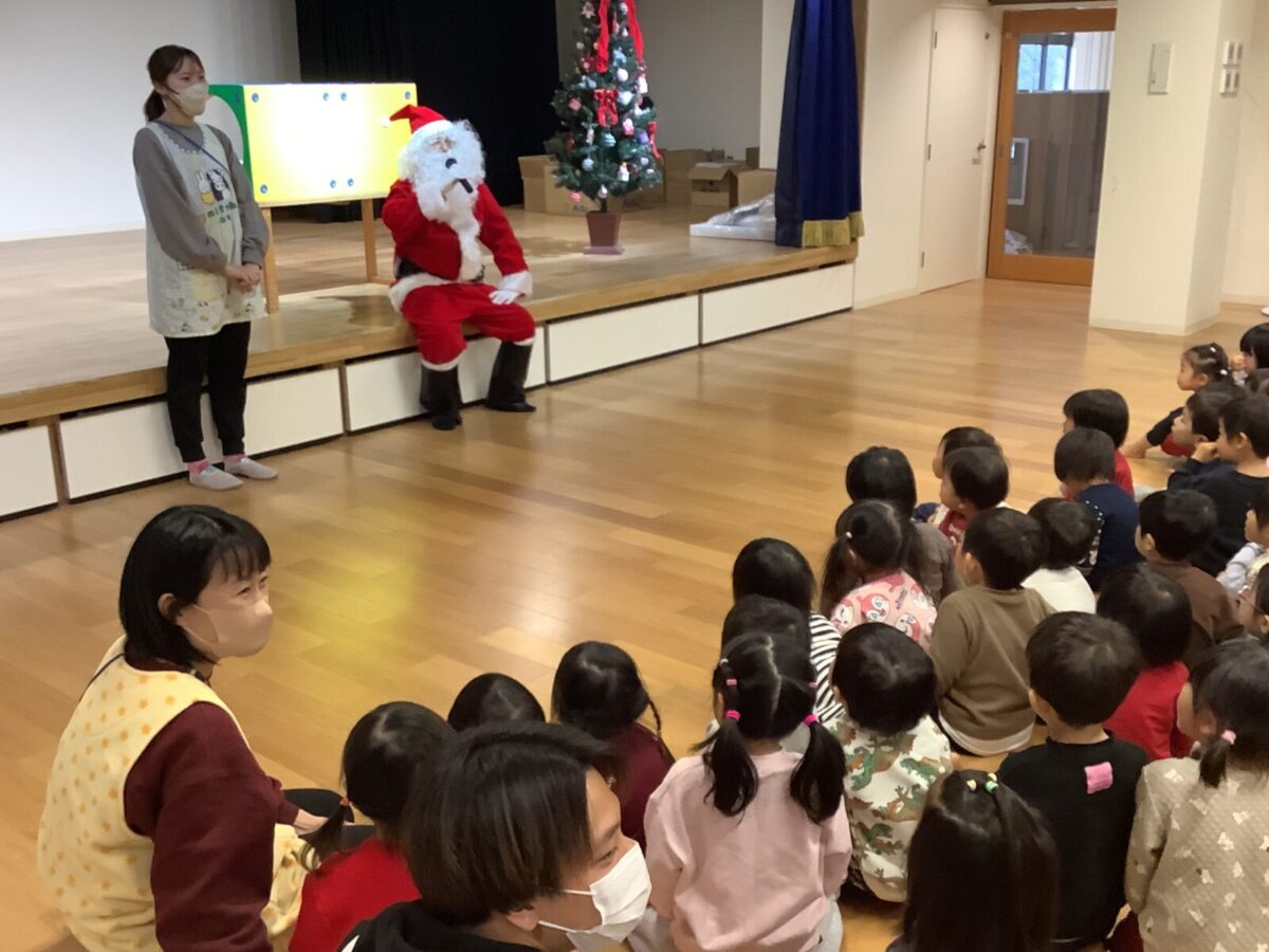 子ども達が楽しみにしていたクリスマス会をしました♪クリスマス会までに各クラスで製作をし、サンタさんがくるのを毎日楽しみにしていました。当日はホールに集まり歌を歌ったり、先生達の出し物を見たりサンタさんが登場するのを今か今かと待っていましたよ♪