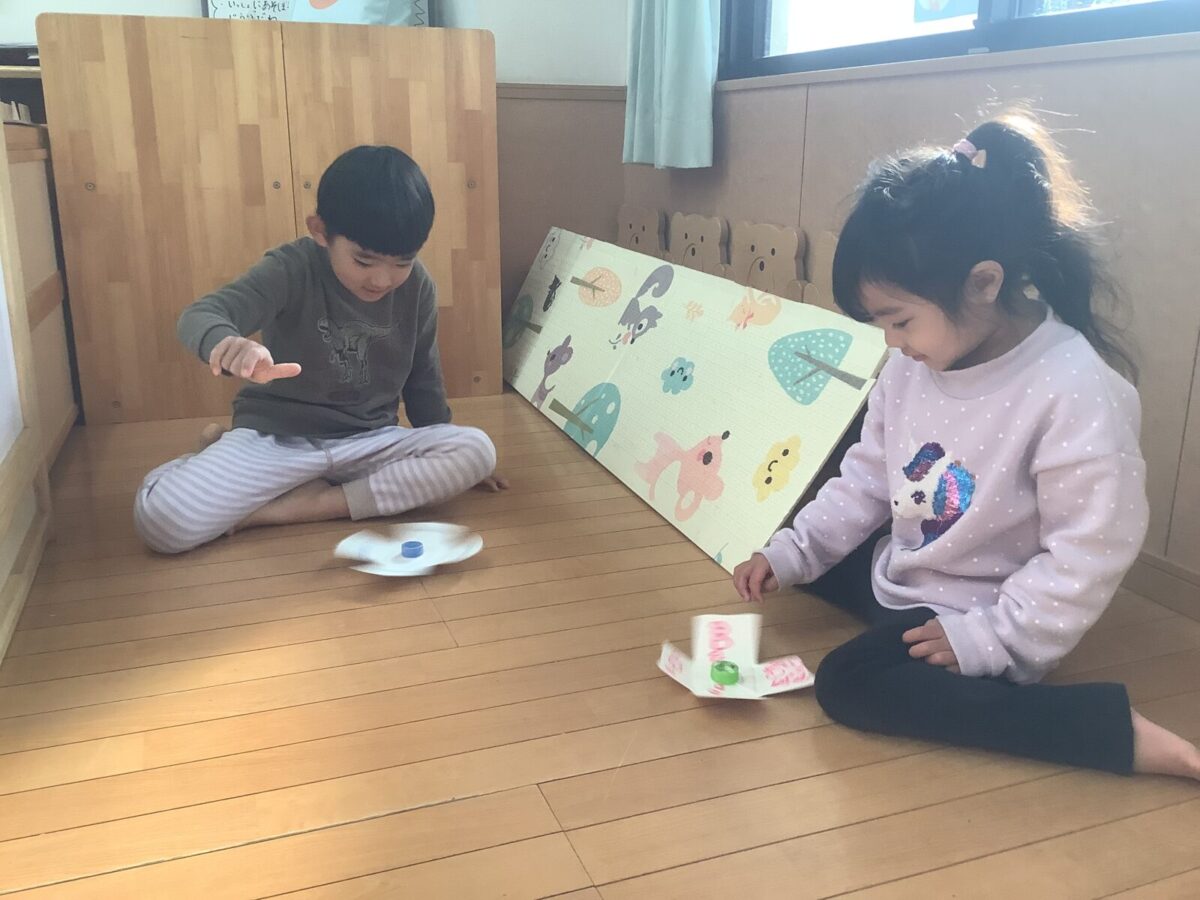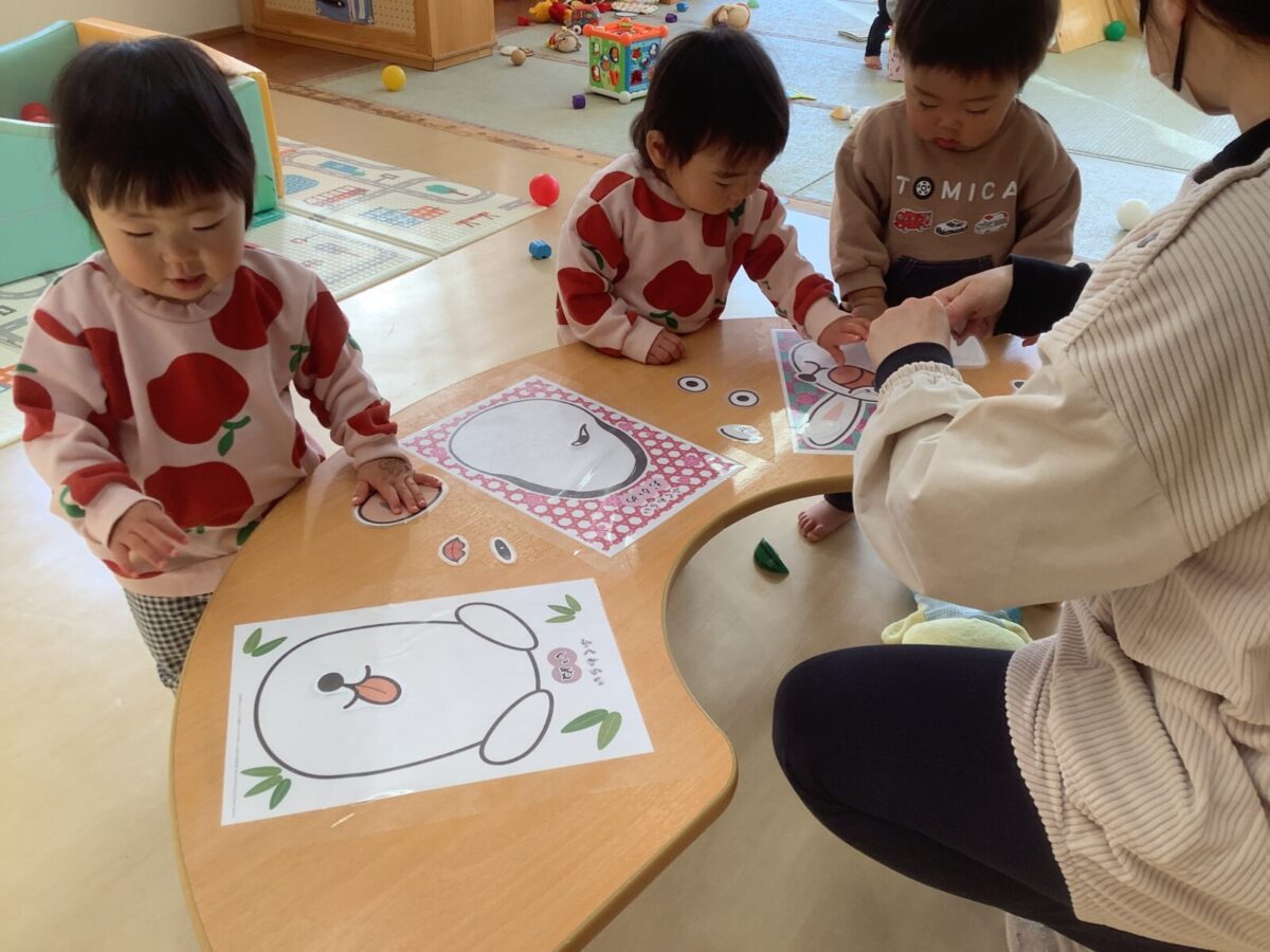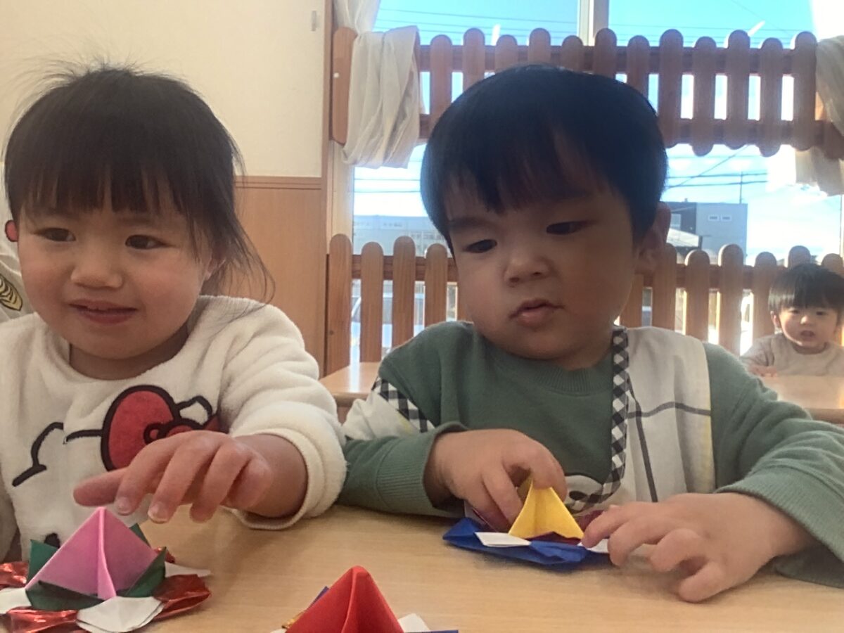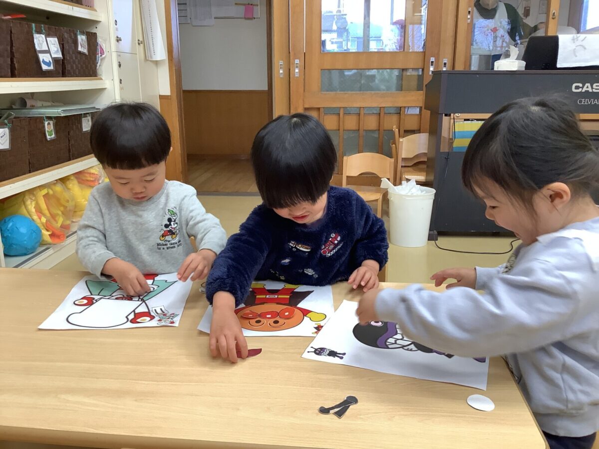 未満児は正月遊びを楽しみました。普段なかなか体験できないコマ遊びや福笑い、凧揚げをしたのですが「これやりたい!」「どうにやるの?」と興味津々の子ども達でした。