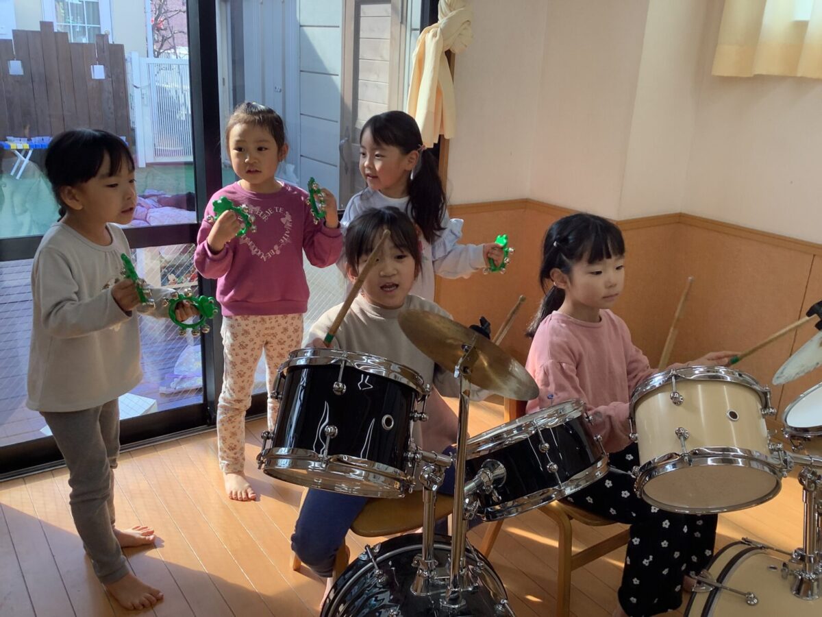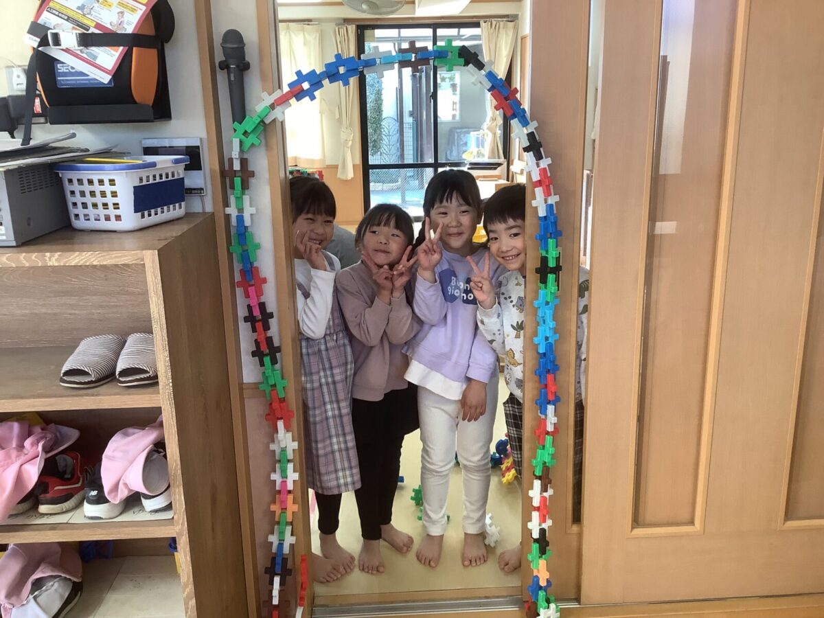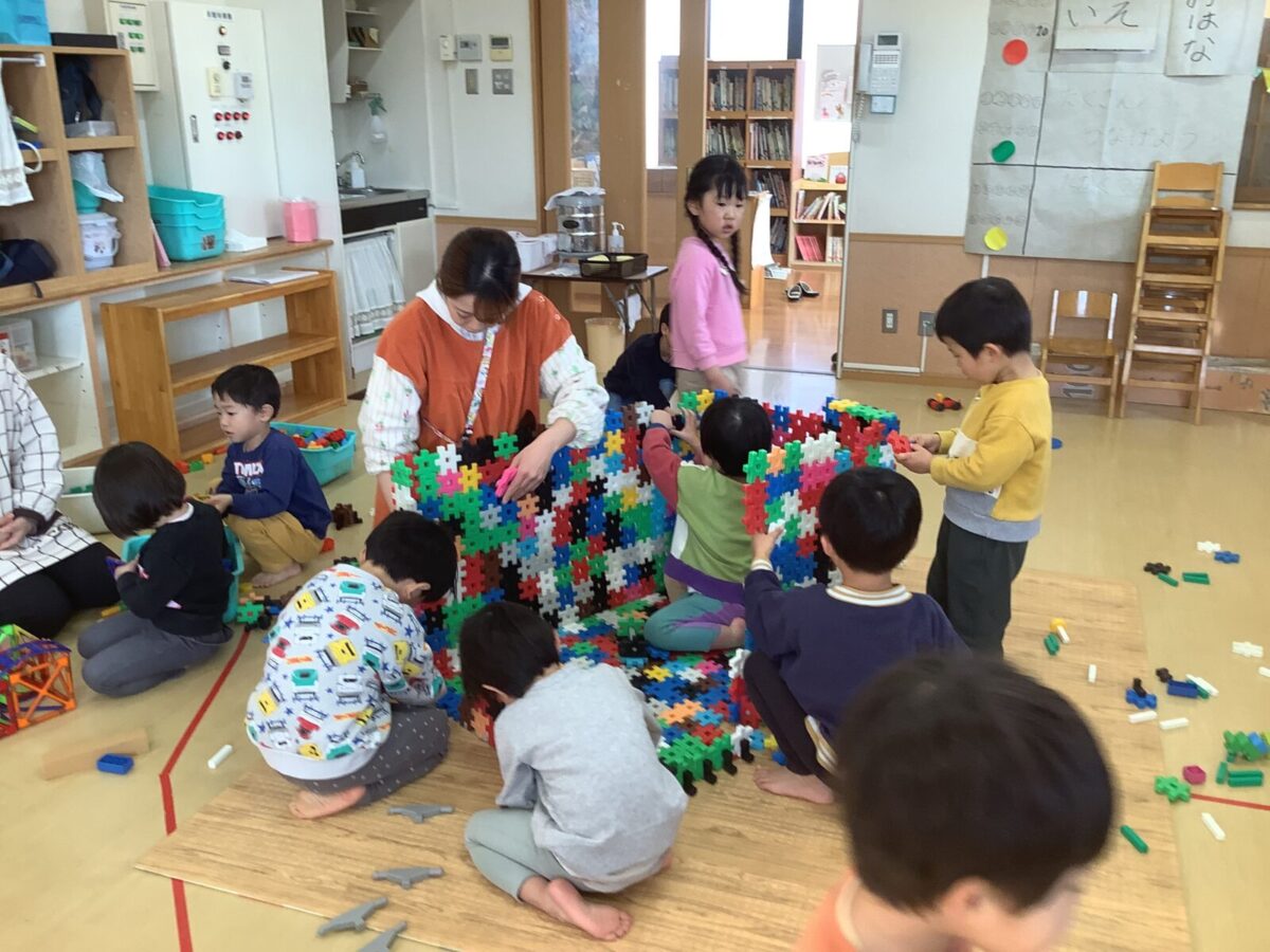 にこにこデーとは、異年齢での関わりの中で、自分の興味を大切にしながらゆったり好きな遊びを楽しむ日のことです。今回のにこにこデーは3日間にわたり開催し、各クラスに「戸外」「ブロック」「制作」「おままごと」「楽器」のコーナーを設け、じっくり遊びたい子は室内へ、体を動かして遊びたい子は戸外遊びへと、思い思いの遊びを選び楽しんでました。