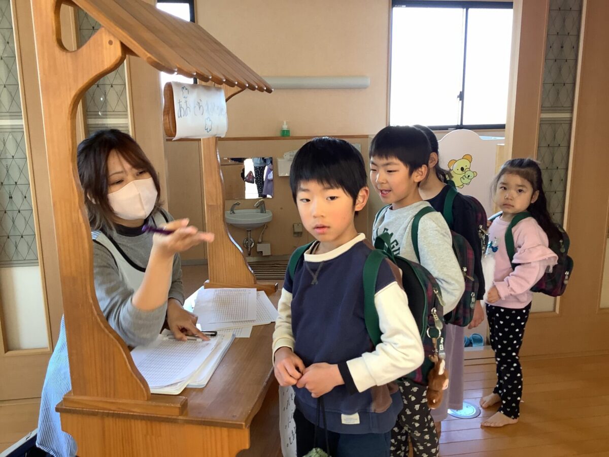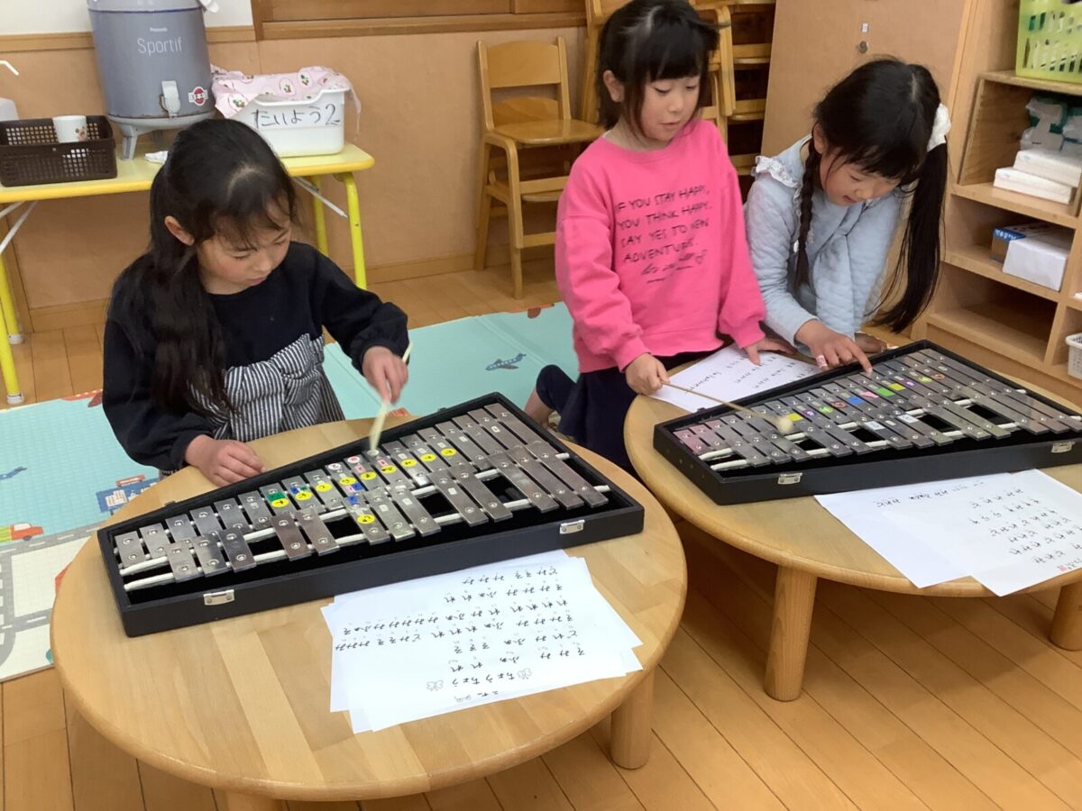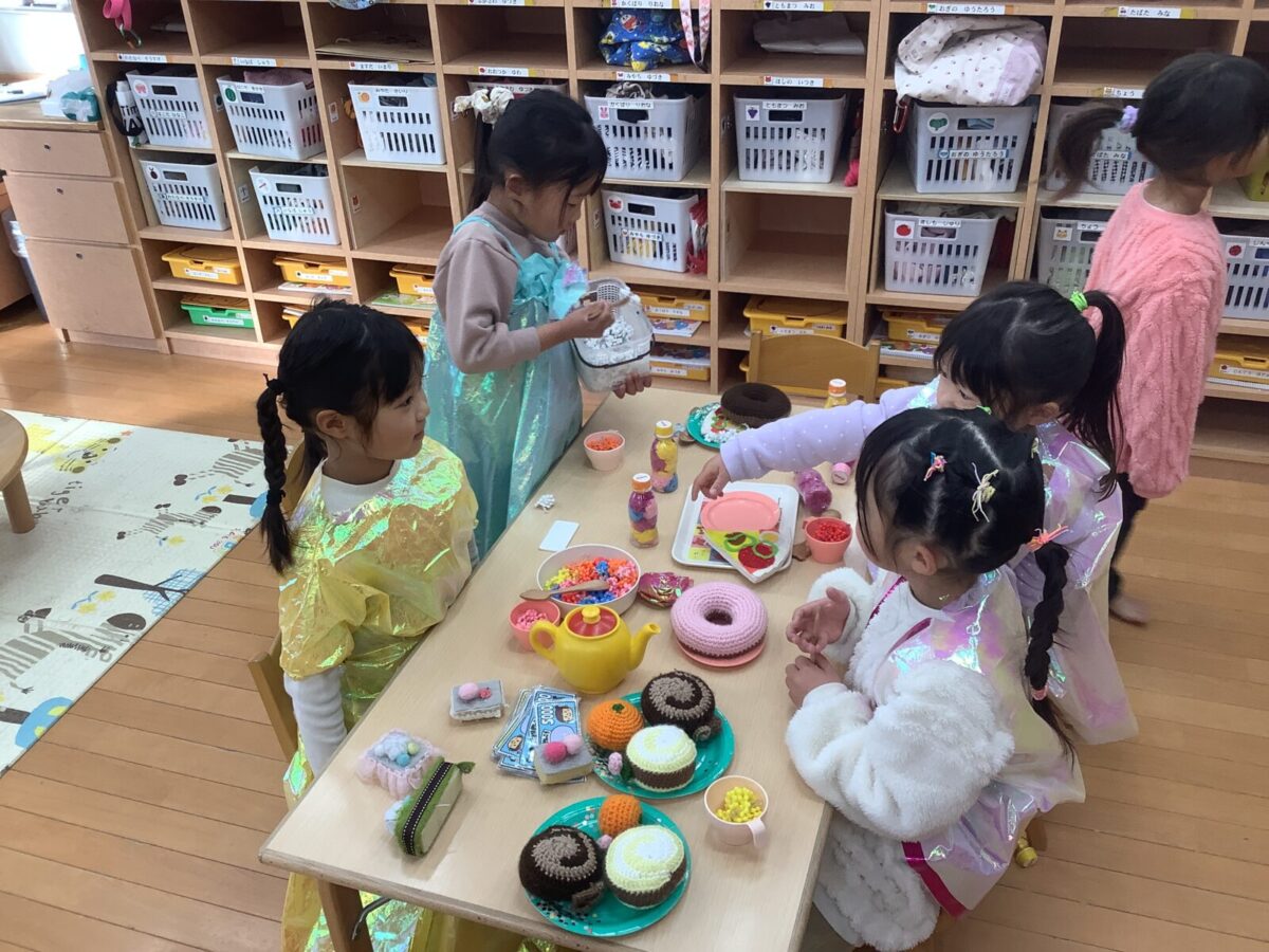 にこにこデーとは、異年齢での関わりの中で、自分の興味を大切にしながらゆったり好きな遊びを楽しむ日のことです。今回のにこにこデーは3日間にわたり開催し、各クラスに「戸外」「ブロック」「制作」「おままごと」「楽器」のコーナーを設け、じっくり遊びたい子は室内へ、体を動かして遊びたい子は戸外遊びへと、思い思いの遊びを選び楽しんでました。