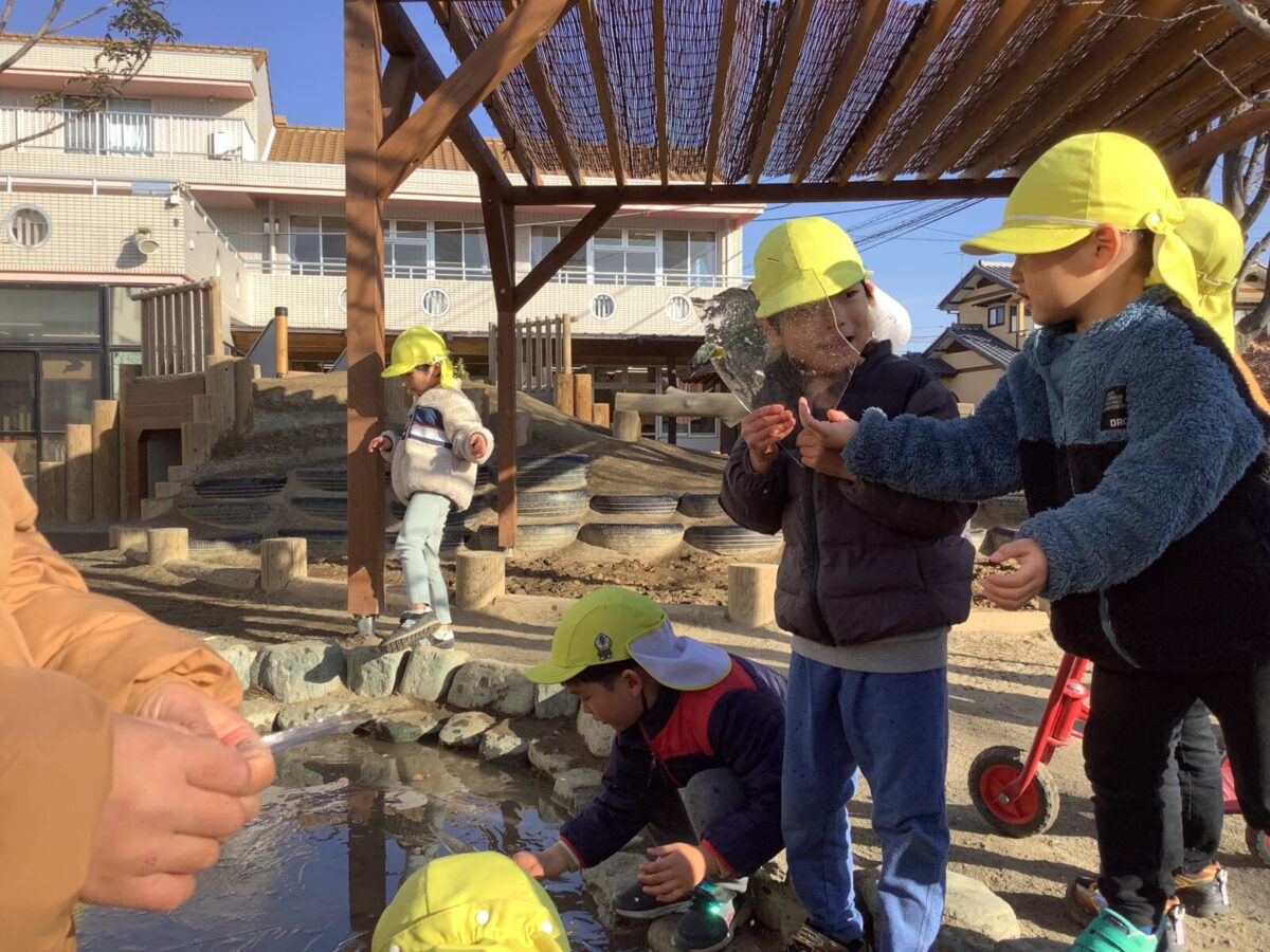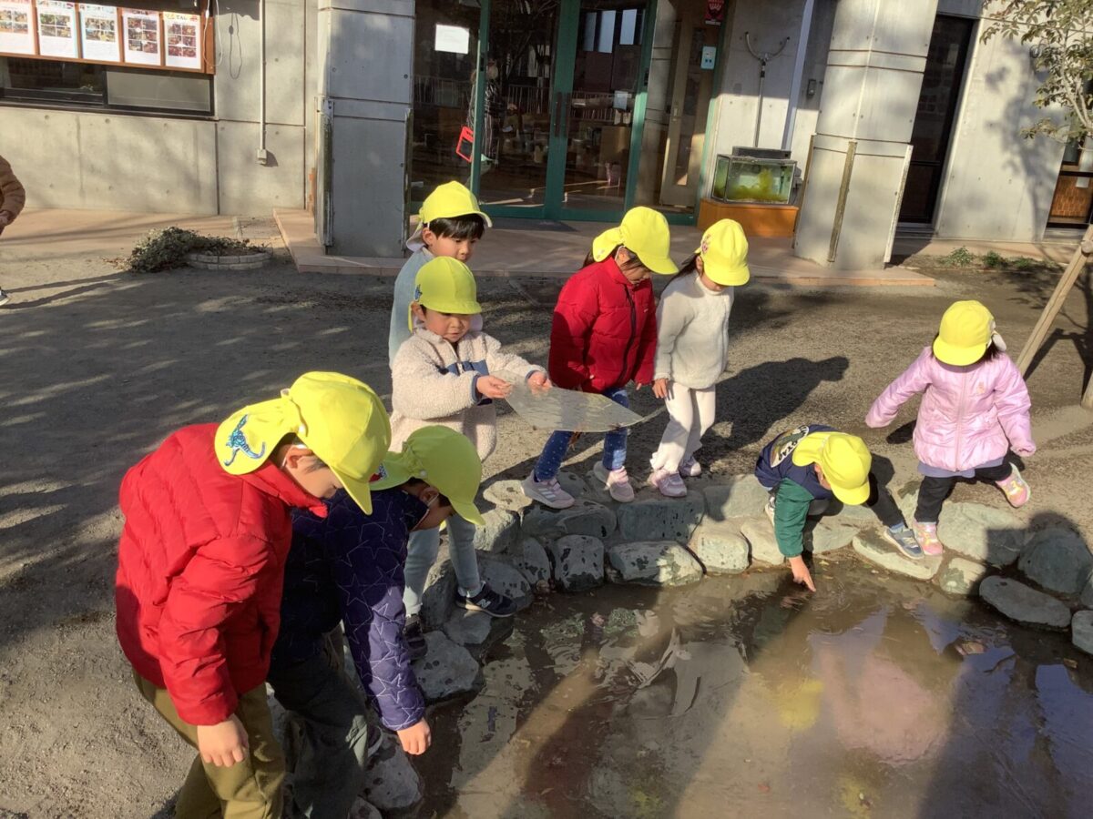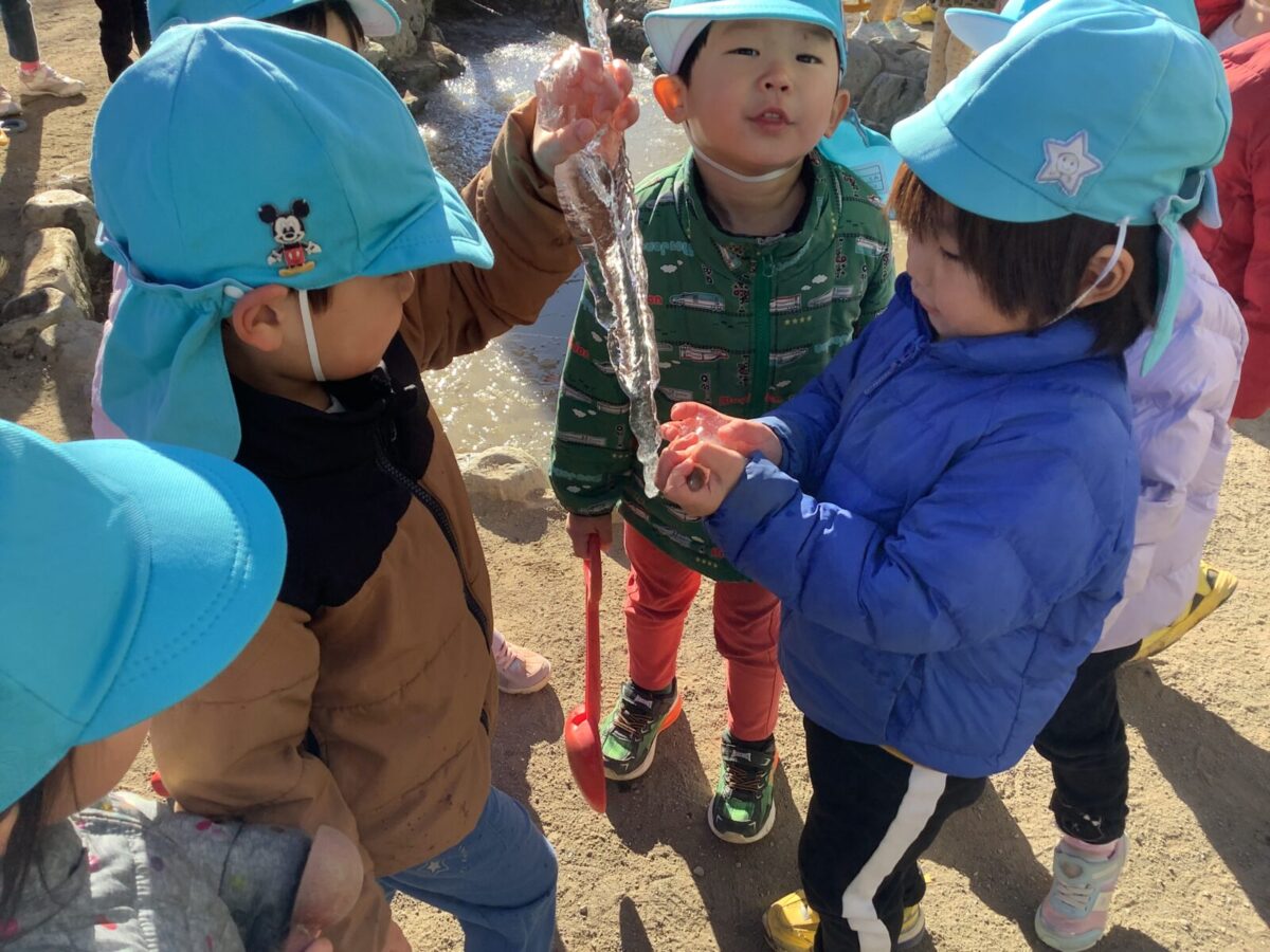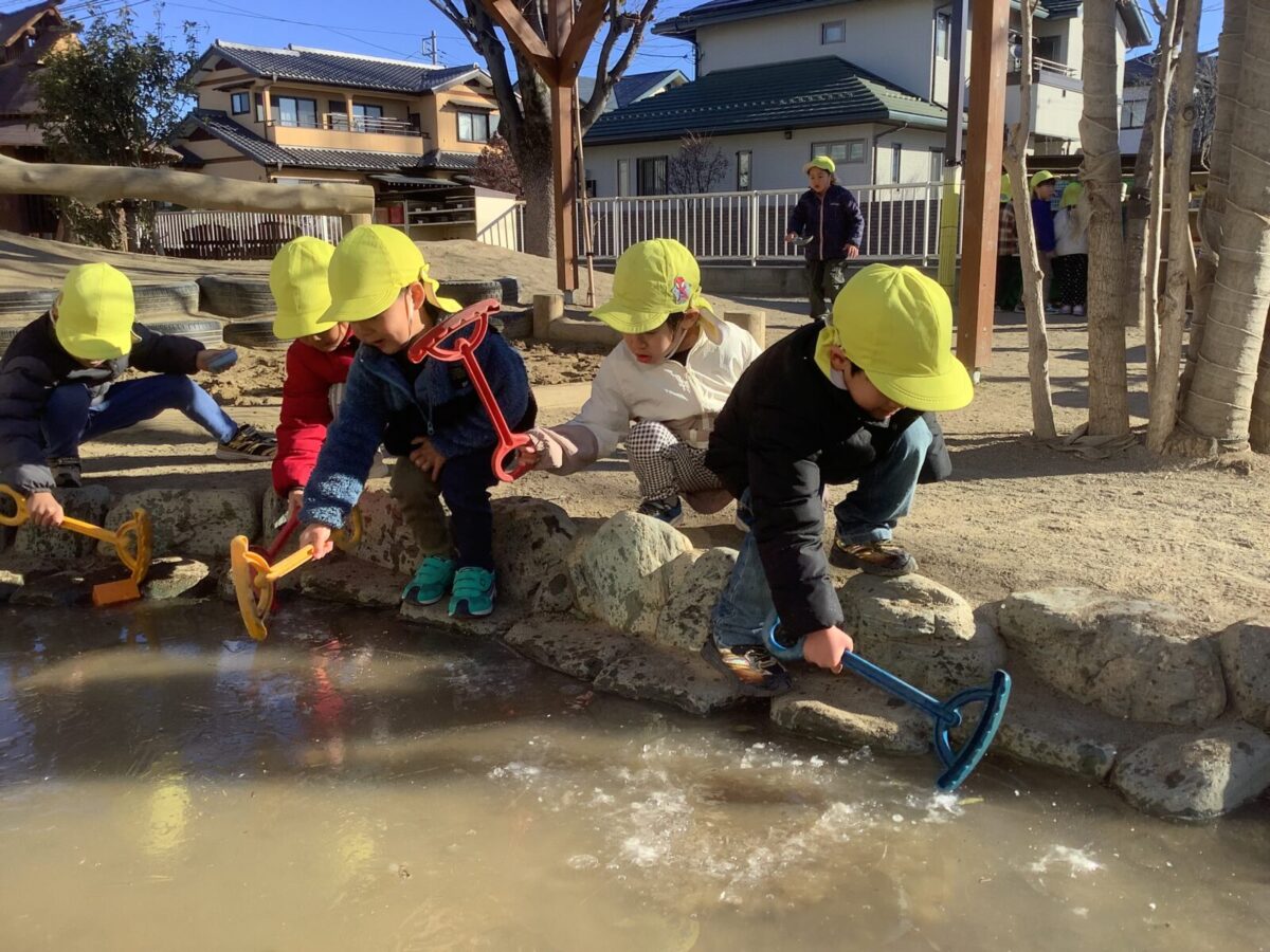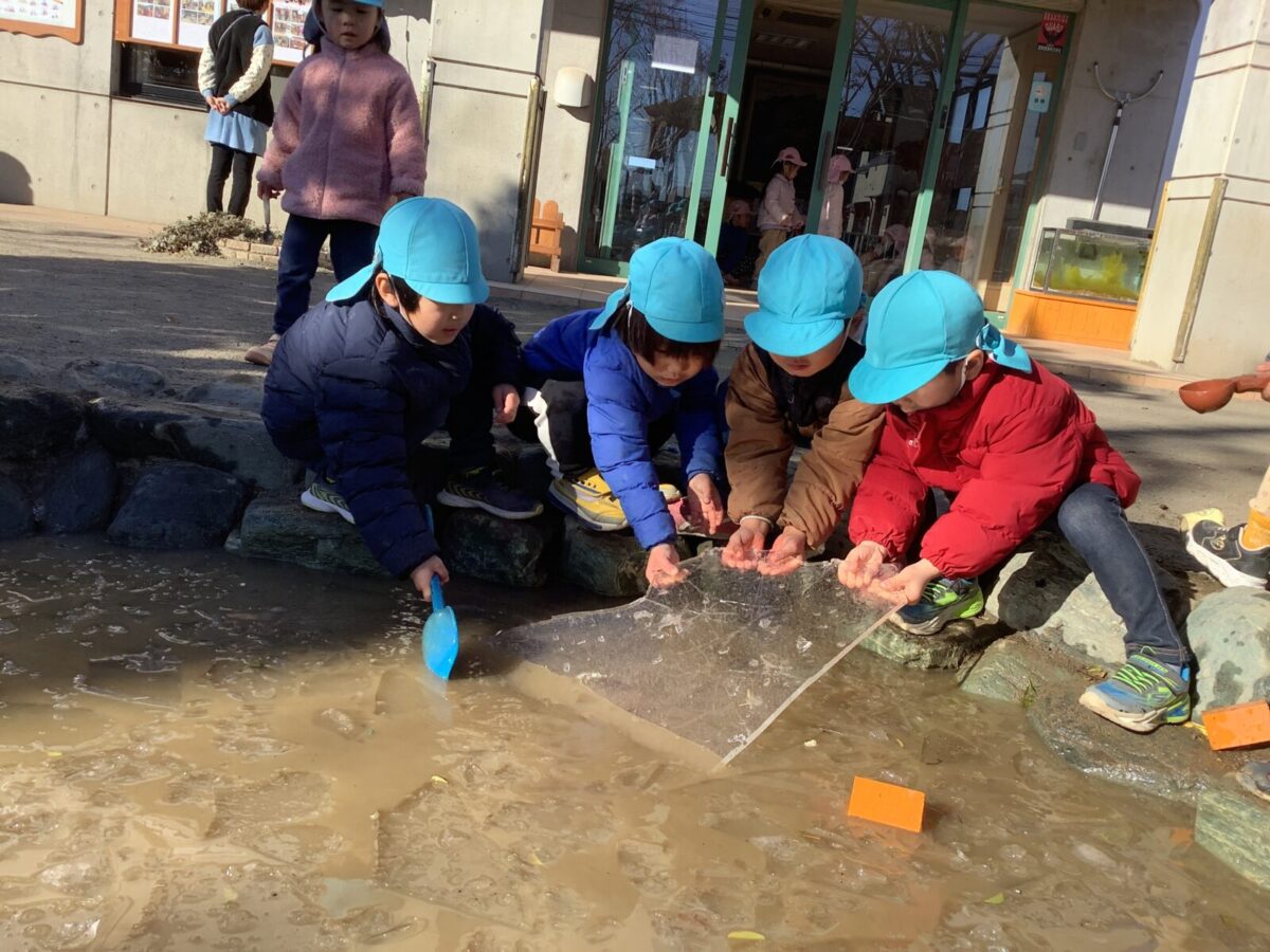 長い休み明けも子ども達は元気いっぱい戸外で遊ぶことができました。気温が下がり、池に氷が張ることもありました。氷の感触を楽しんだり、氷を使ってのごっこ遊びを楽しむ子もいましたよ♪