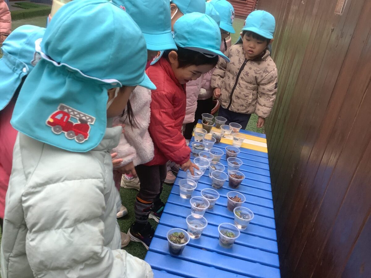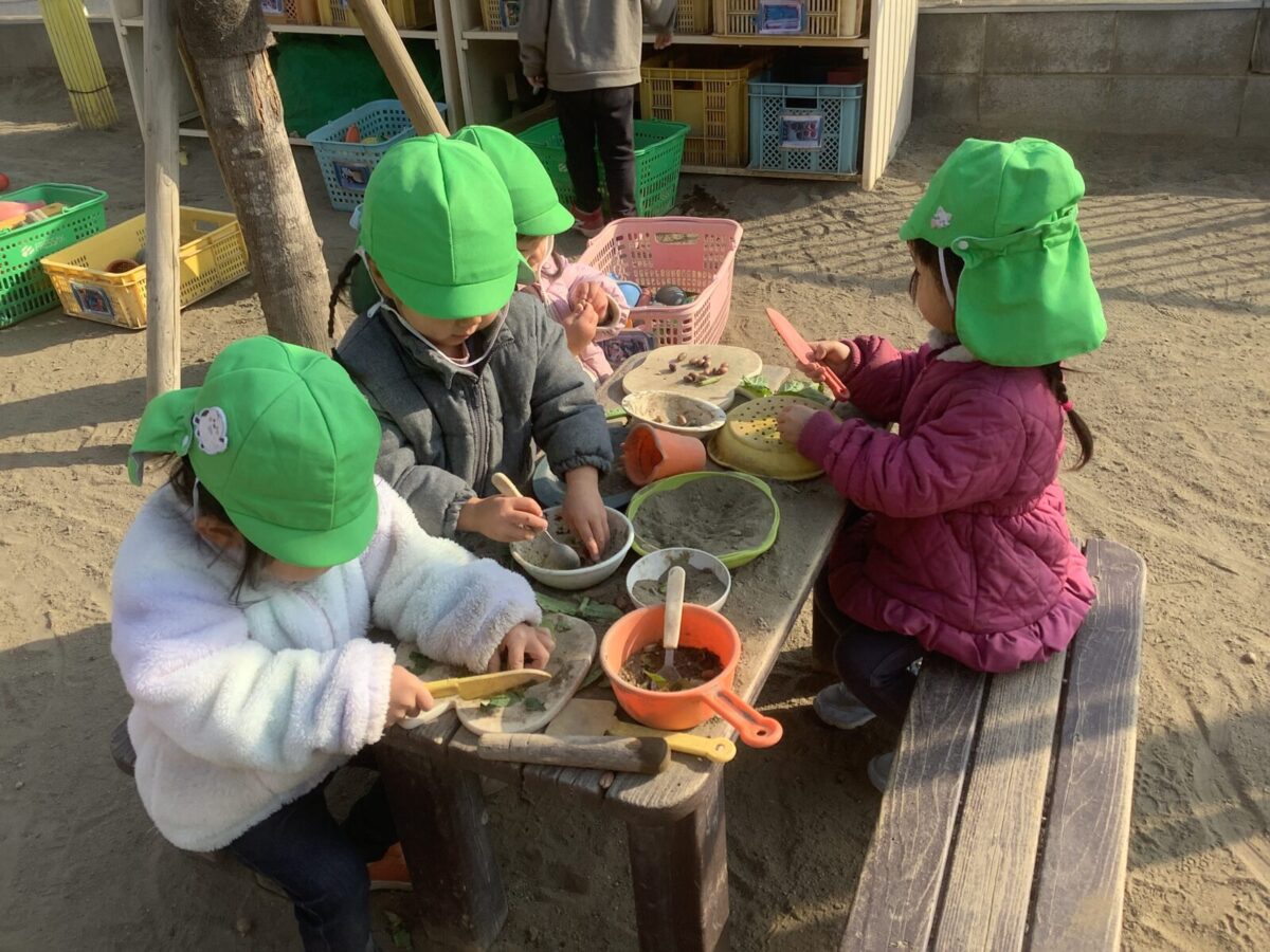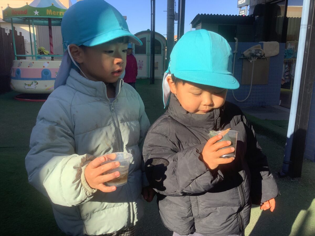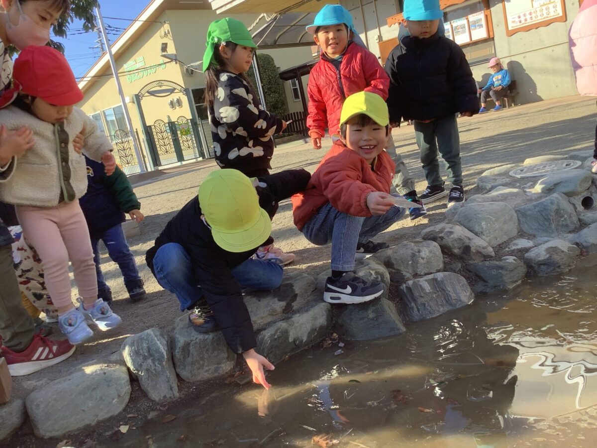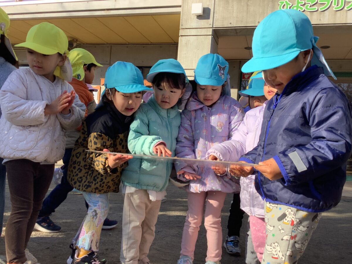 長い休み明けも子ども達は元気いっぱい戸外で遊ぶことができました。気温が下がり、池に氷が張ることもありました。氷の感触を楽しんだり、氷を使ってのごっこ遊びを楽しむ子もいましたよ♪