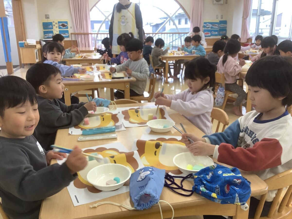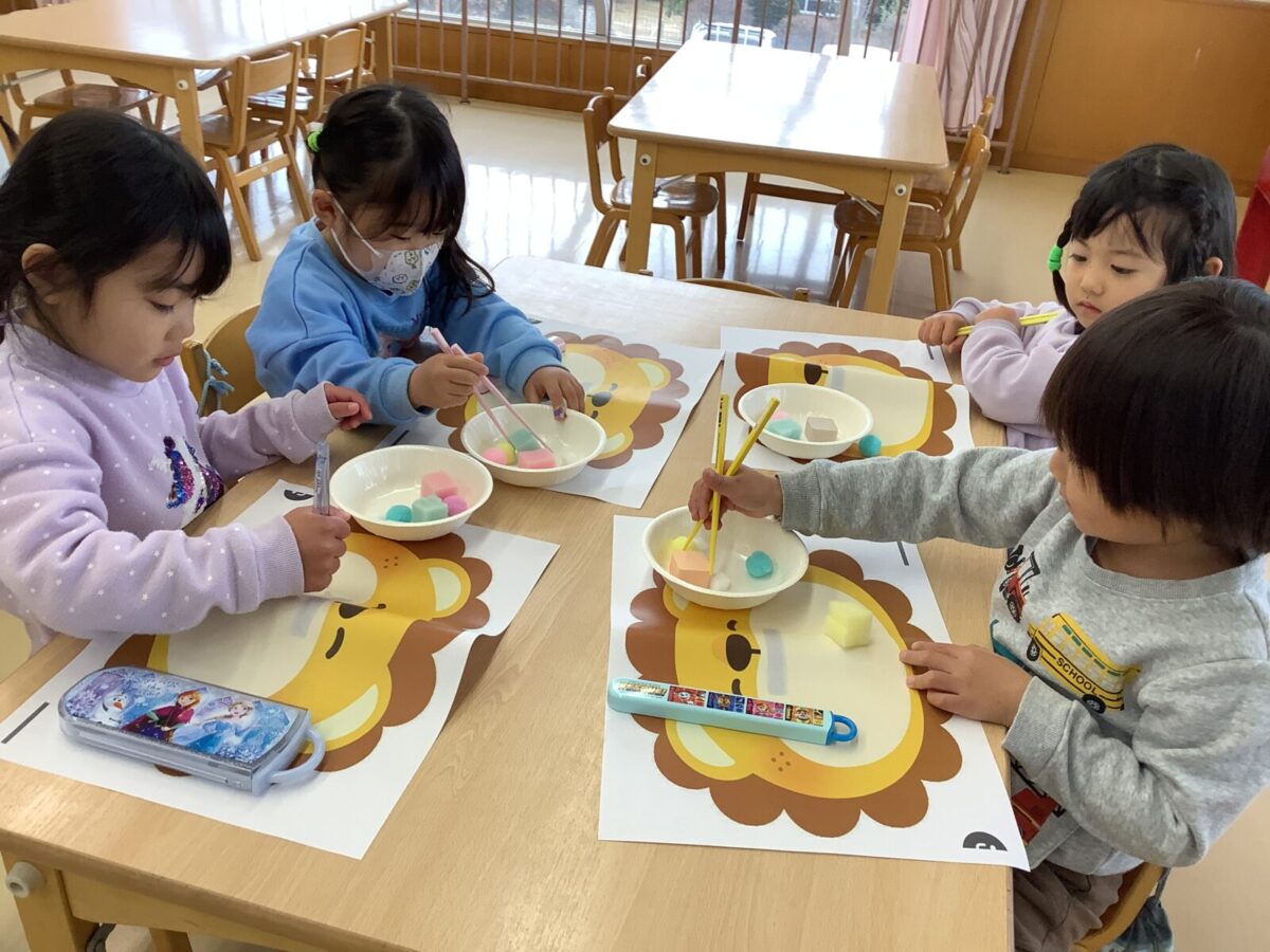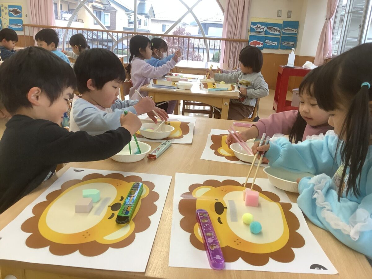 たいよう組は箸の食育を行いました。お気に入りの自分の箸でスポンジを挟み、ライオンの口の中に移す練習をしました。家で箸を使用したことがある子も多く、「先生、できたよ」という声が広がっていました。