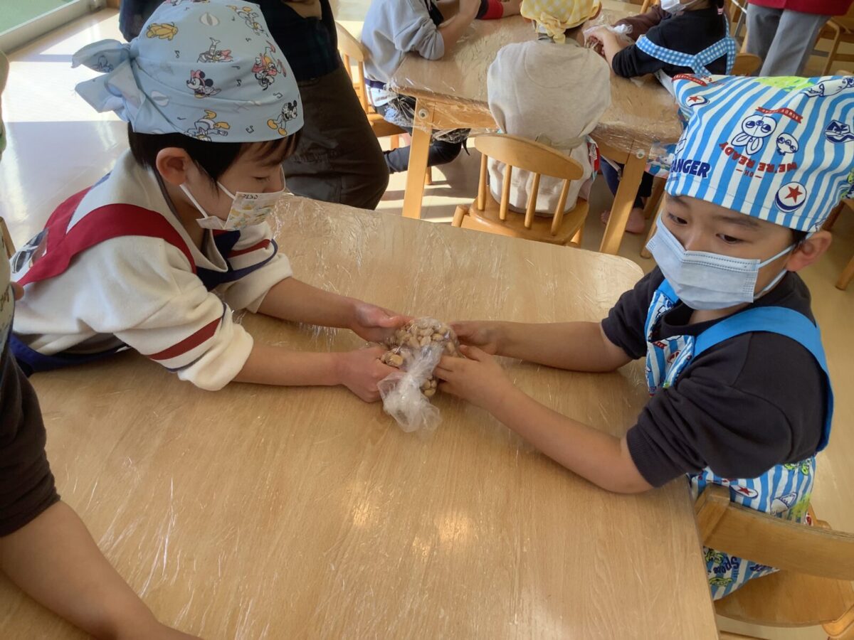 にじ組は味噌作りの食育を行いました。大豆を触り、感触を楽しんだあとは、容器に味噌を詰めました。カビができないように味噌を投げて入れるのが楽しかったようです。出来上がった味噌はそら組になったときに味噌汁にして食べたいと思います。