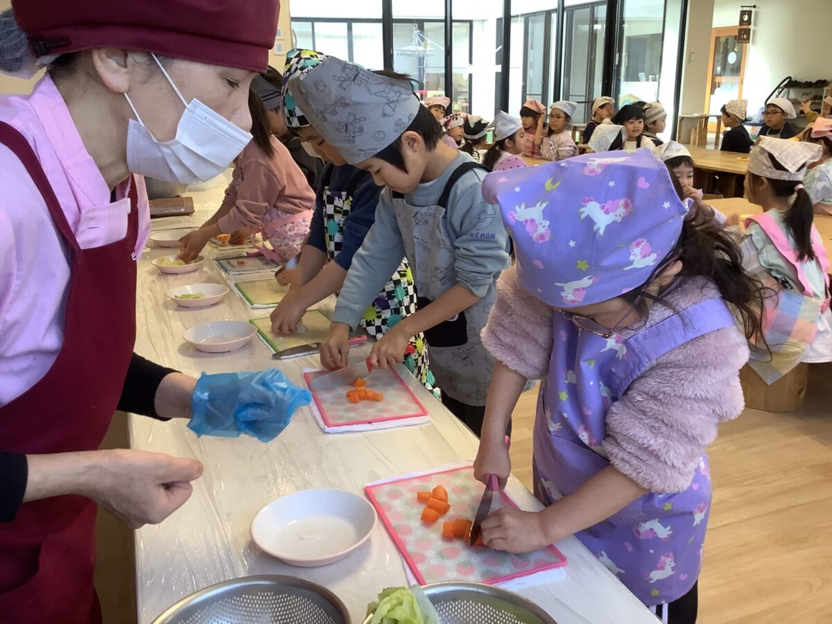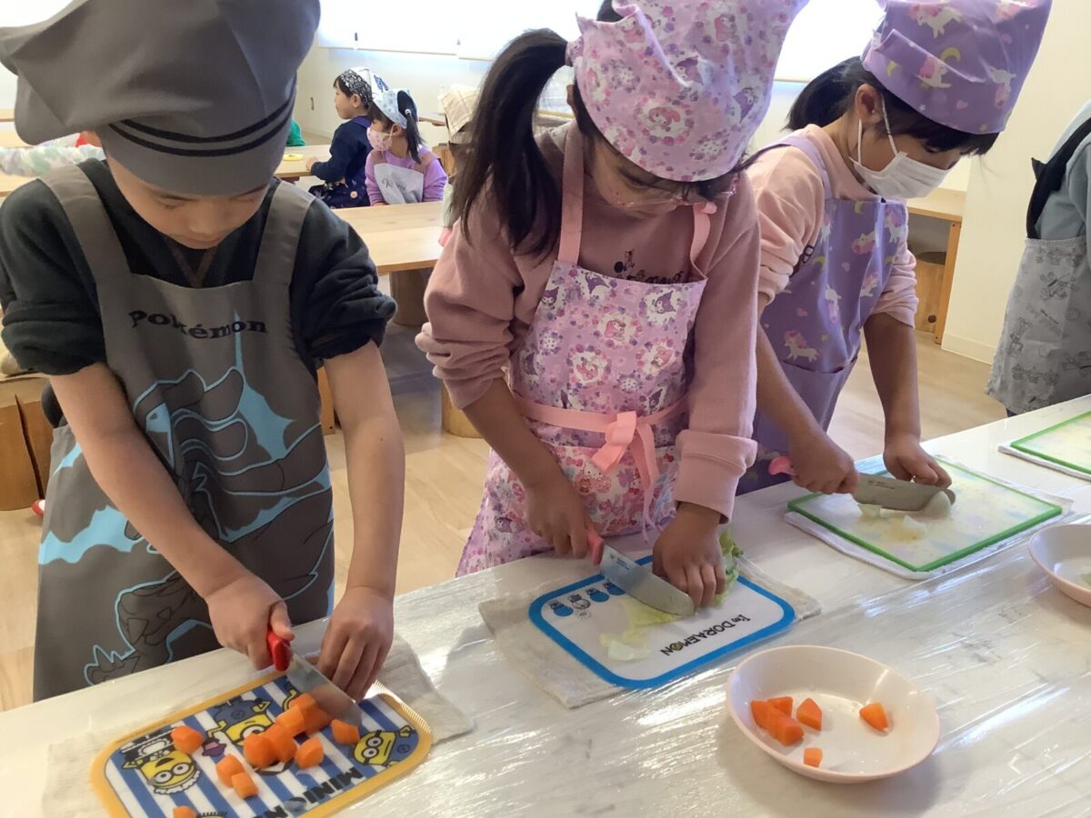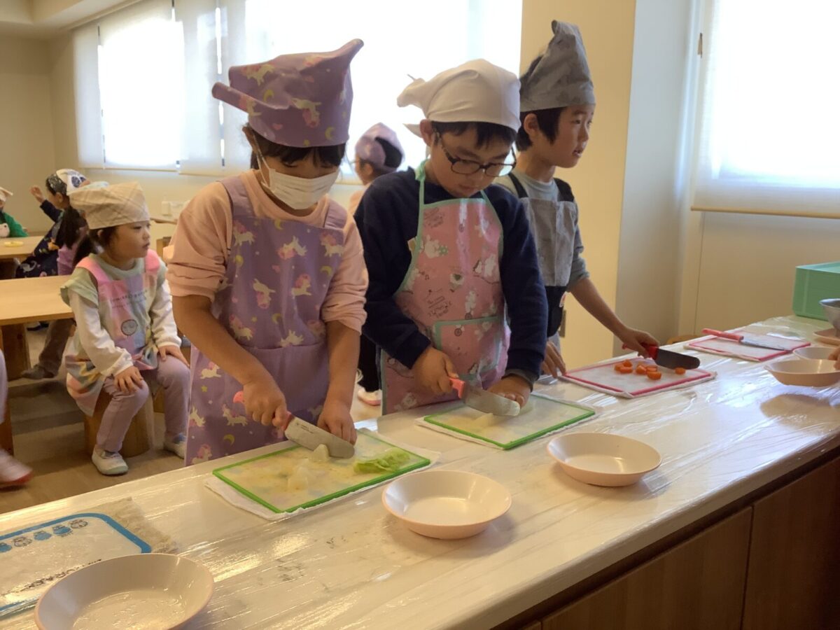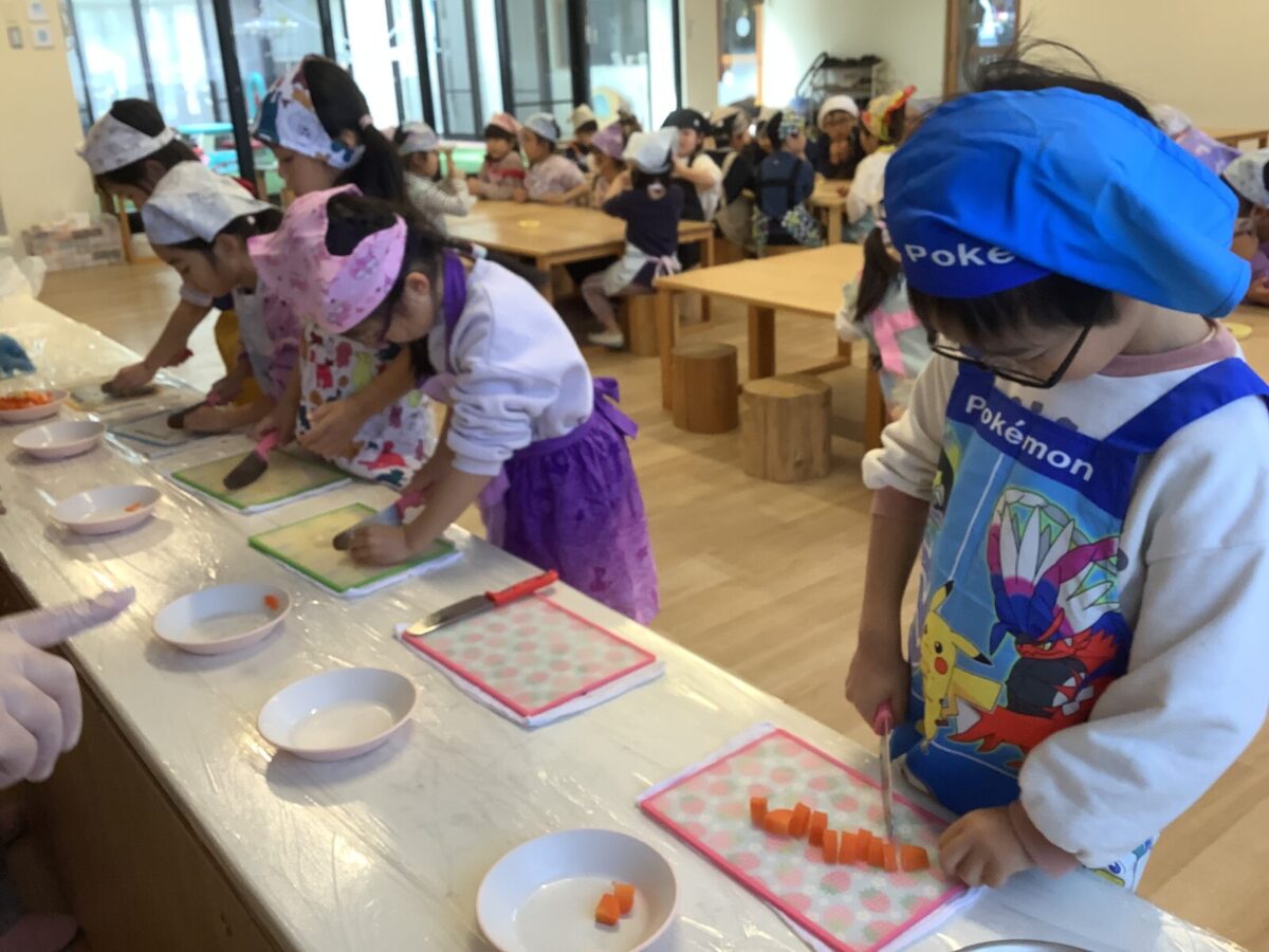 子どもたちの作業は野菜のカット!初めて包丁を使う子もいたようで、緊張気味でしたが切り終えると『楽しかった!』と言っていました。