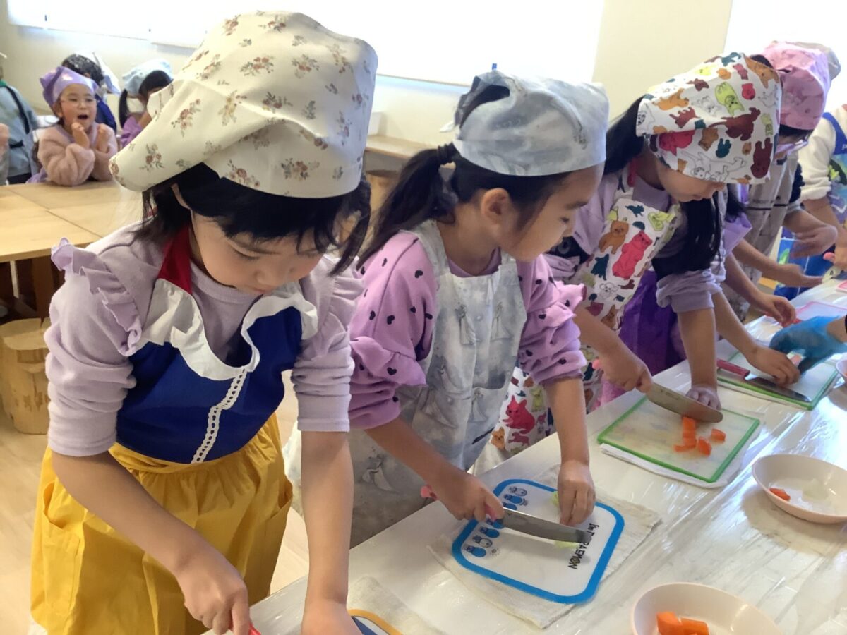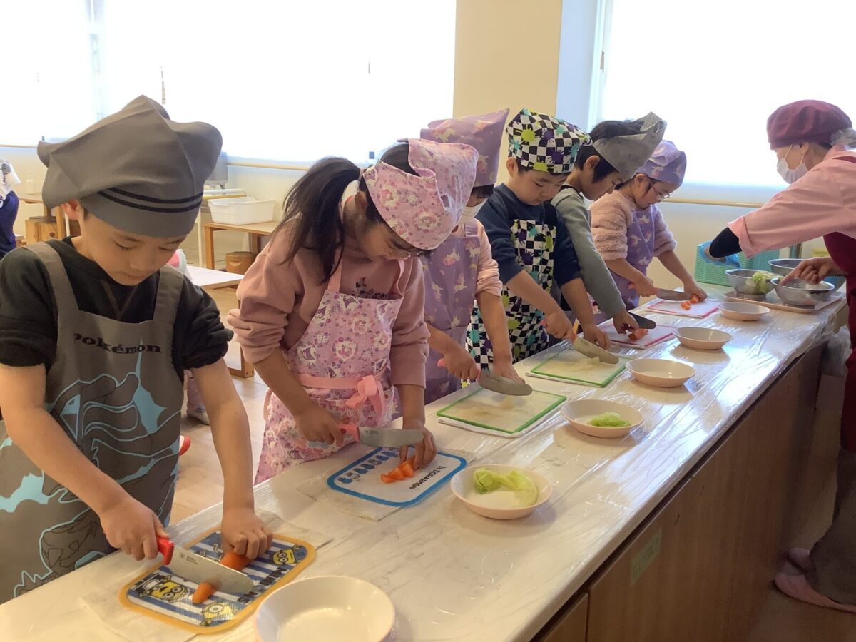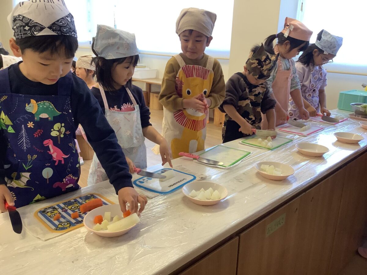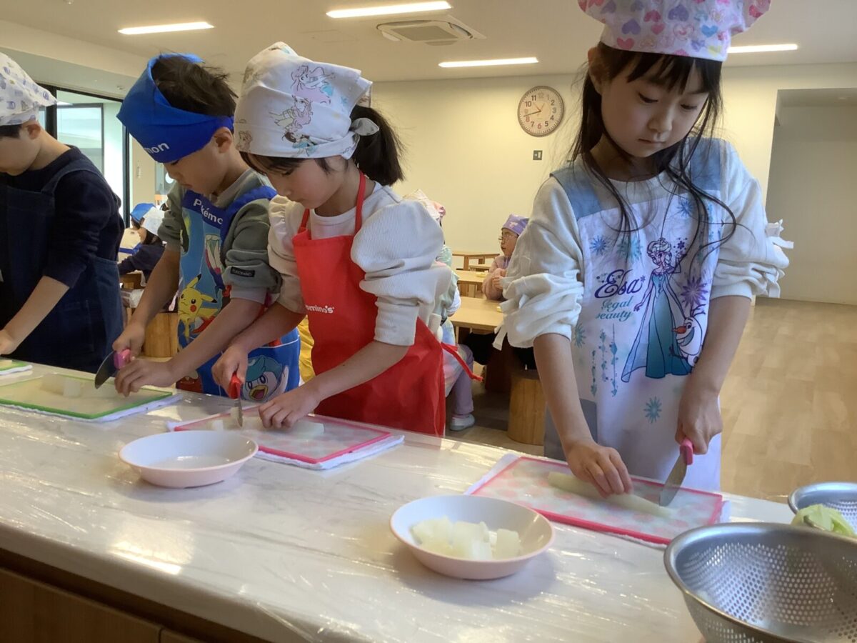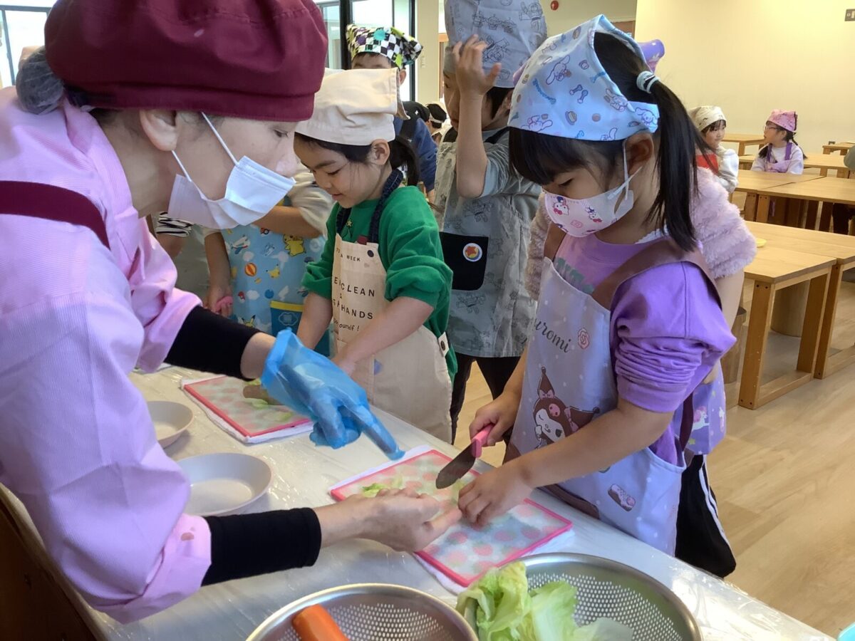 子どもたちの作業は野菜のカット!初めて包丁を使う子もいたようで、緊張気味でしたが切り終えると『楽しかった!』と言っていました。