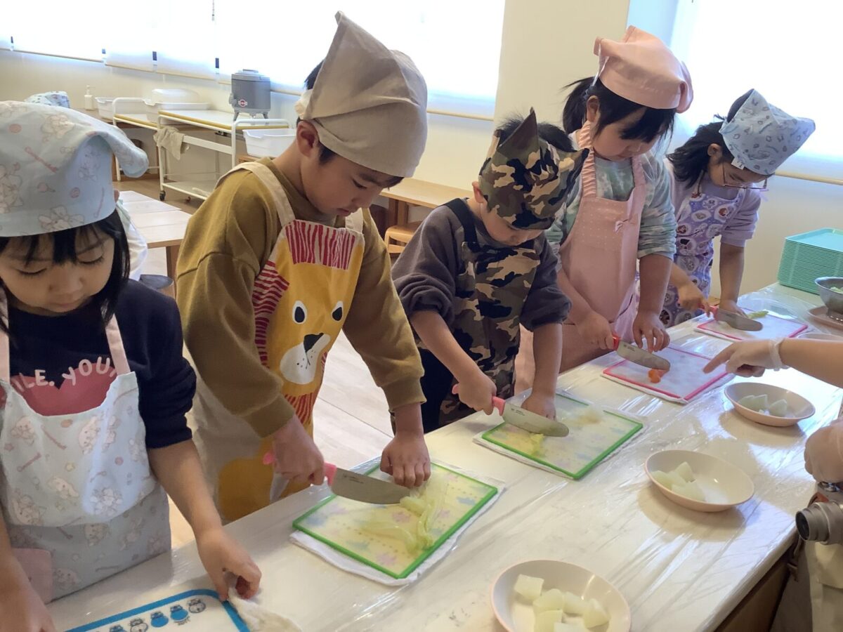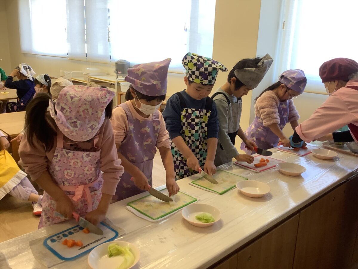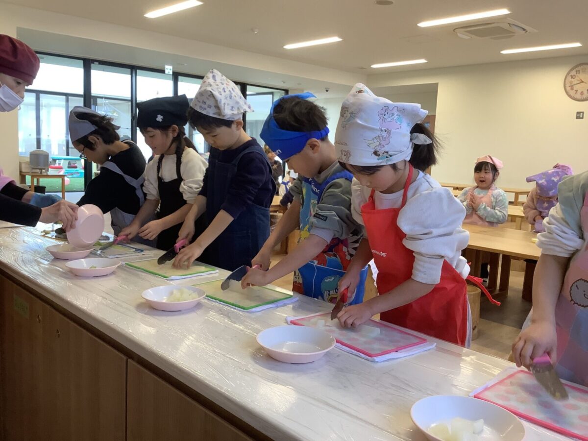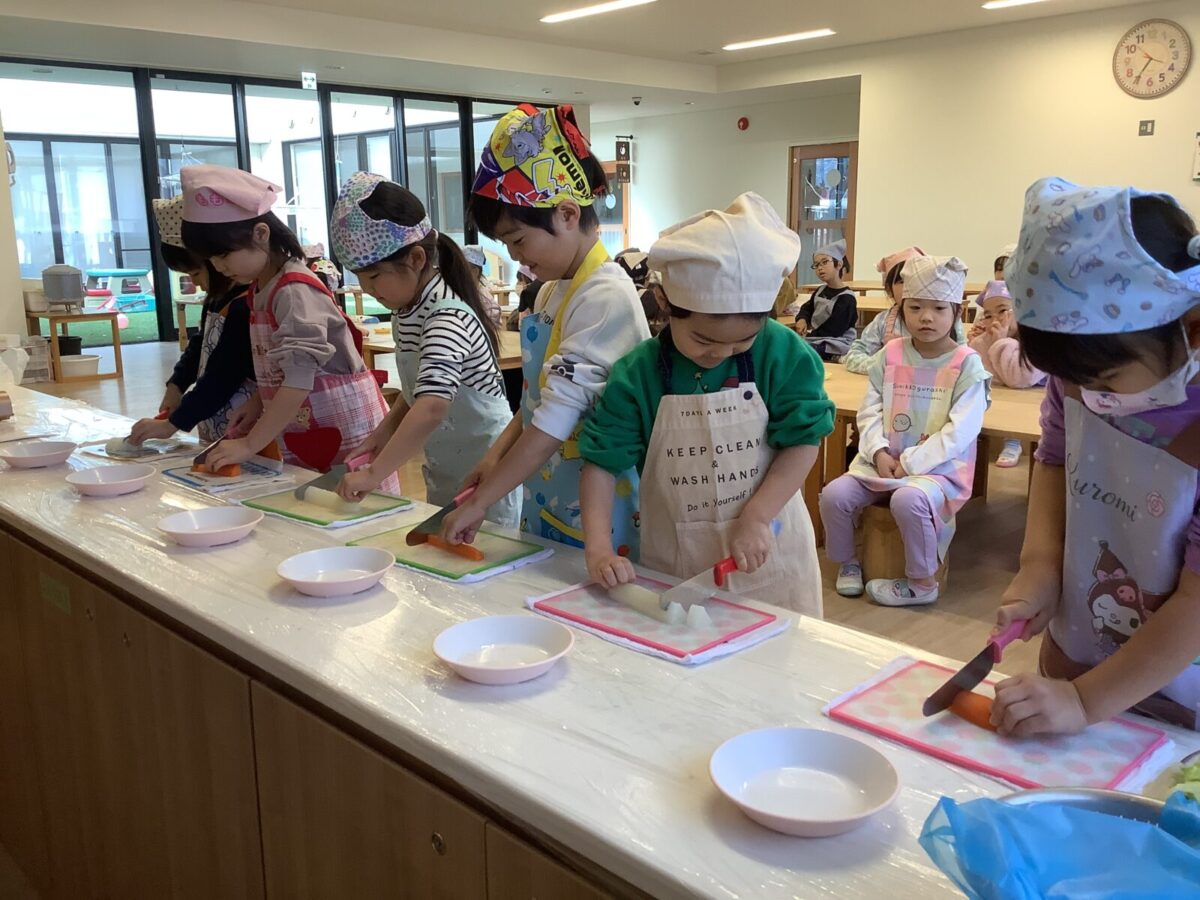子どもたちの作業は野菜のカット!初めて包丁を使う子もいたようで、緊張気味でしたが切り終えると『楽しかった!』と言っていました。