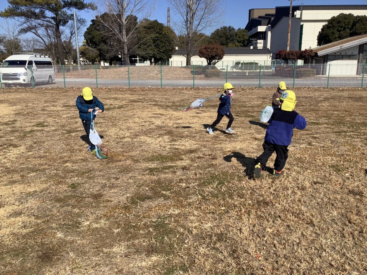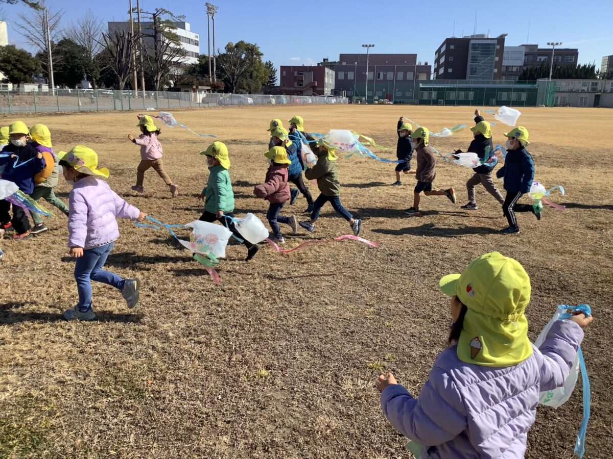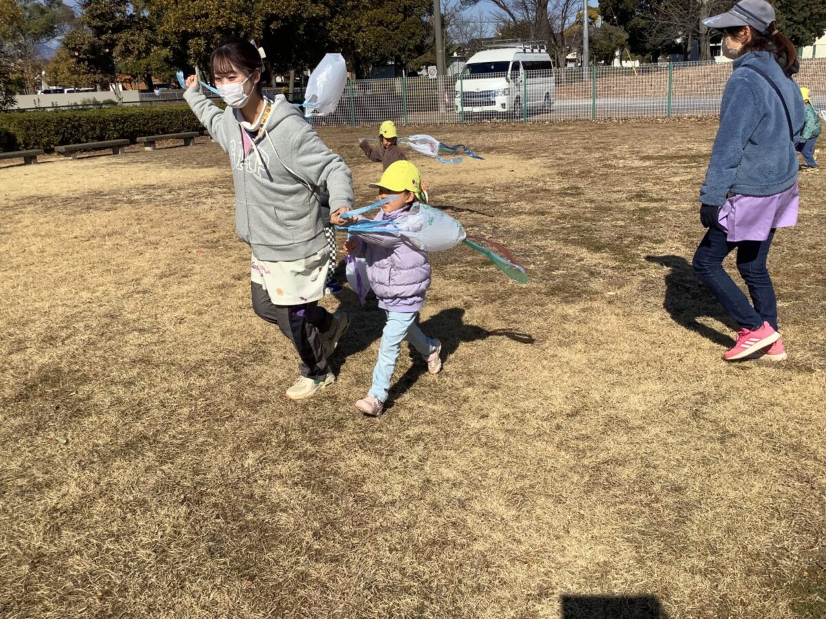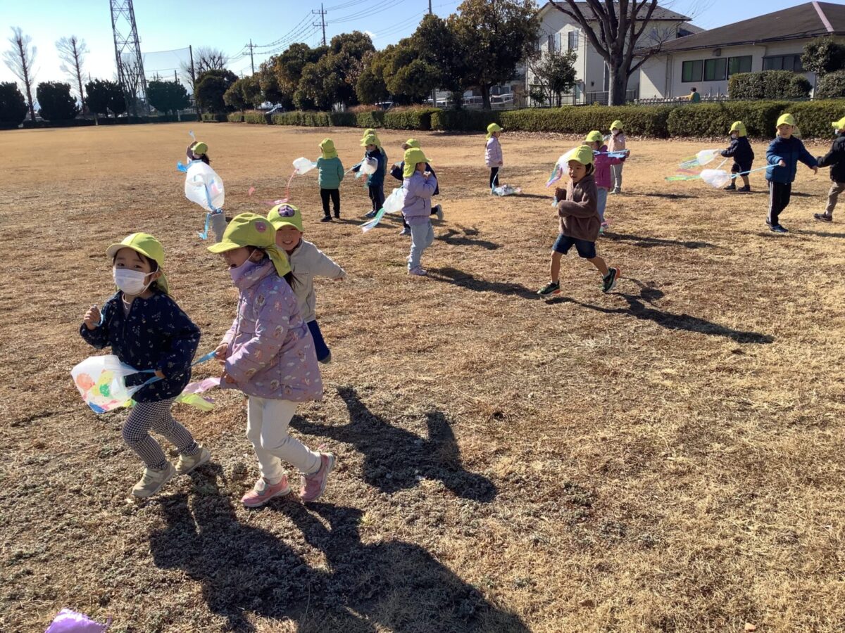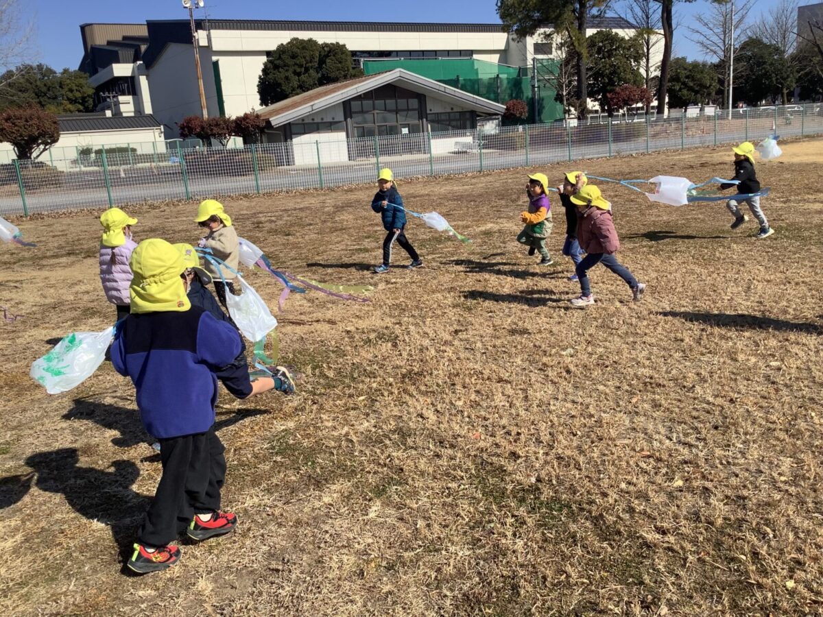 今月は一人のお友達が廃材製作で凧を作ったことをきっかけにみんなで凧揚げをすることにしました。