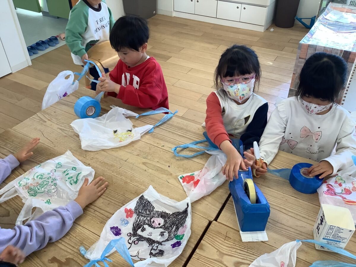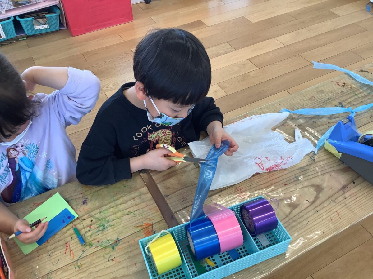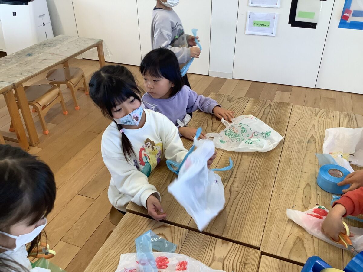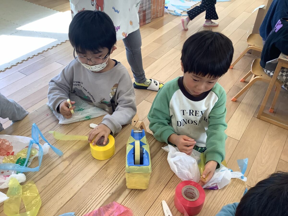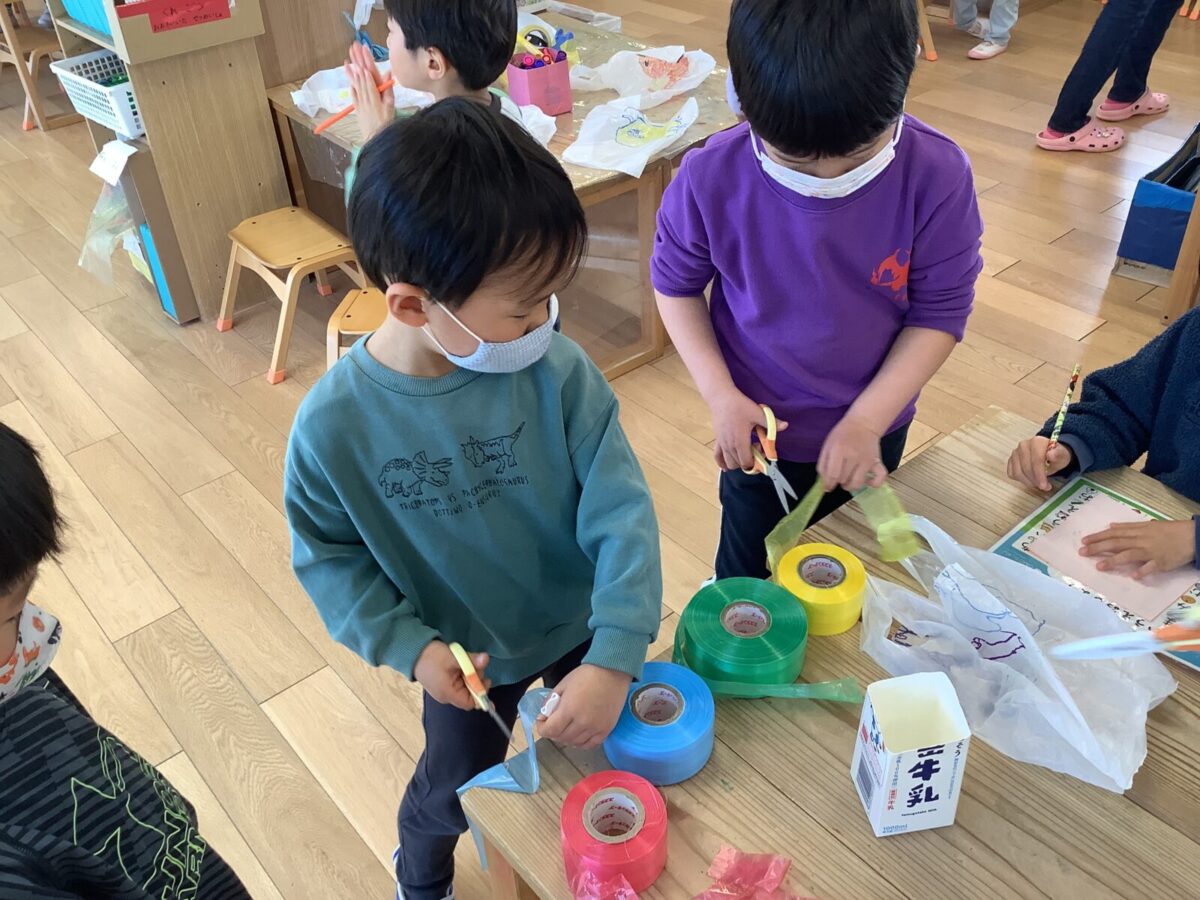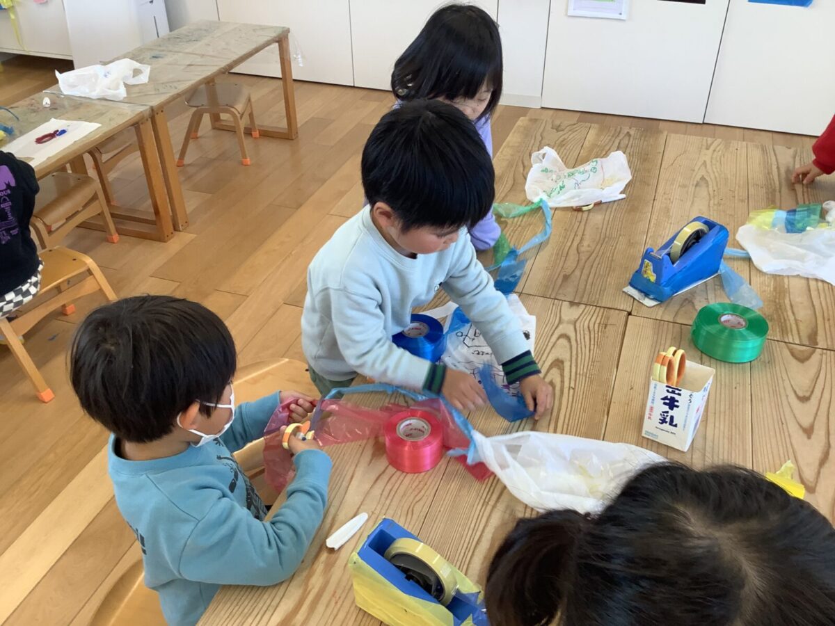 今月は一人のお友達が廃材製作で凧を作ったことをきっかけにみんなで凧揚げをすることにしました。