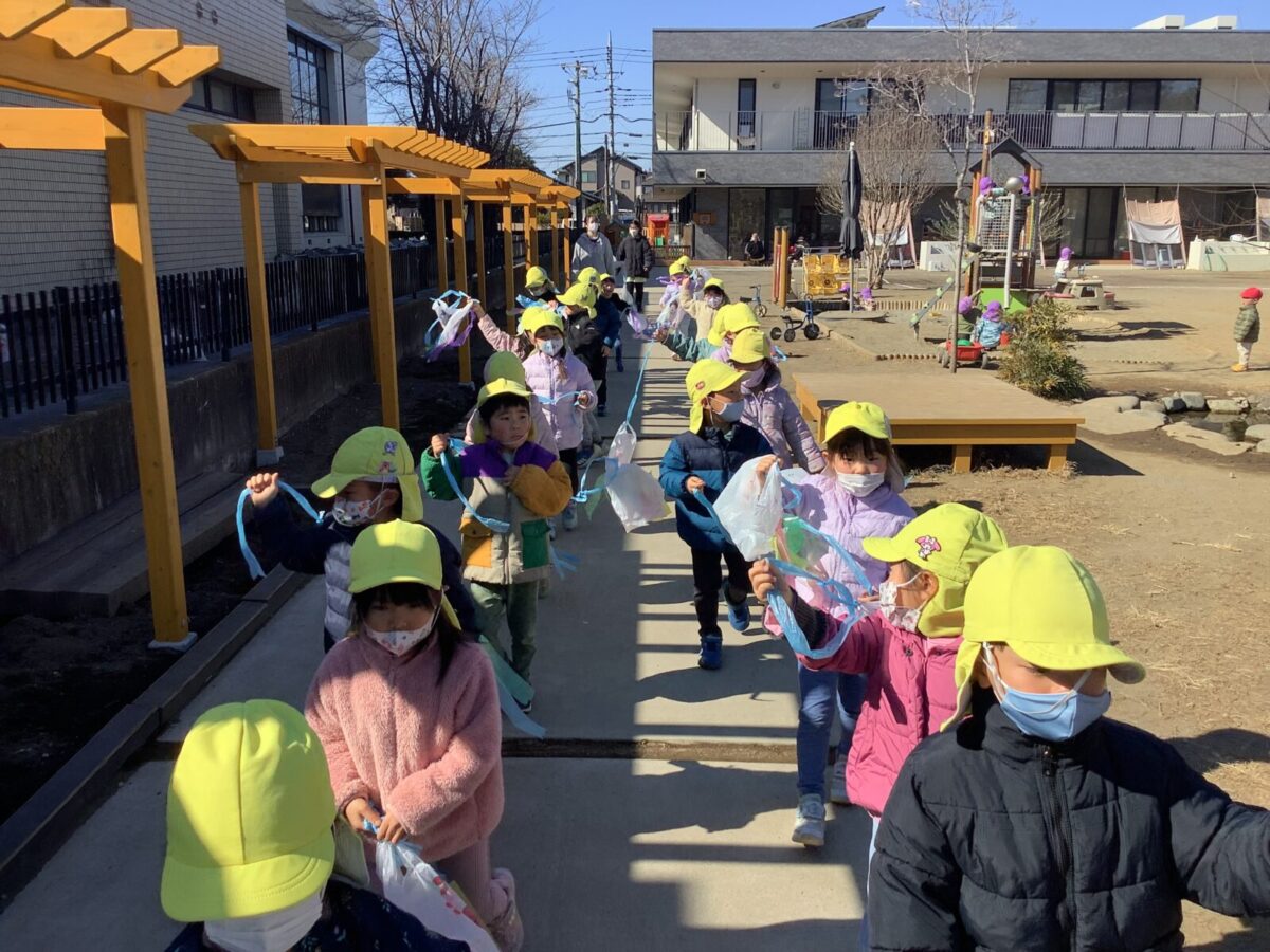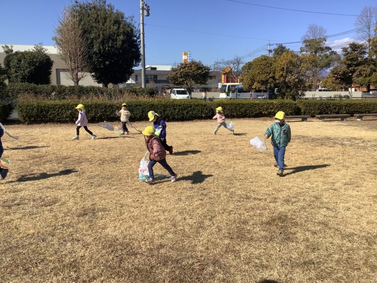 鬼ごっこもして体ポカポカ!広い場所で沢山走った子ども達。とても楽しかったようで帰り道は満足した様子の子ども達でした。ぶどう組での生活もあと一カ月程ですが、まだまだ楽しい思い出を作っていこうと思います。