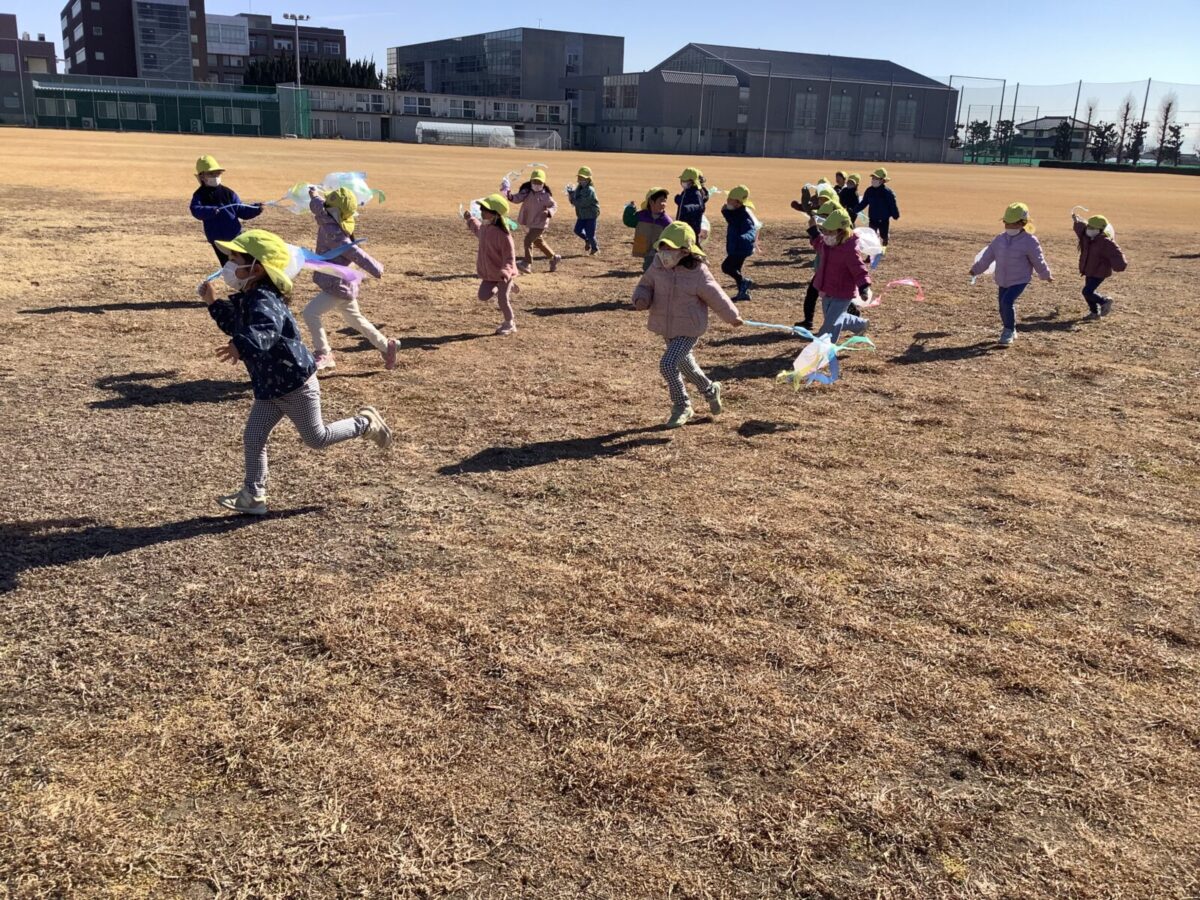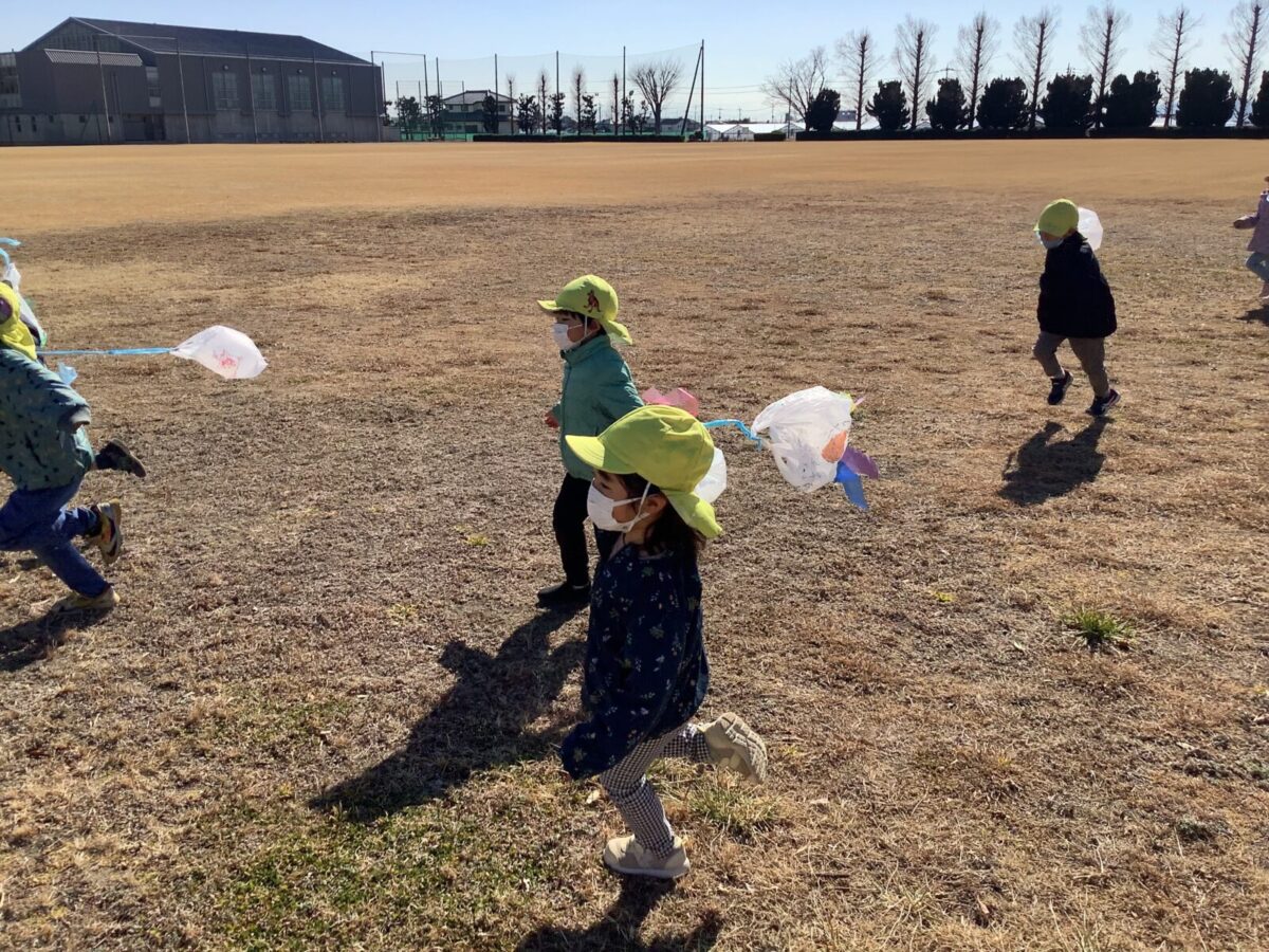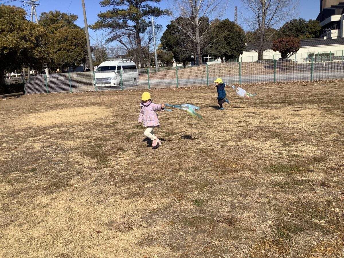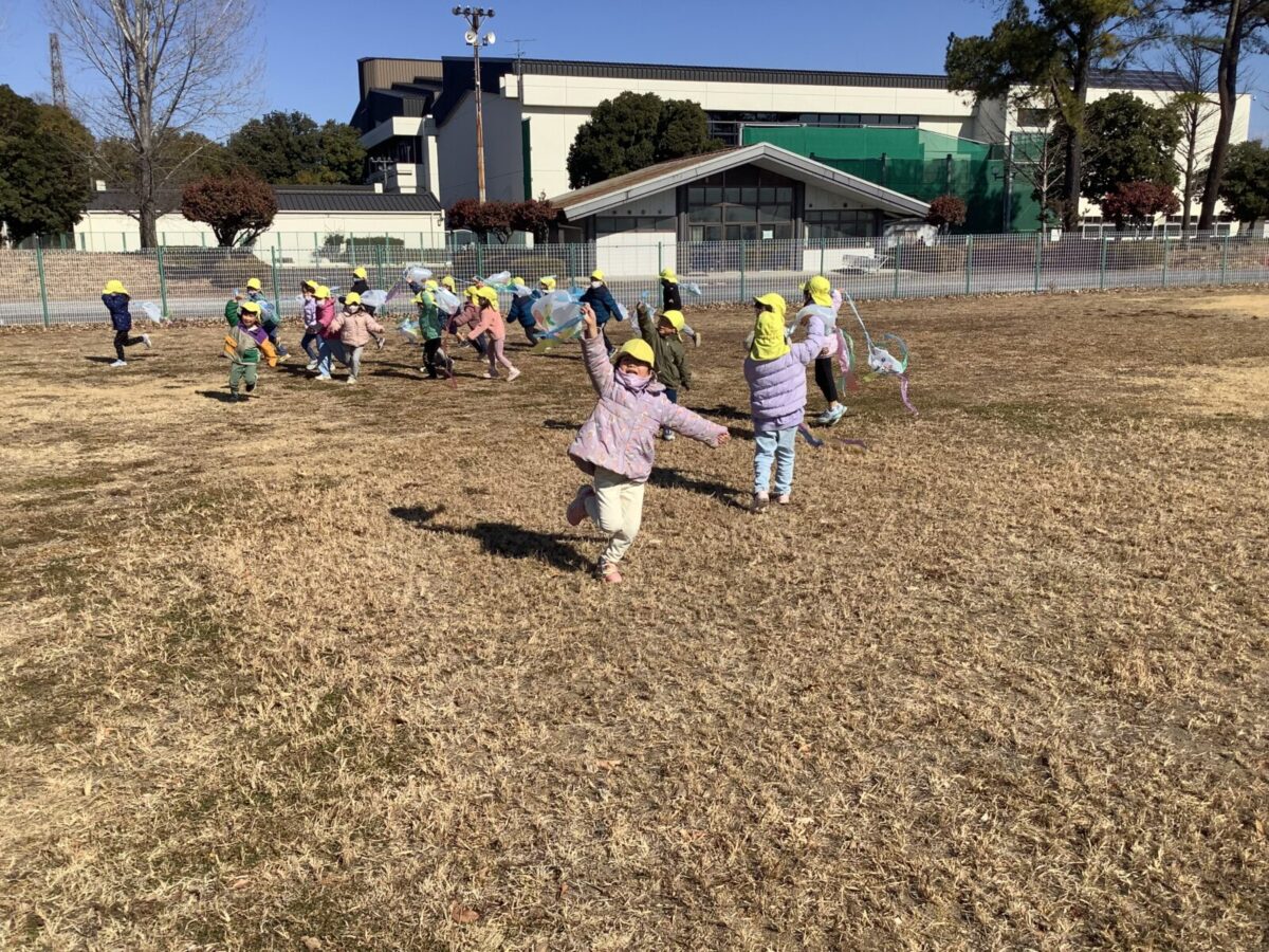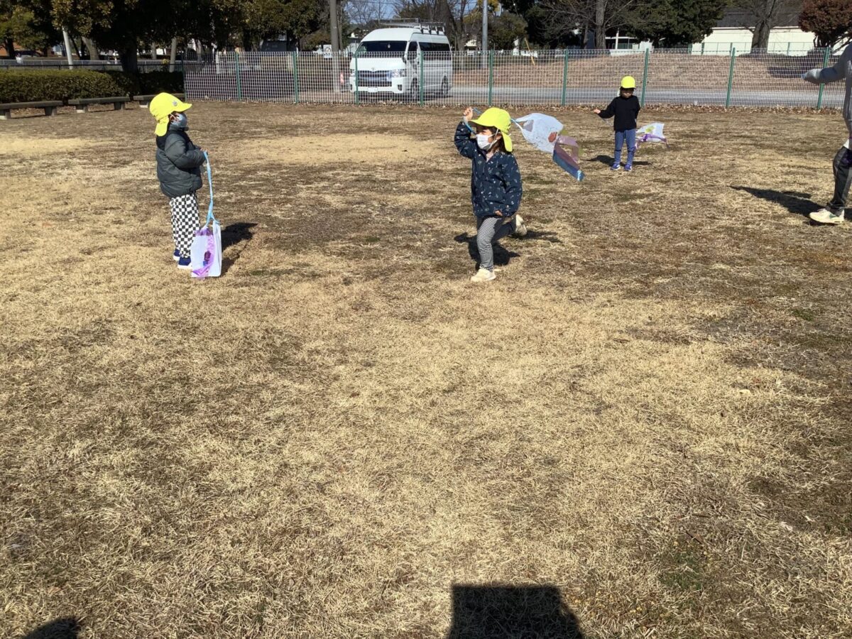 隣のグラウンドで思い切り凧揚げをしてきましたよ。よくあがるように早く走ってみたり、回ってみたり思い切り体を動かしましたよ!!