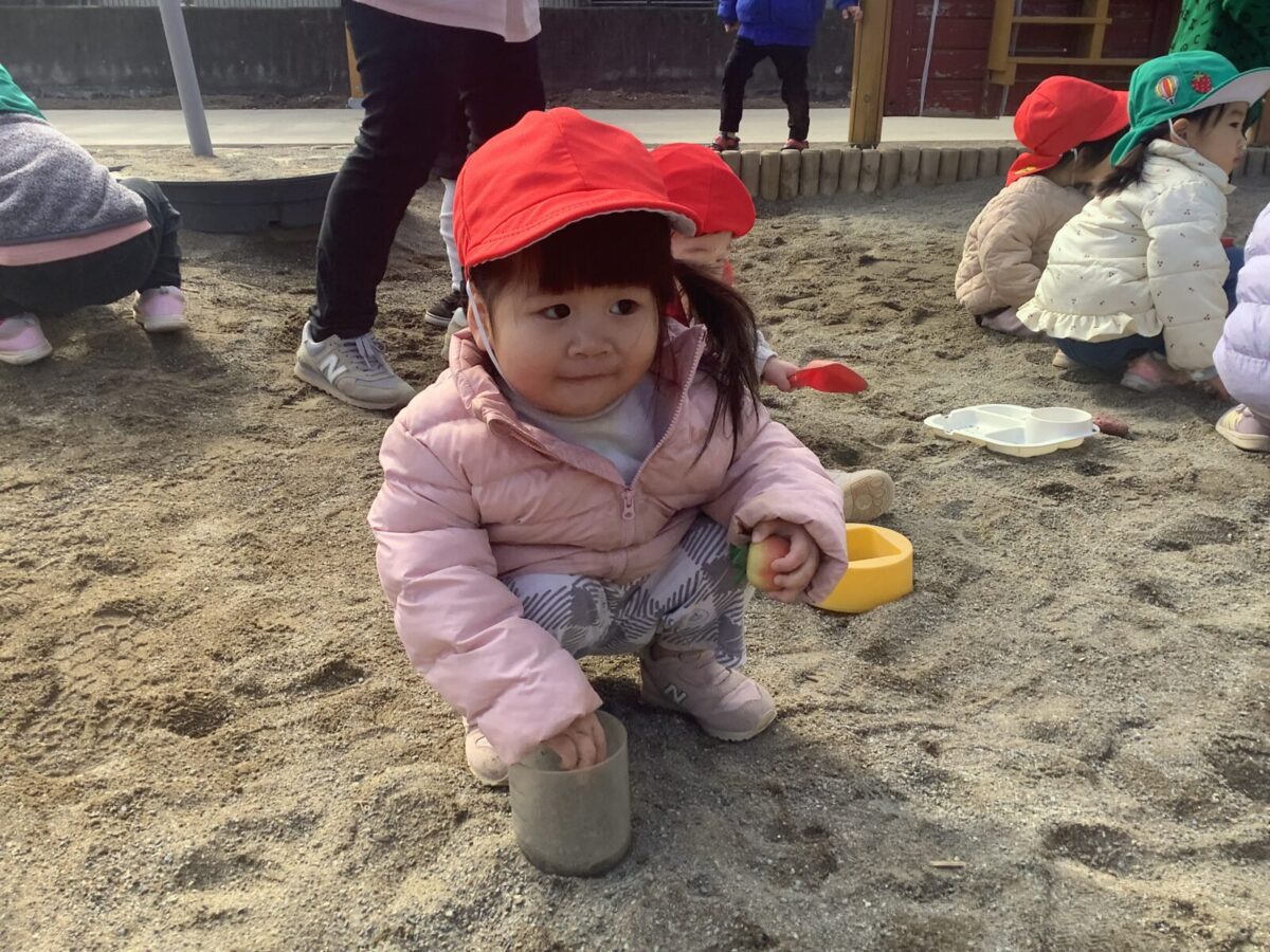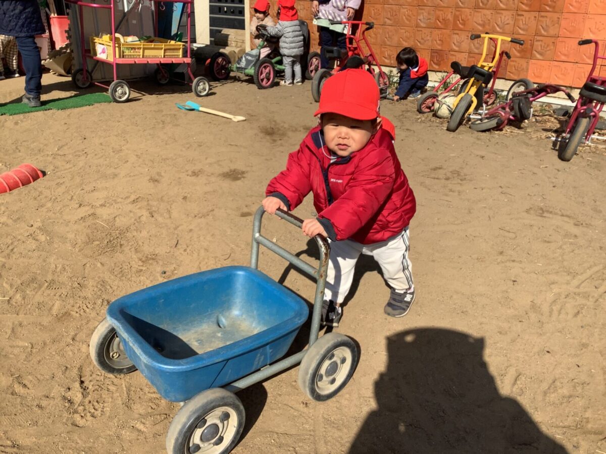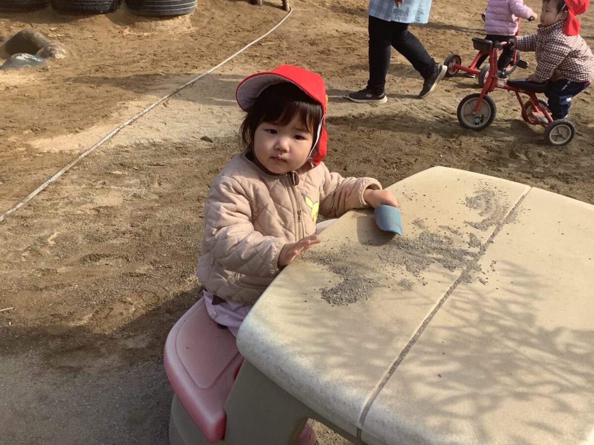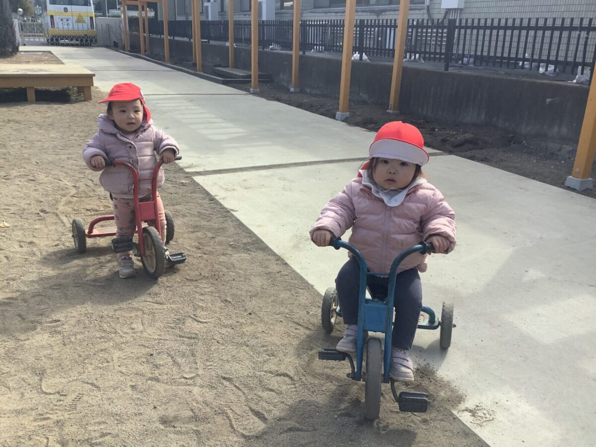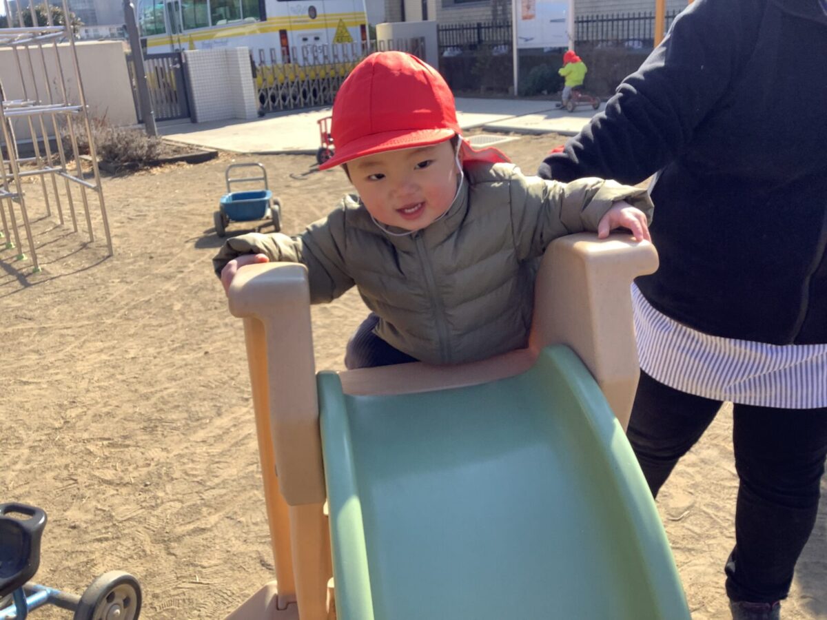 寒さが厳しい2月ですが、子どもたちはおやつを食べると帽子や上着を手にして外へ行こうと意欲満々!毎日、三輪車や押し車、砂遊びや滑り台、ブランコなど元気に好きな遊びを楽しんでいます♪