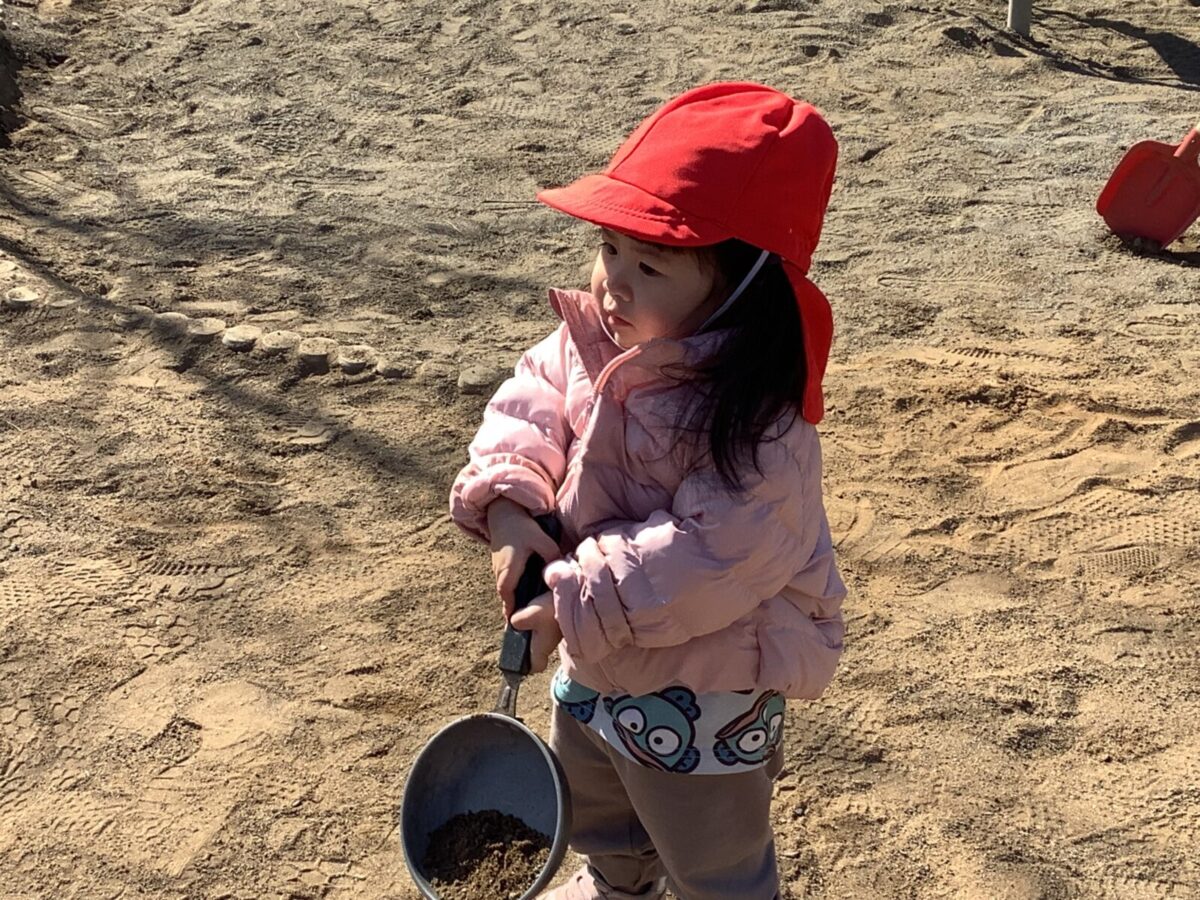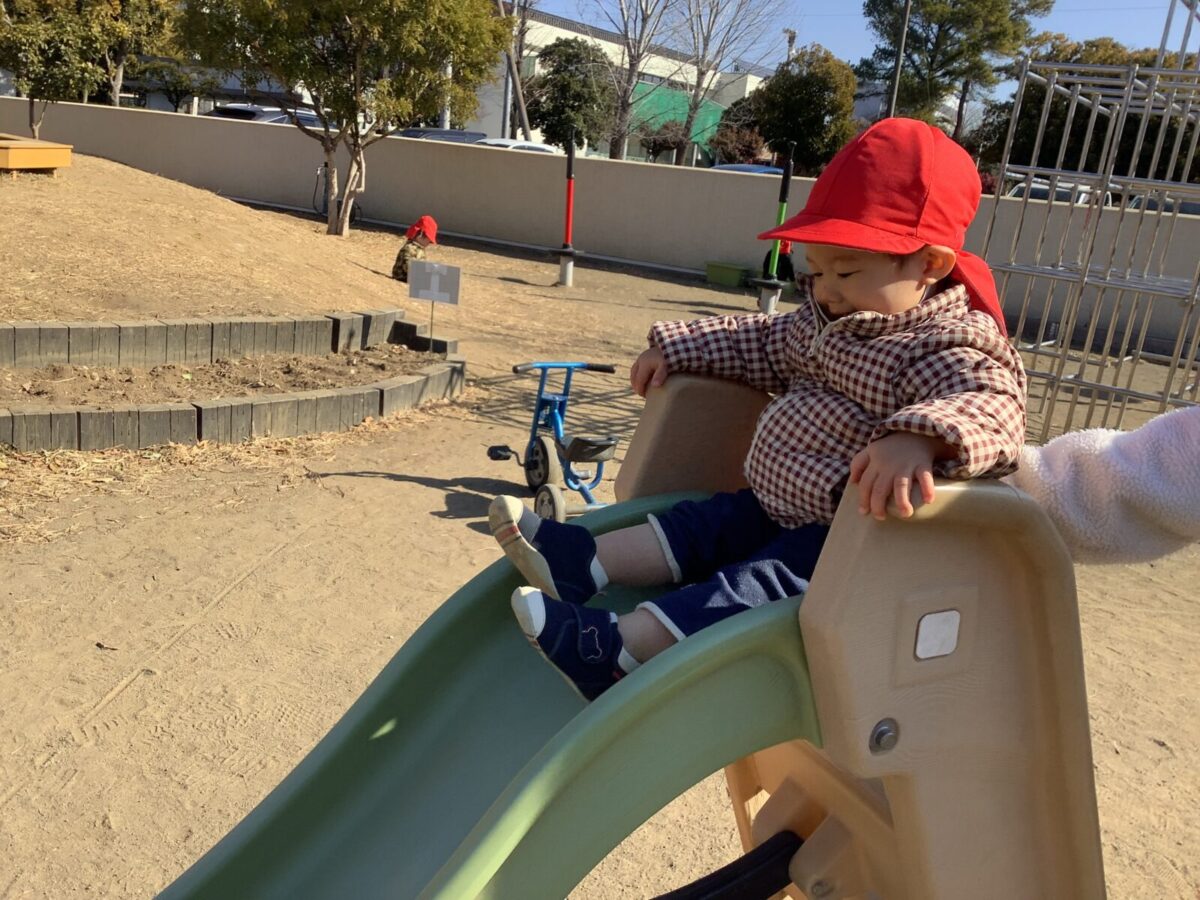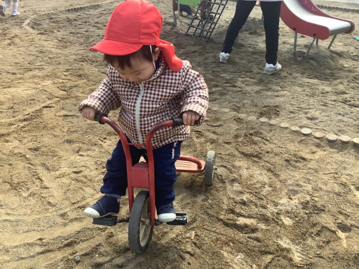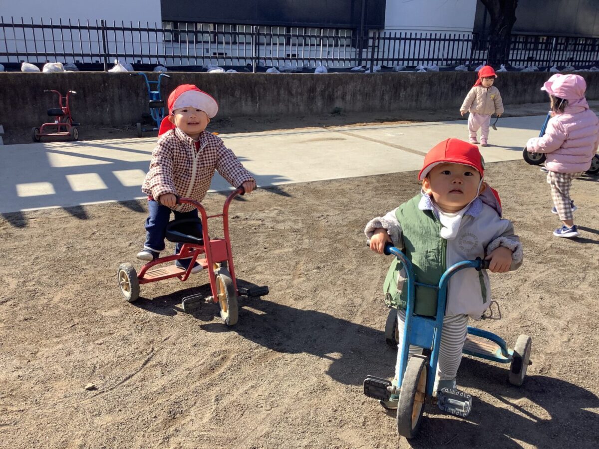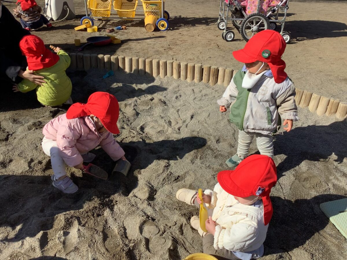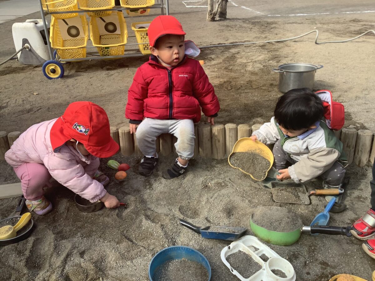 寒さが厳しい2月ですが、子どもたちはおやつを食べると帽子や上着を手にして外へ行こうと意欲満々!毎日、三輪車や押し車、砂遊びや滑り台、ブランコなど元気に好きな遊びを楽しんでいます♪