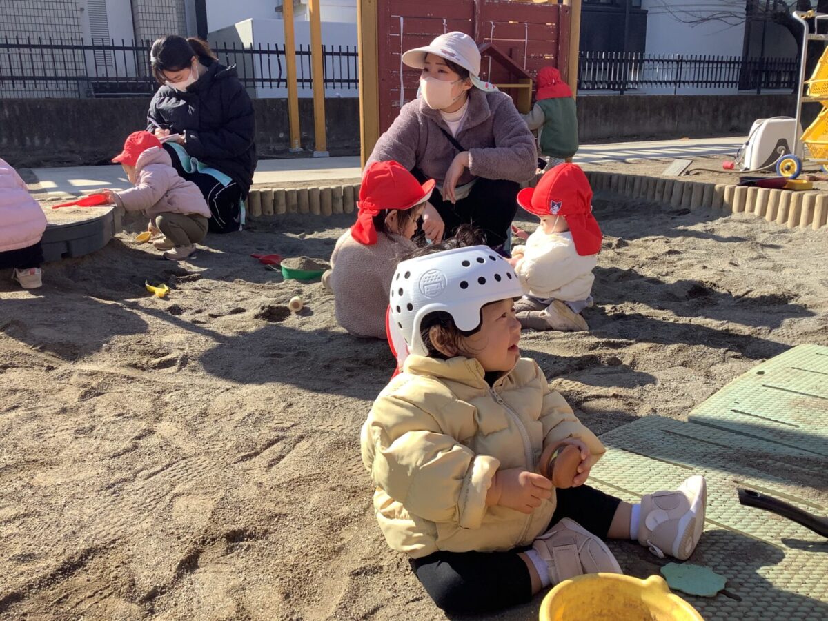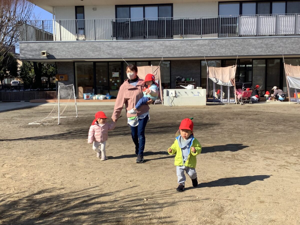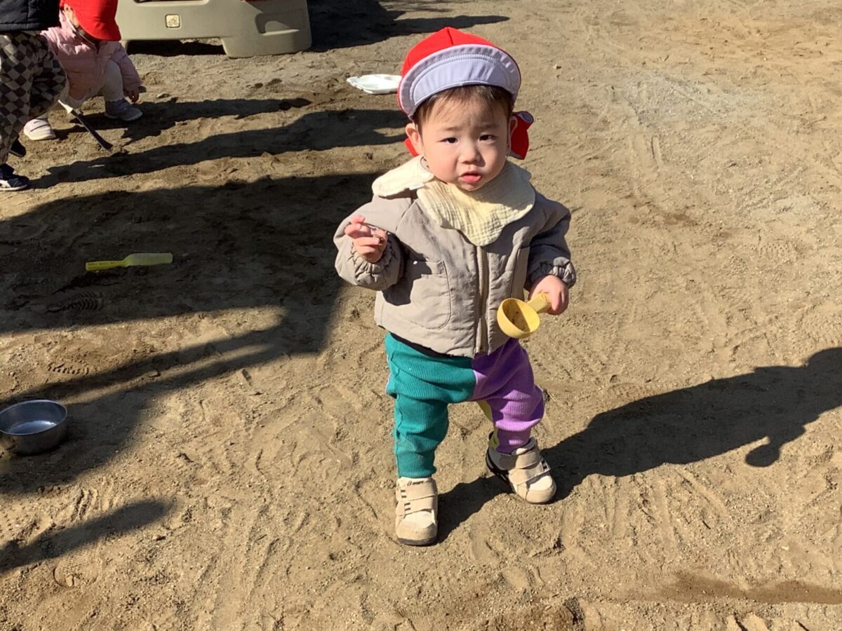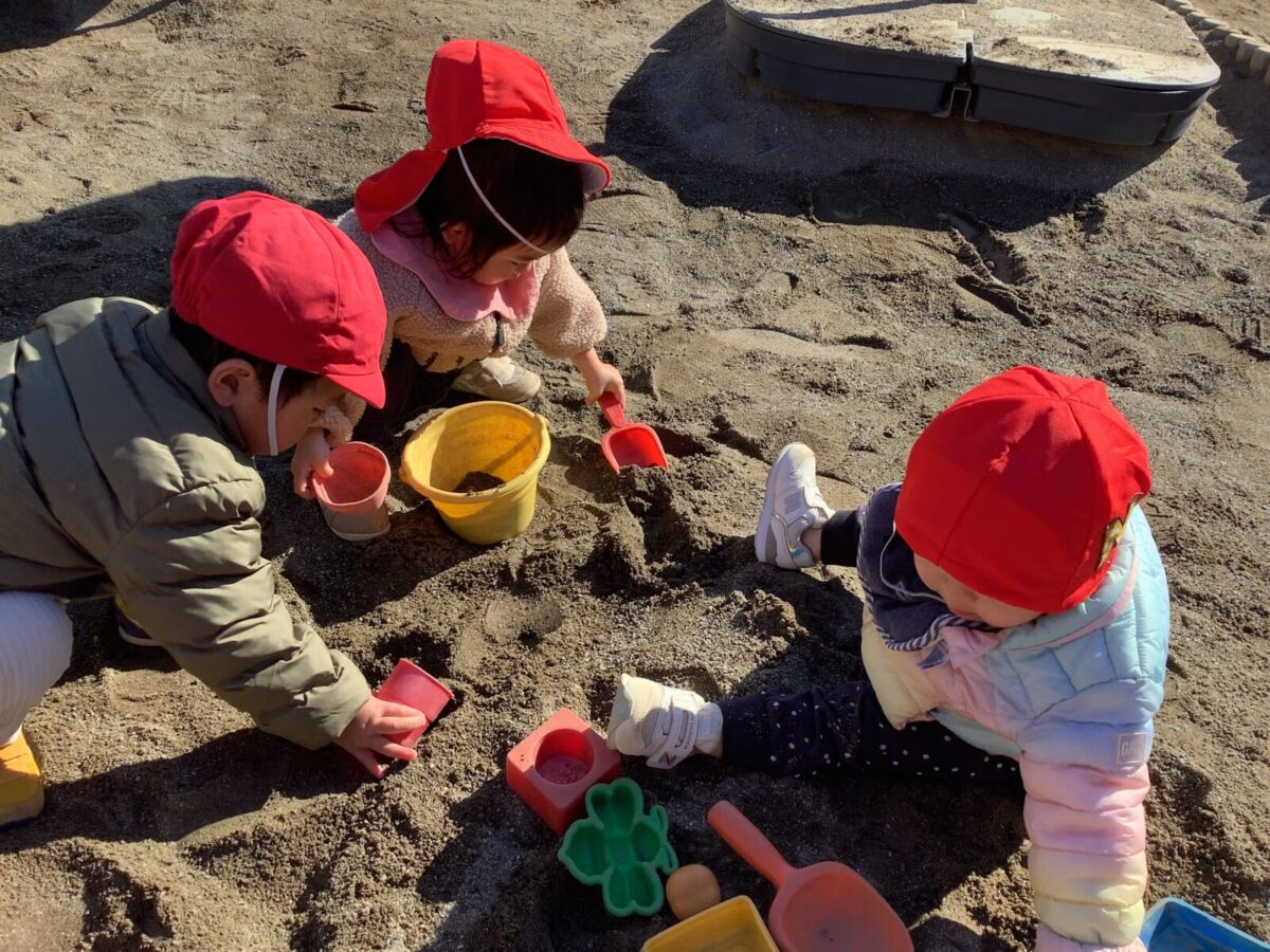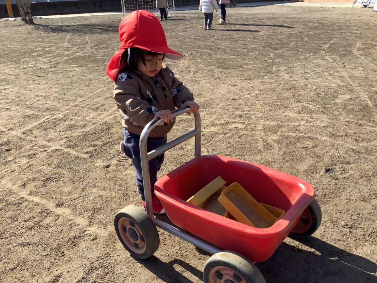 寒さが厳しい2月ですが、子どもたちはおやつを食べると帽子や上着を手にして外へ行こうと意欲満々!毎日、三輪車や押し車、砂遊びや滑り台、ブランコなど元気に好きな遊びを楽しんでいます♪