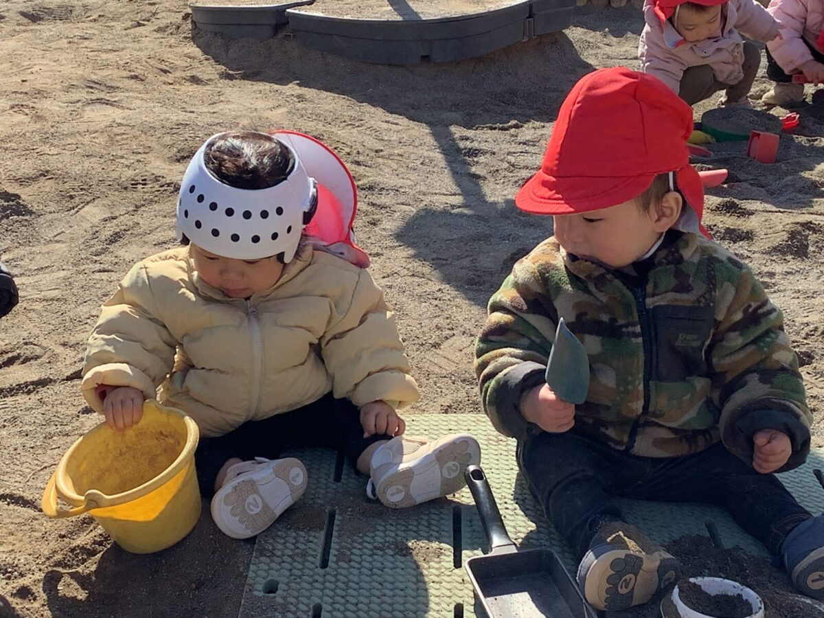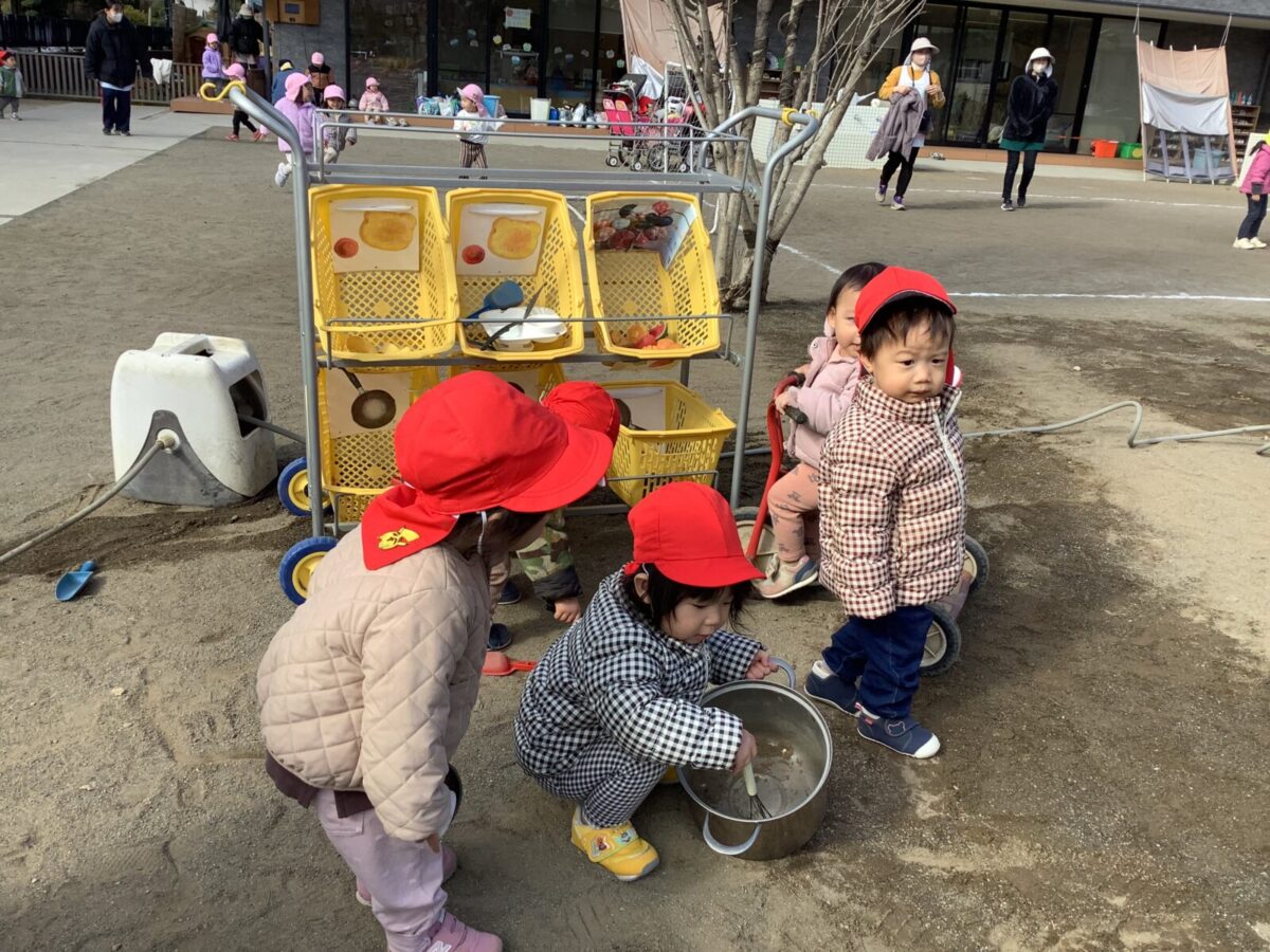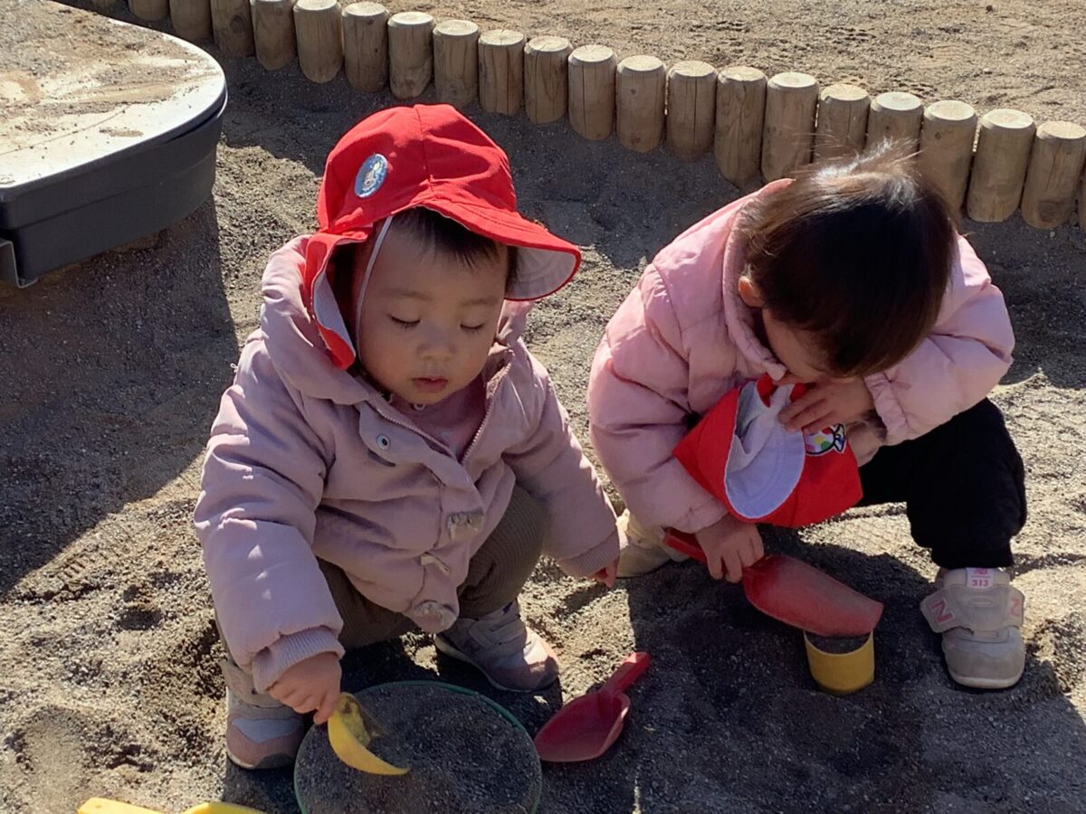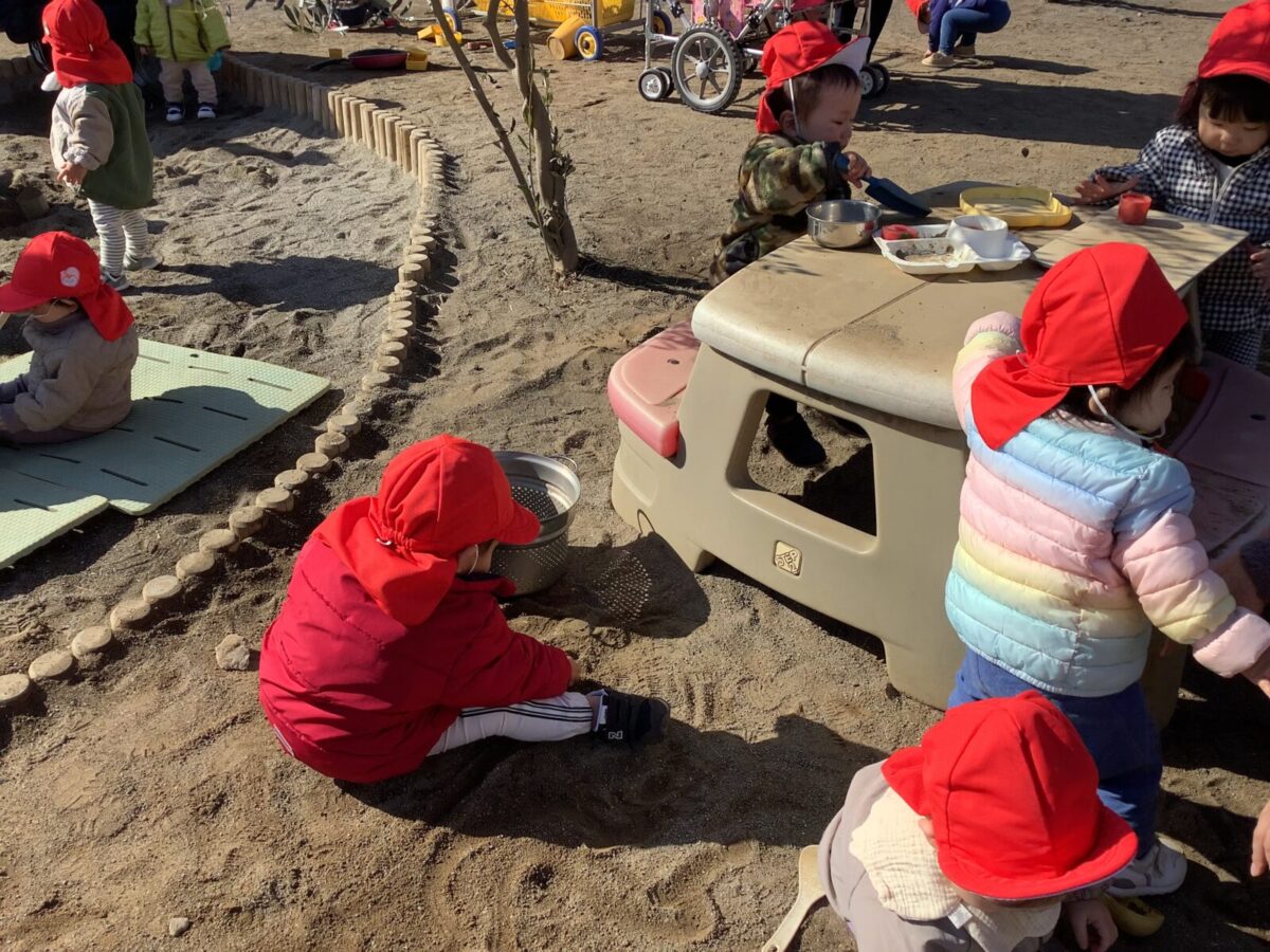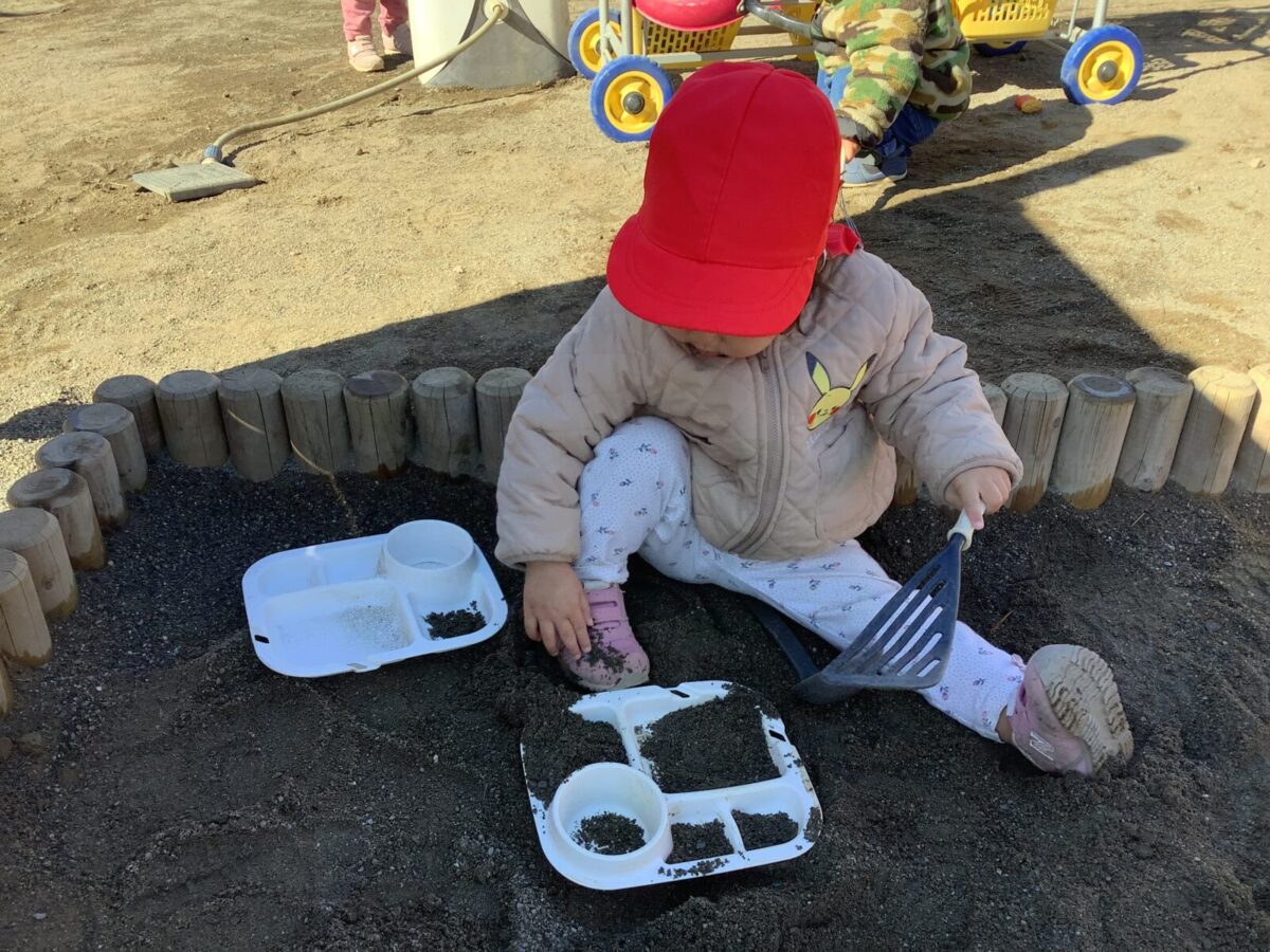 寒さが厳しい2月ですが、子どもたちはおやつを食べると帽子や上着を手にして外へ行こうと意欲満々!毎日、三輪車や押し車、砂遊びや滑り台、ブランコなど元気に好きな遊びを楽しんでいます♪