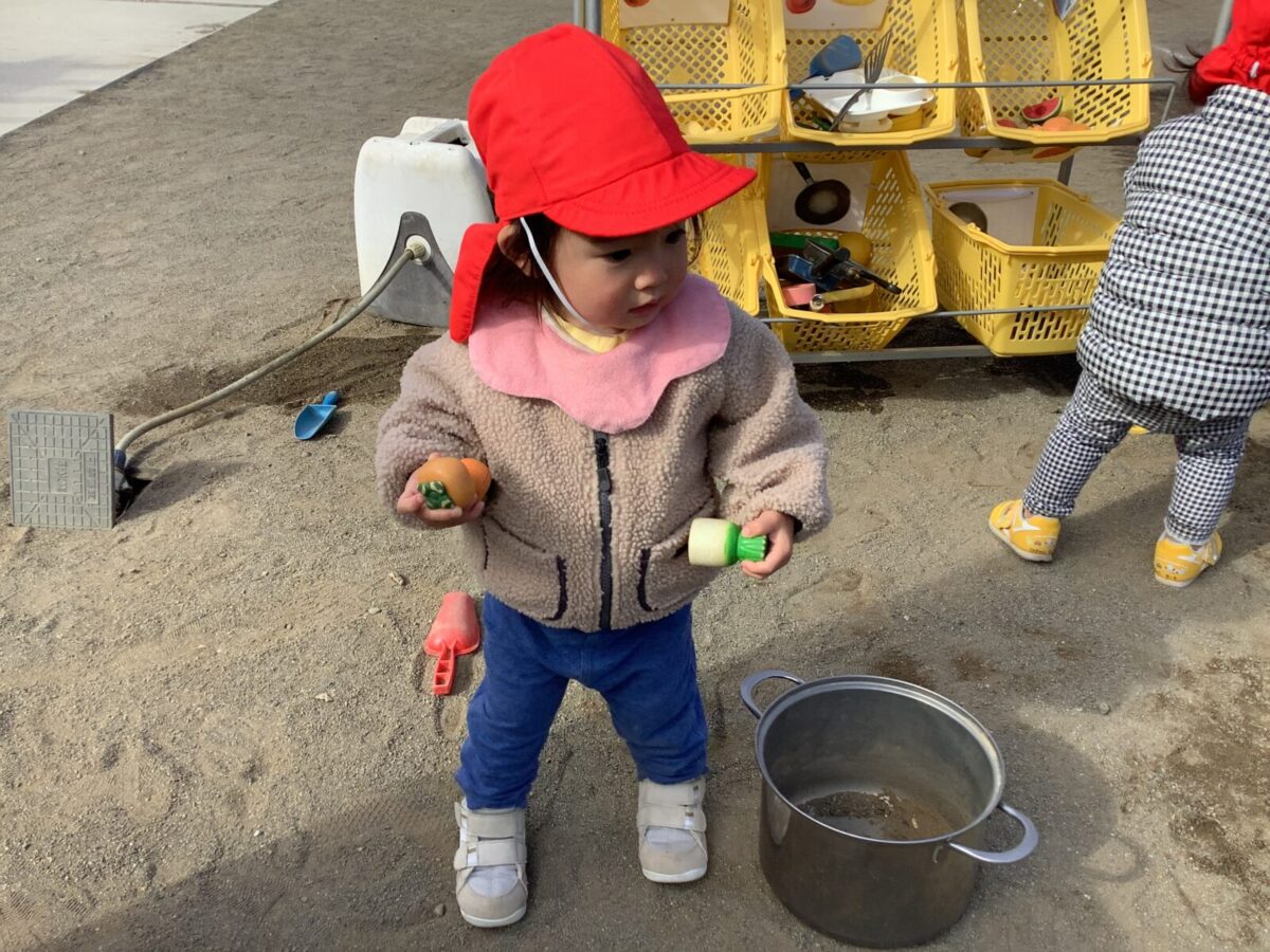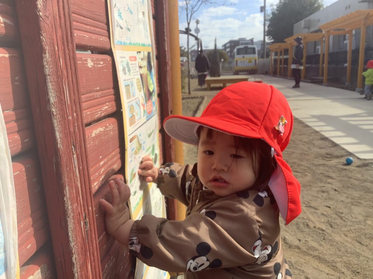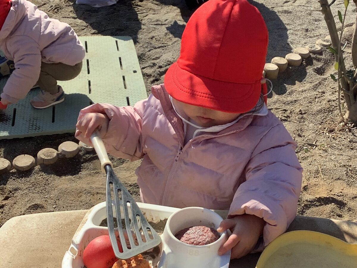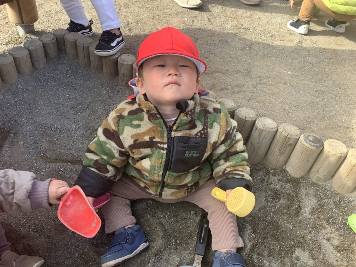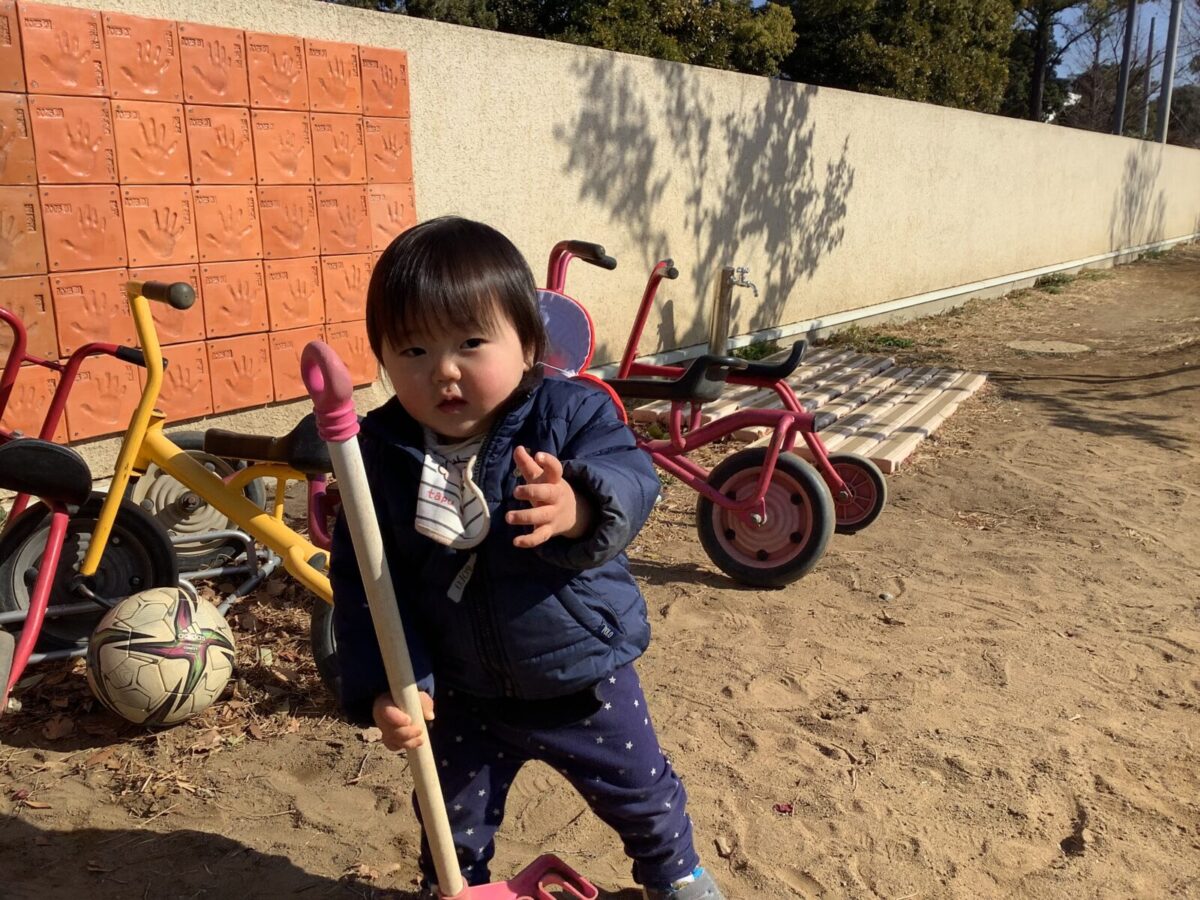 寒さが厳しい2月ですが、子どもたちはおやつを食べると帽子や上着を手にして外へ行こうと意欲満々!毎日、三輪車や押し車、砂遊びや滑り台、ブランコなど元気に好きな遊びを楽しんでいます♪