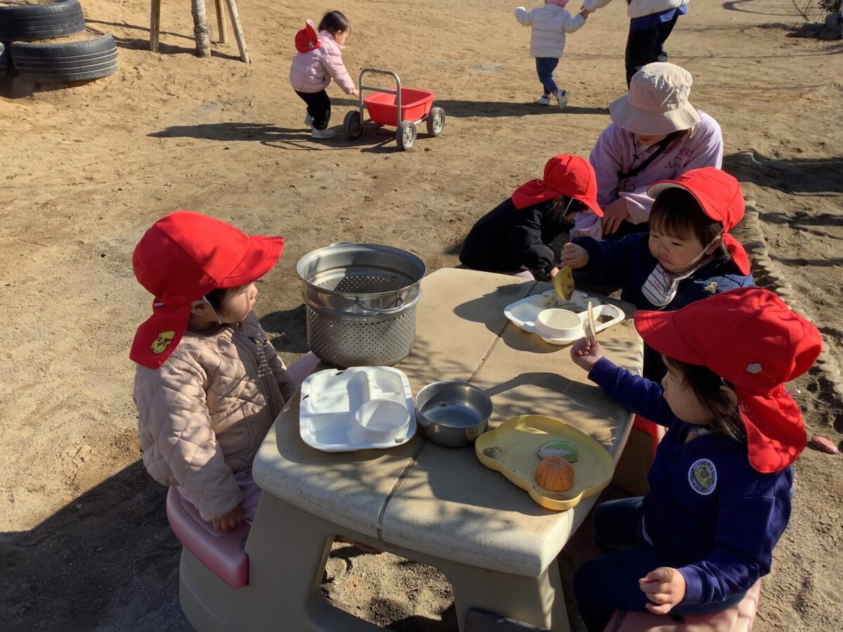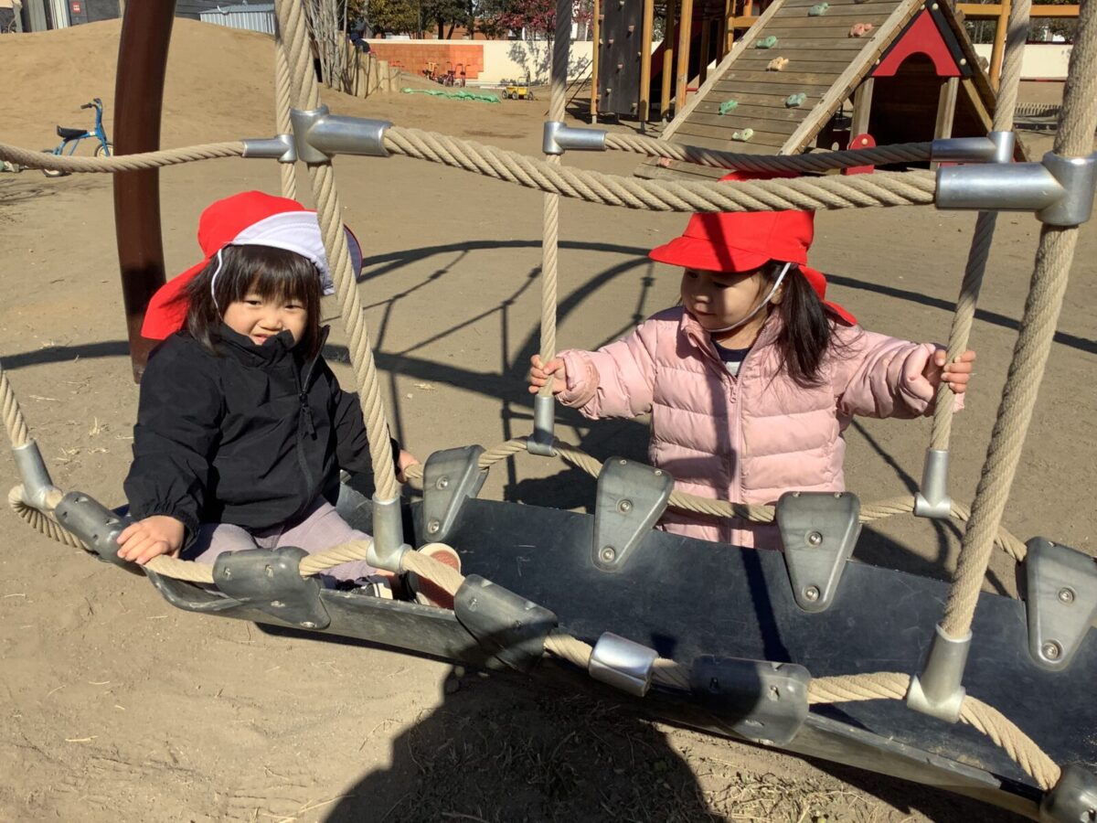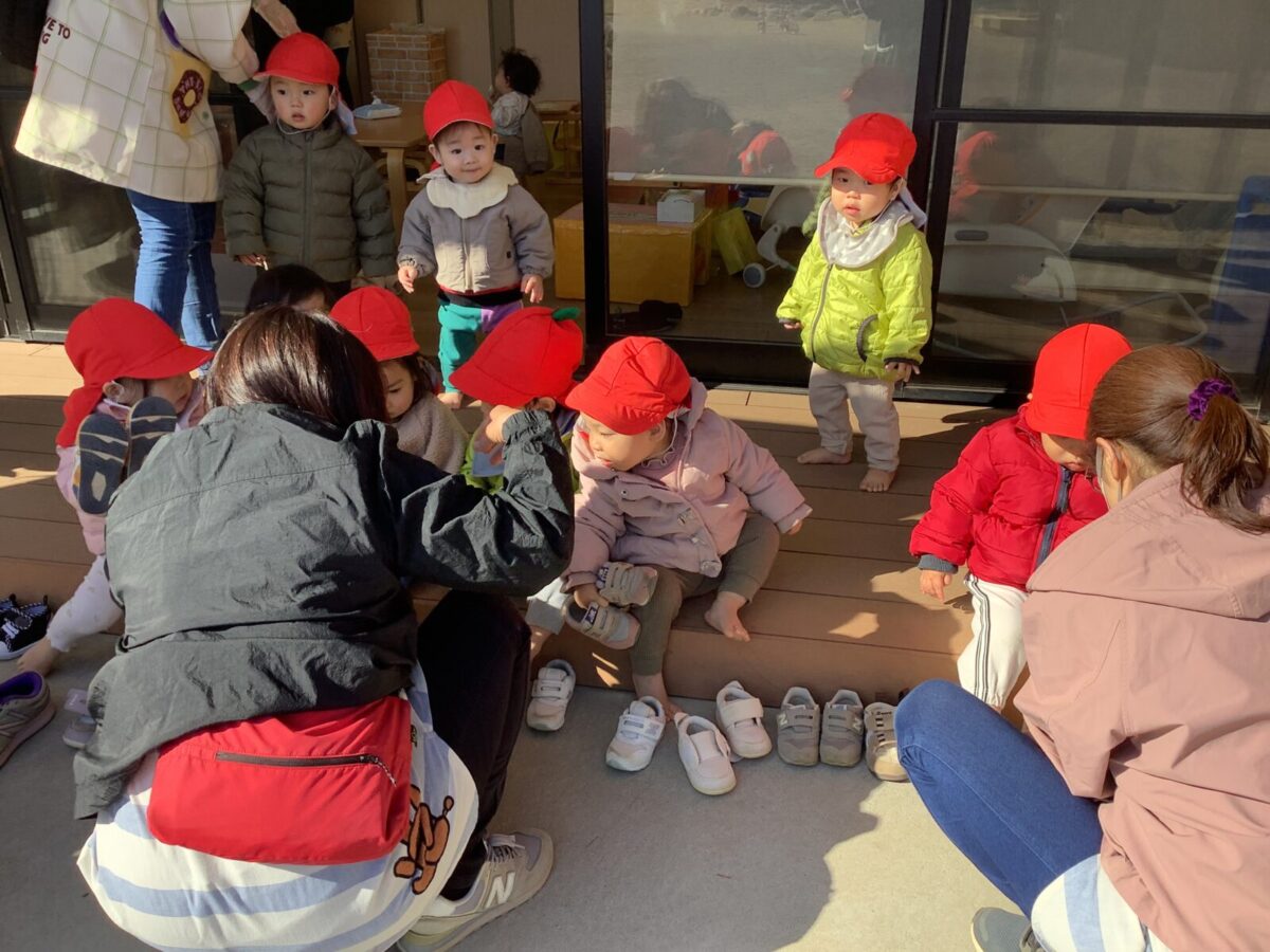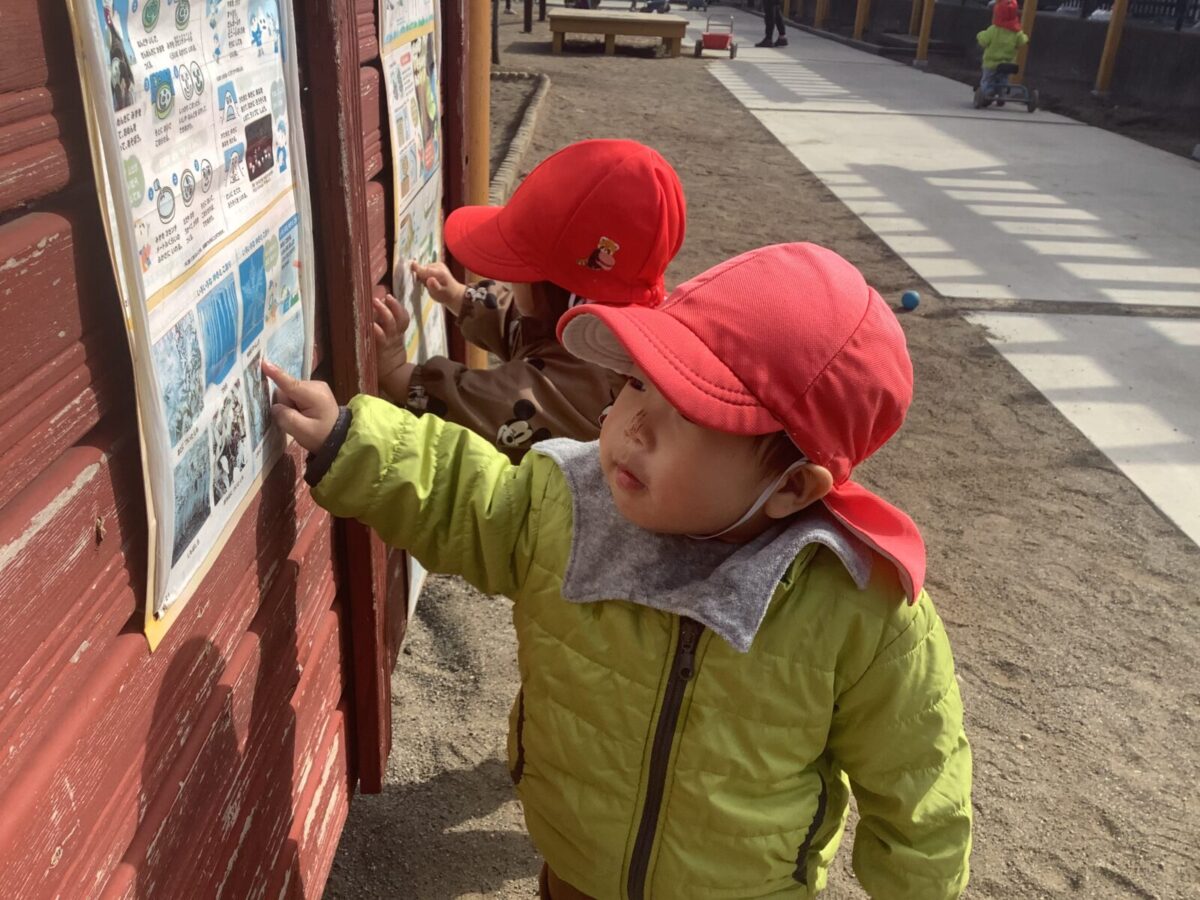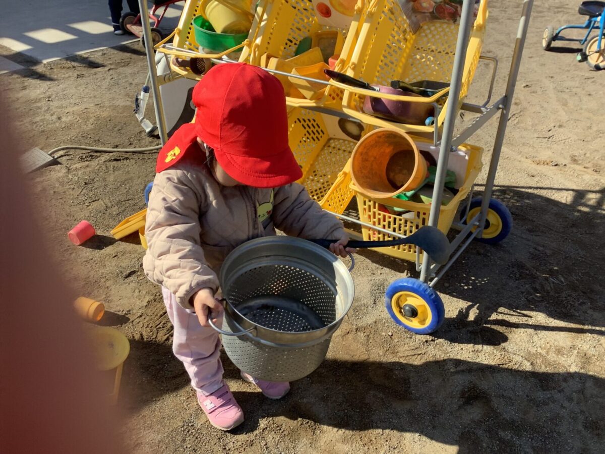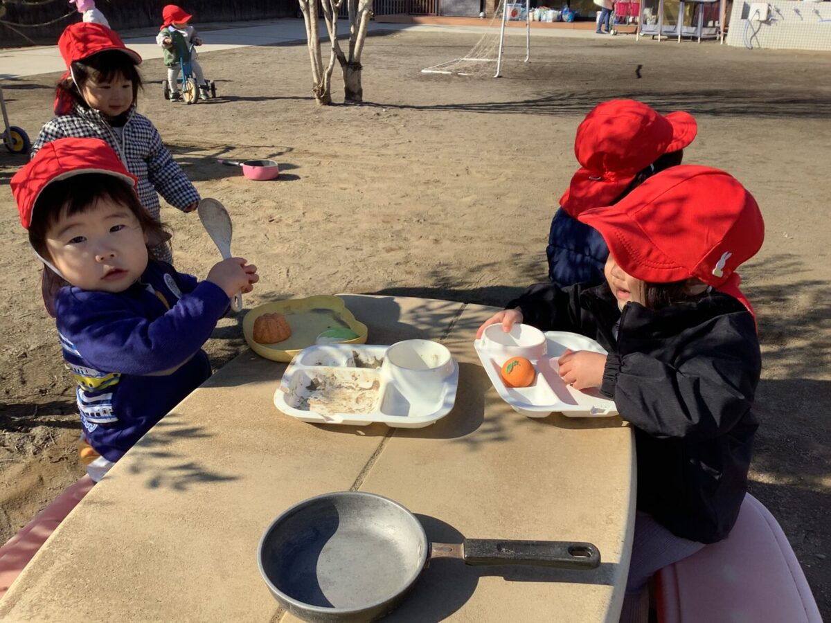 寒さが厳しい2月ですが、子どもたちはおやつを食べると帽子や上着を手にして外へ行こうと意欲満々!毎日、三輪車や押し車、砂遊びや滑り台、ブランコなど元気に好きな遊びを楽しんでいます♪