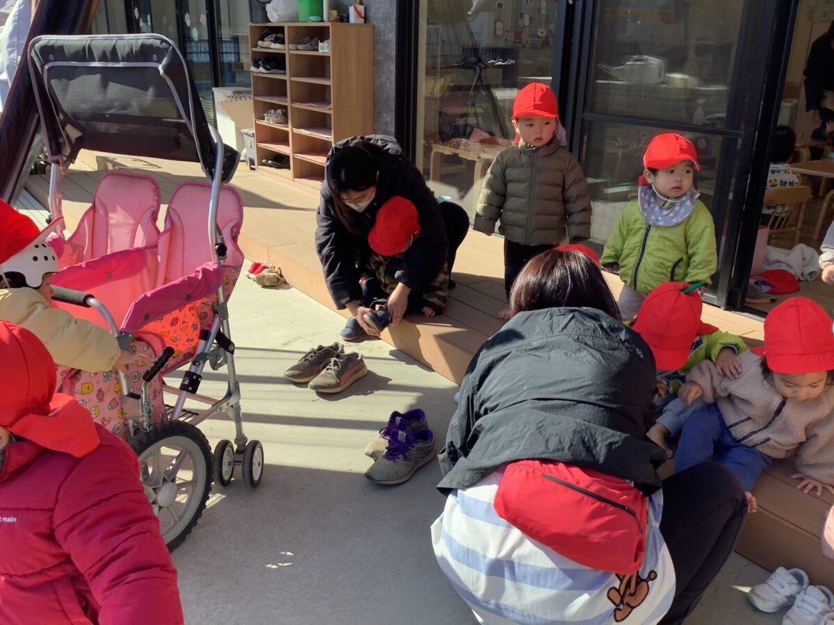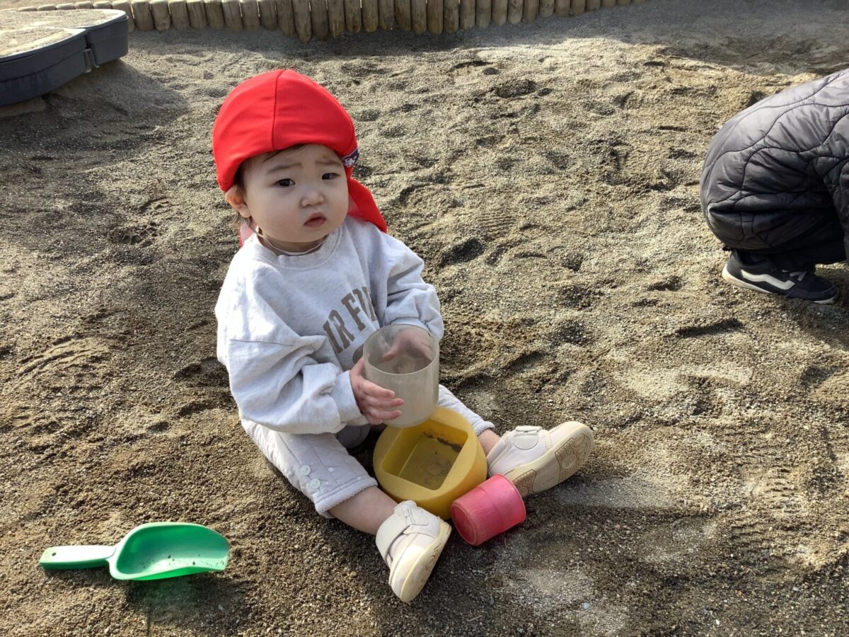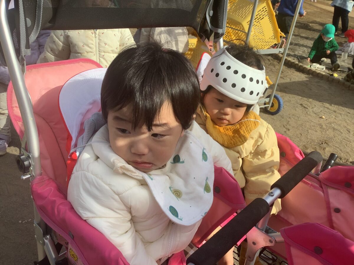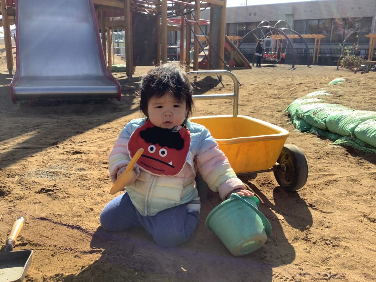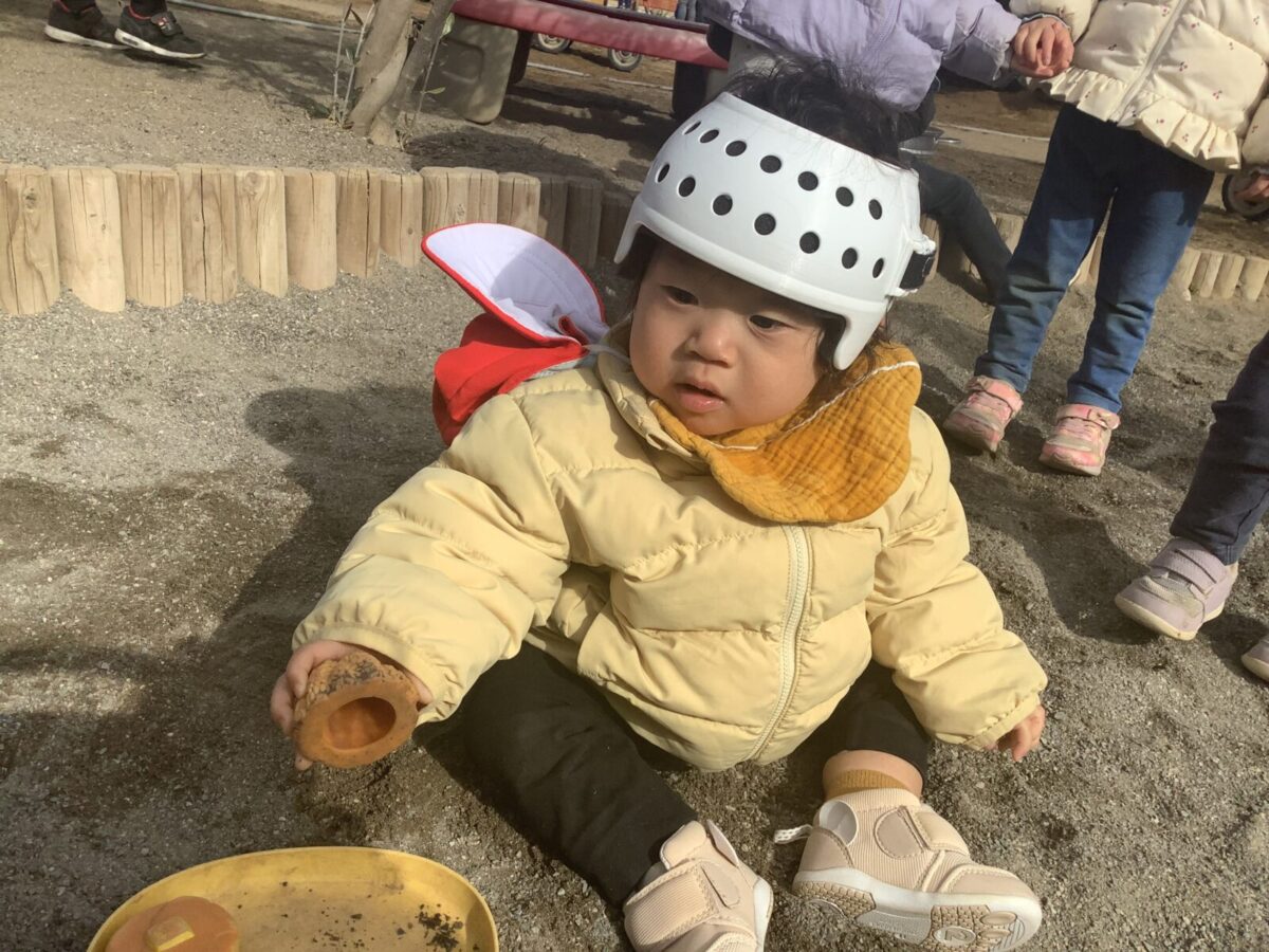 寒さが厳しい2月ですが、子どもたちはおやつを食べると帽子や上着を手にして外へ行こうと意欲満々!毎日、三輪車や押し車、砂遊びや滑り台、ブランコなど元気に好きな遊びを楽しんでいます♪