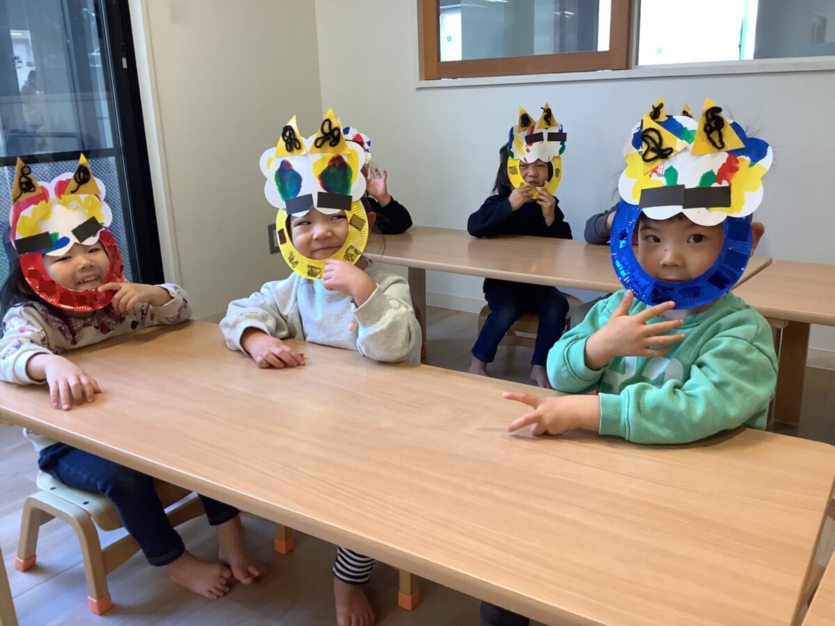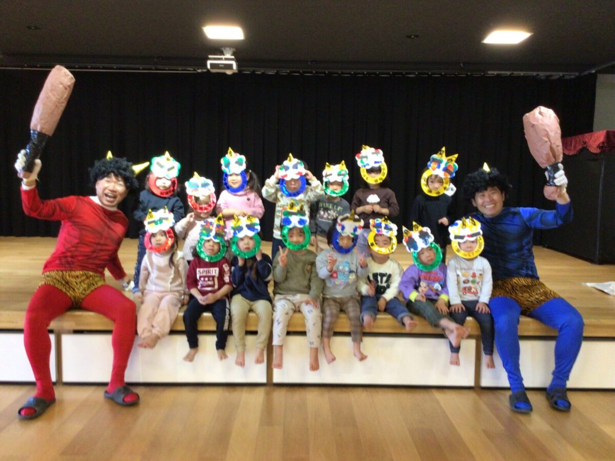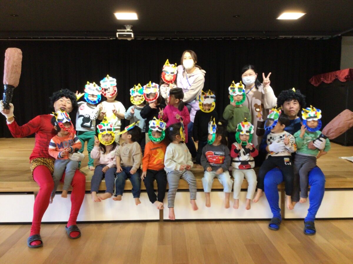 【豆まき】鬼退治前のショットです。鬼を見ると怖くて泣いてしまう子もいましたが、最後は仲良く記念撮影をしましたよ♪