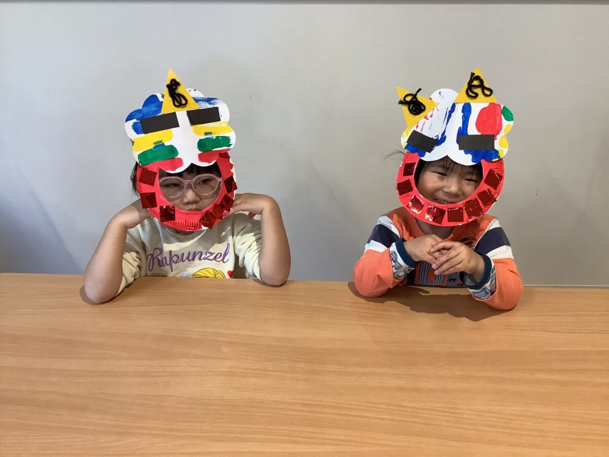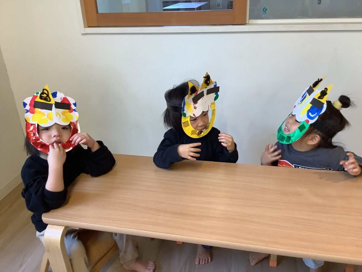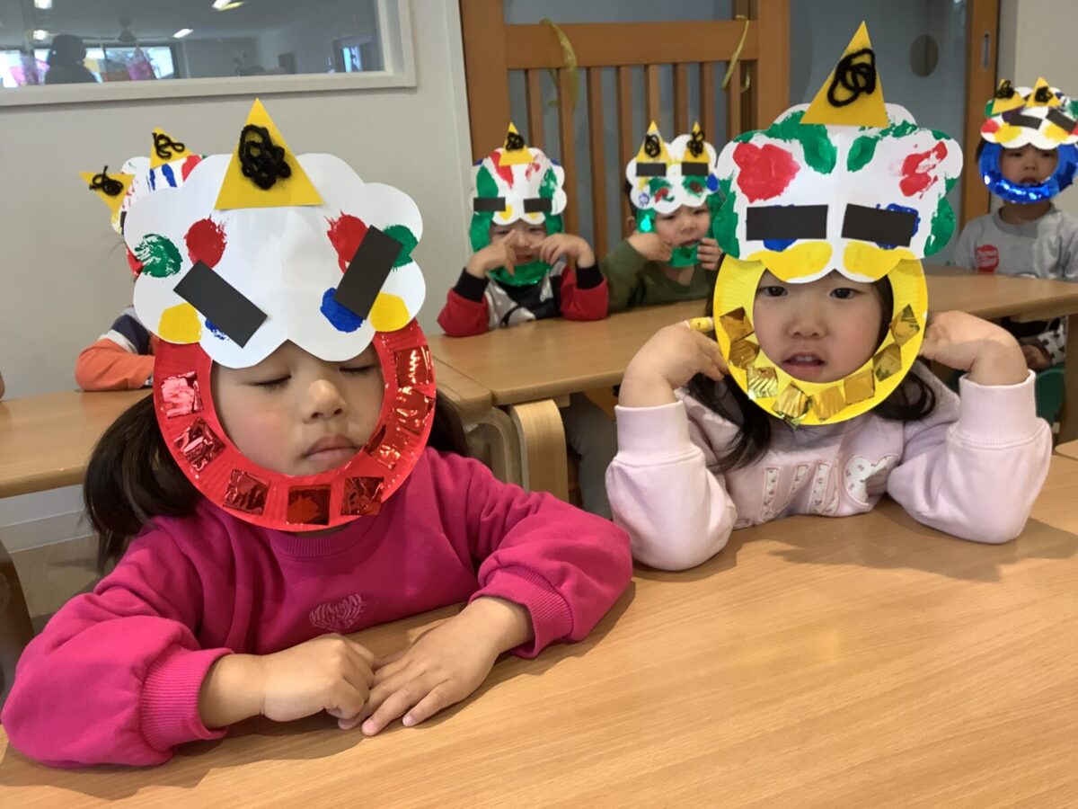 【豆まき】鬼退治前のショットです。鬼を見ると怖くて泣いてしまう子もいましたが、最後は仲良く記念撮影をしましたよ♪