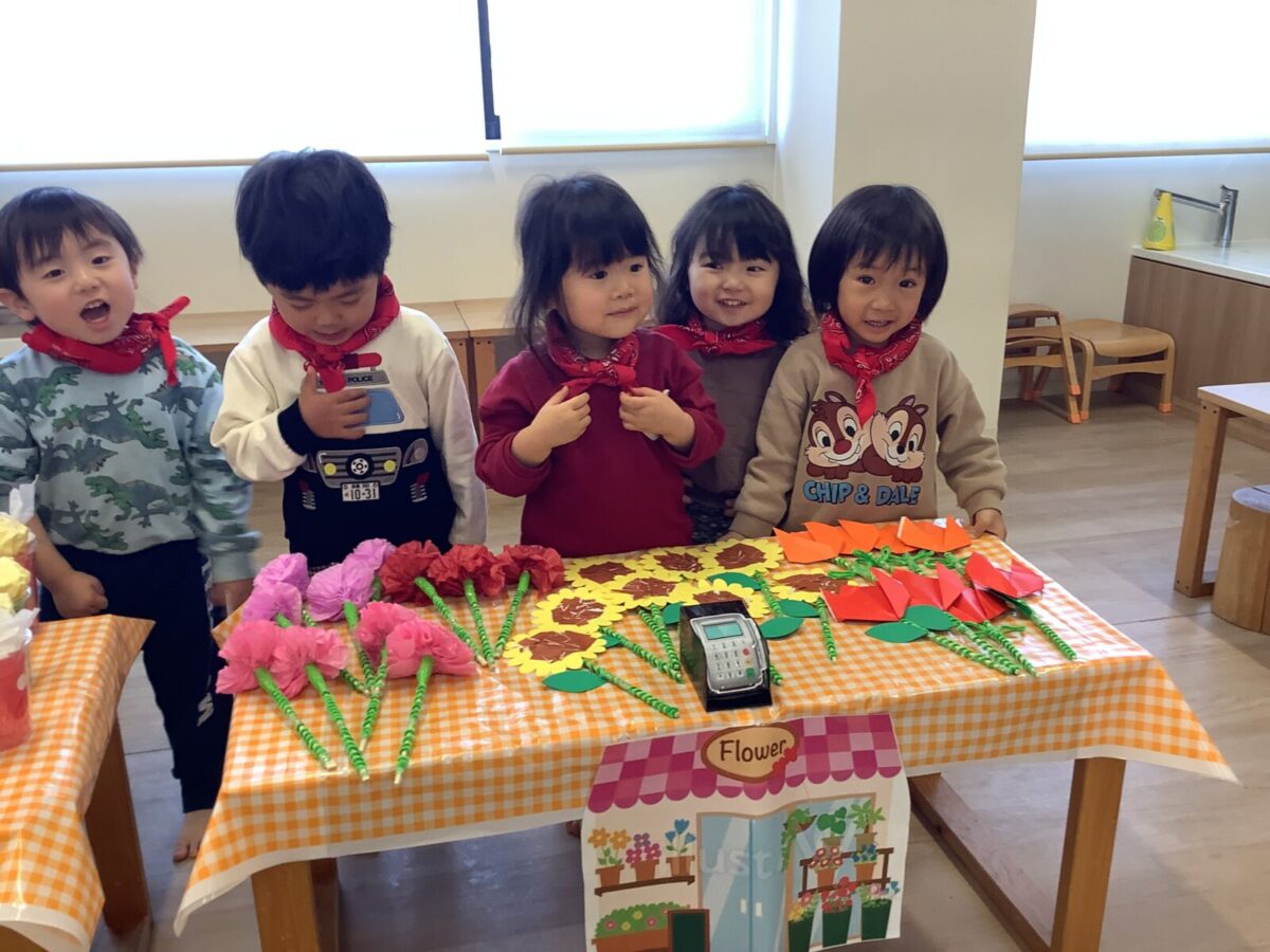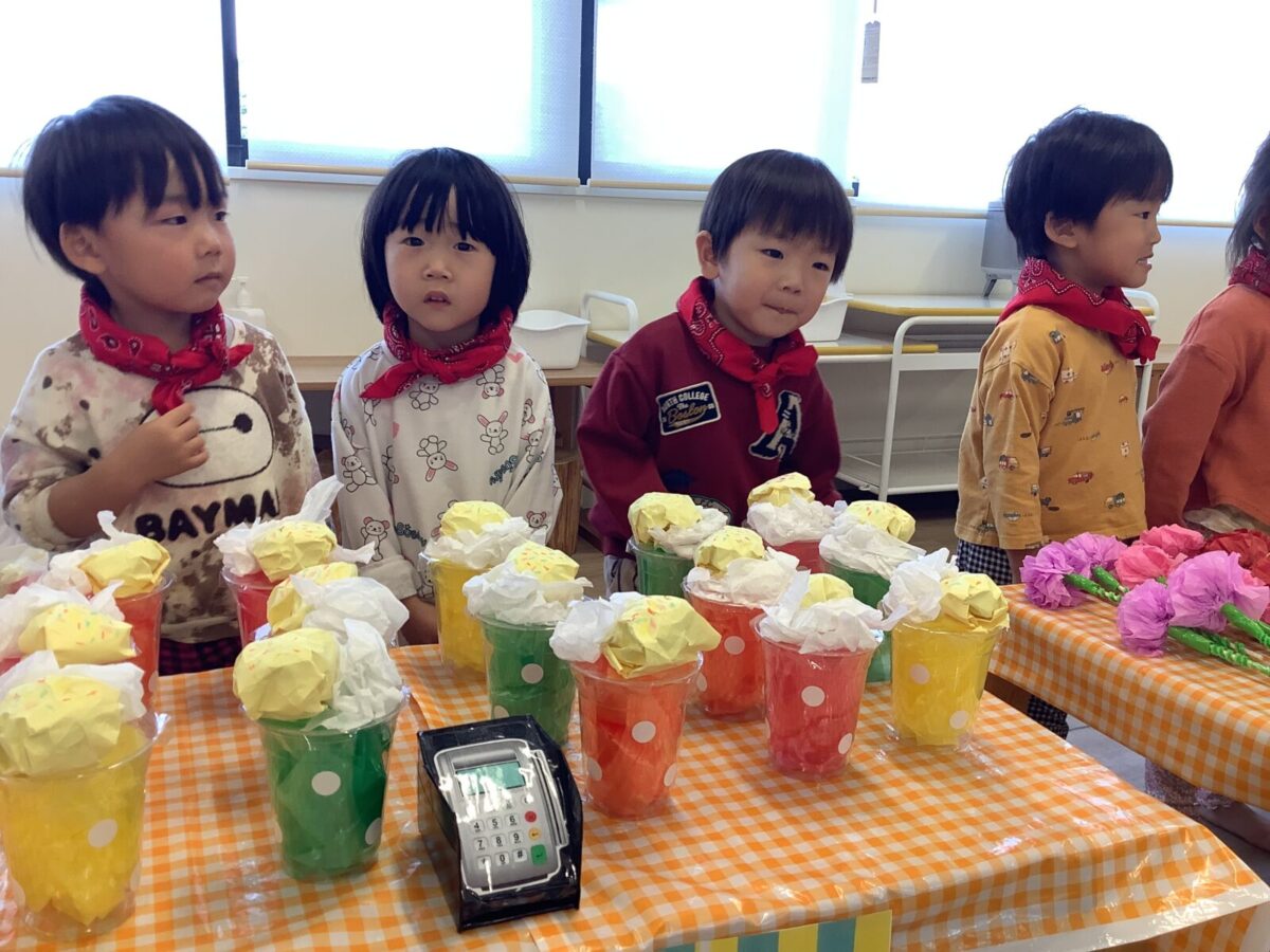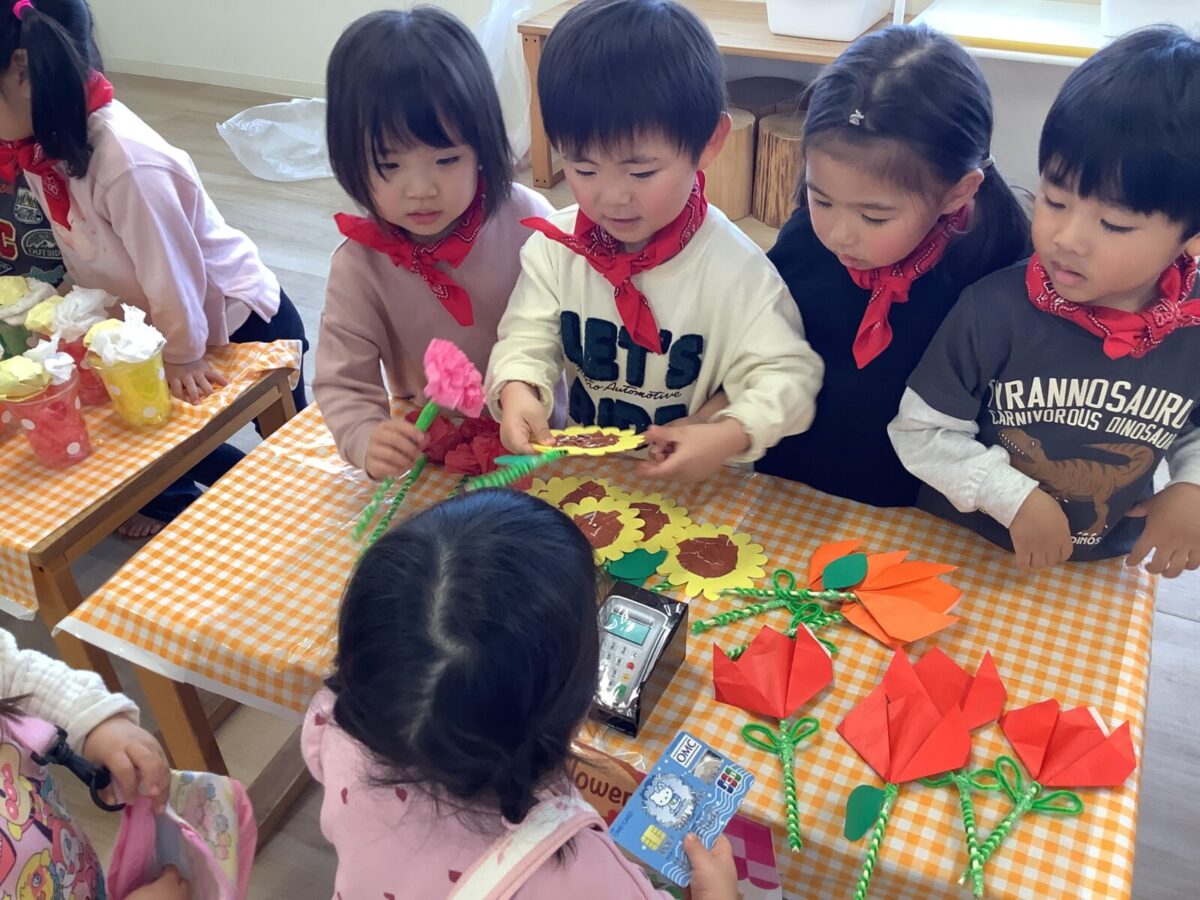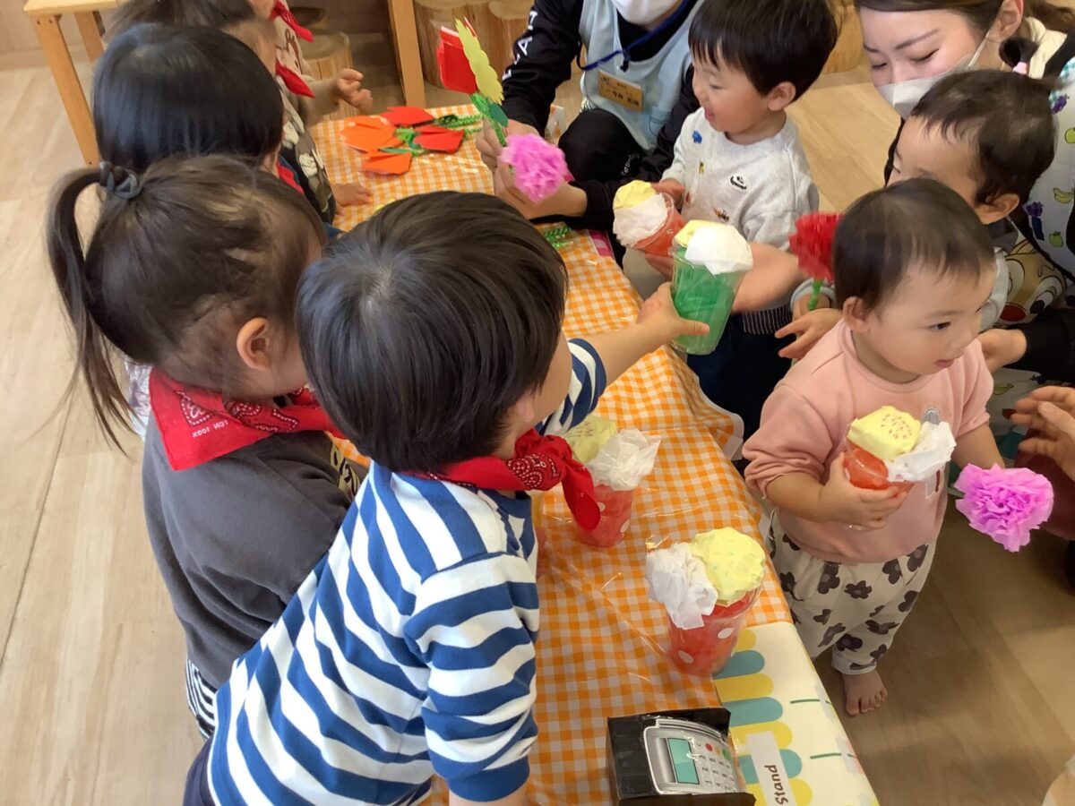 【お店屋さんごっこ】お花屋さんとジュース屋さんのかわいい店員さんたち!お客さんは自分でお絵描きしたお財布を持ってお買い物♪支払いはカードで!