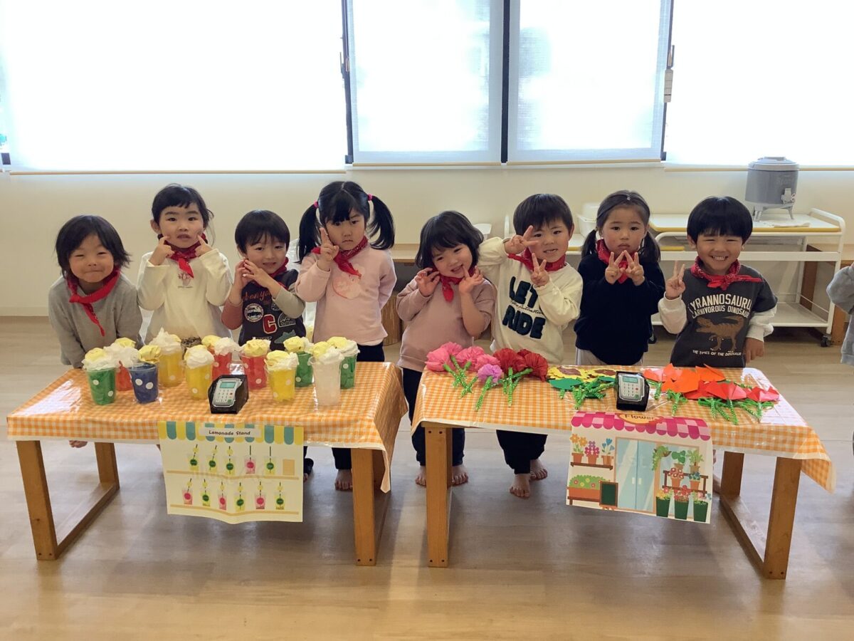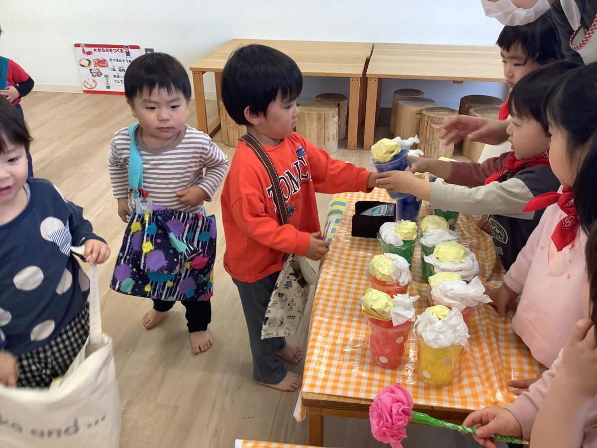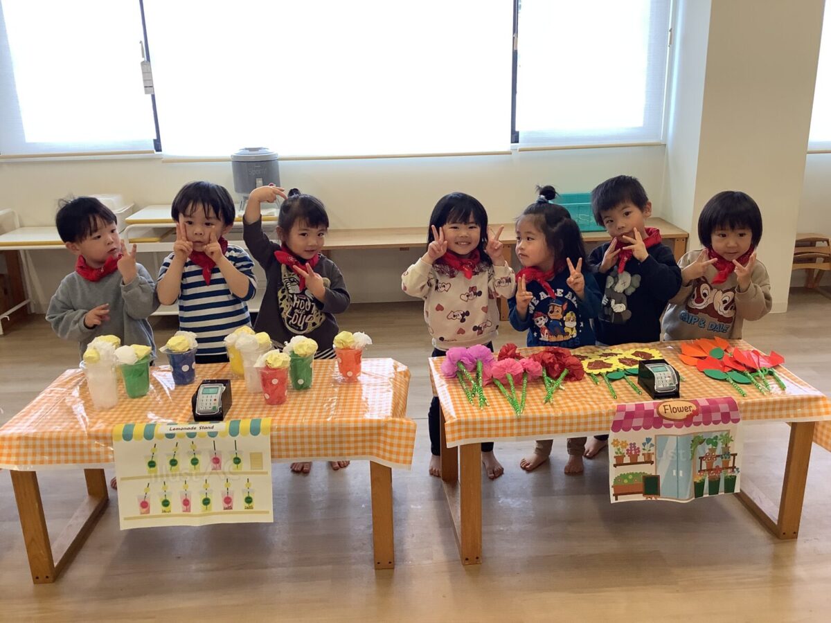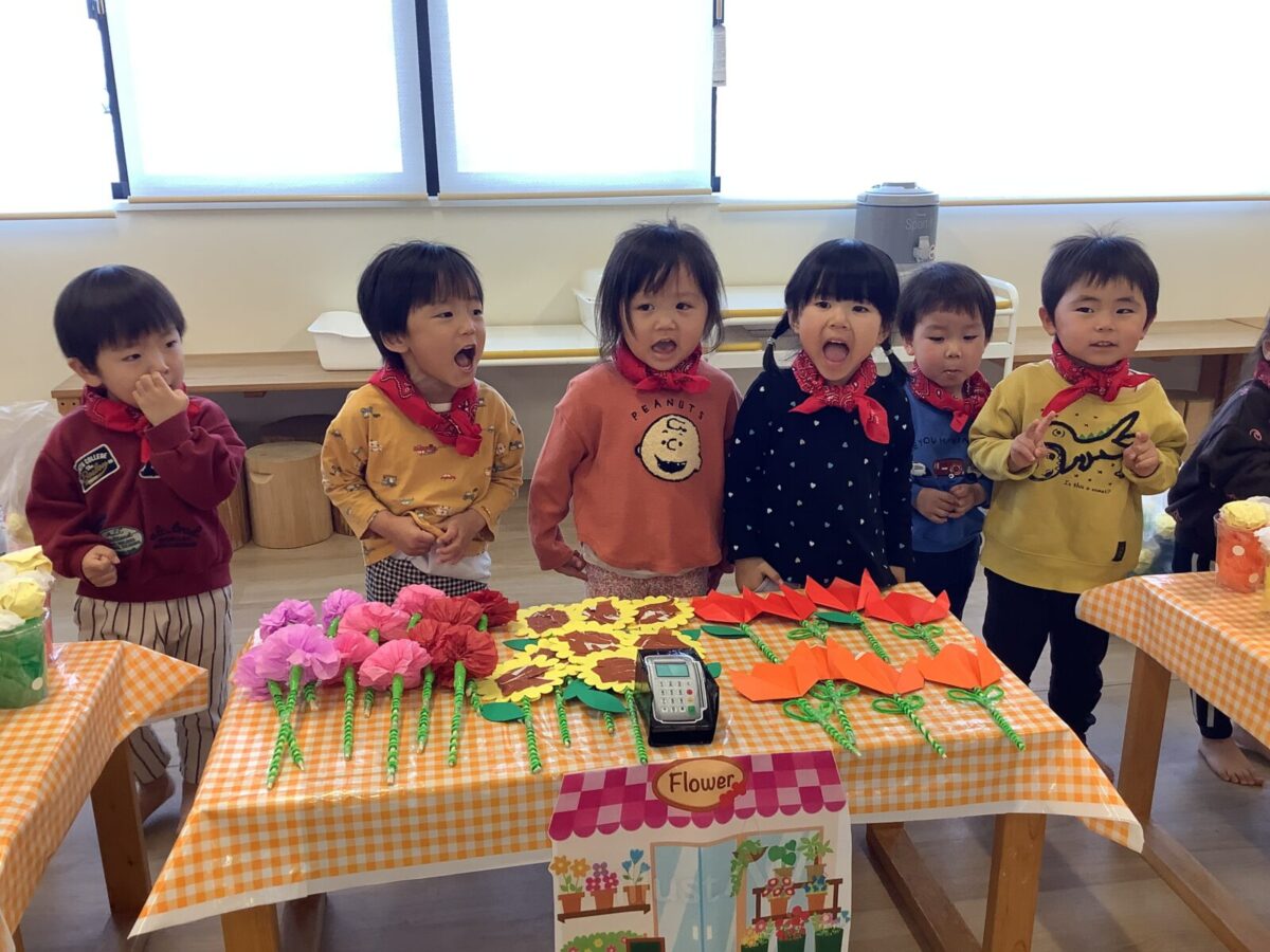 【お店屋さんごっこ】お花屋さんとジュース屋さんのかわいい店員さんたち!お客さんは自分でお絵描きしたお財布を持ってお買い物♪支払いはカードで!