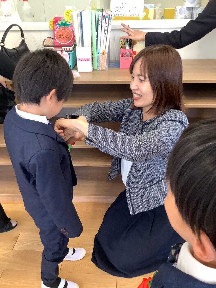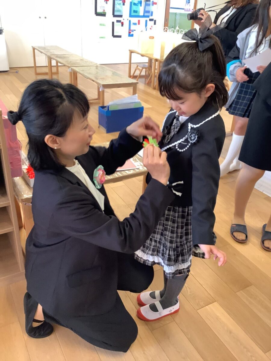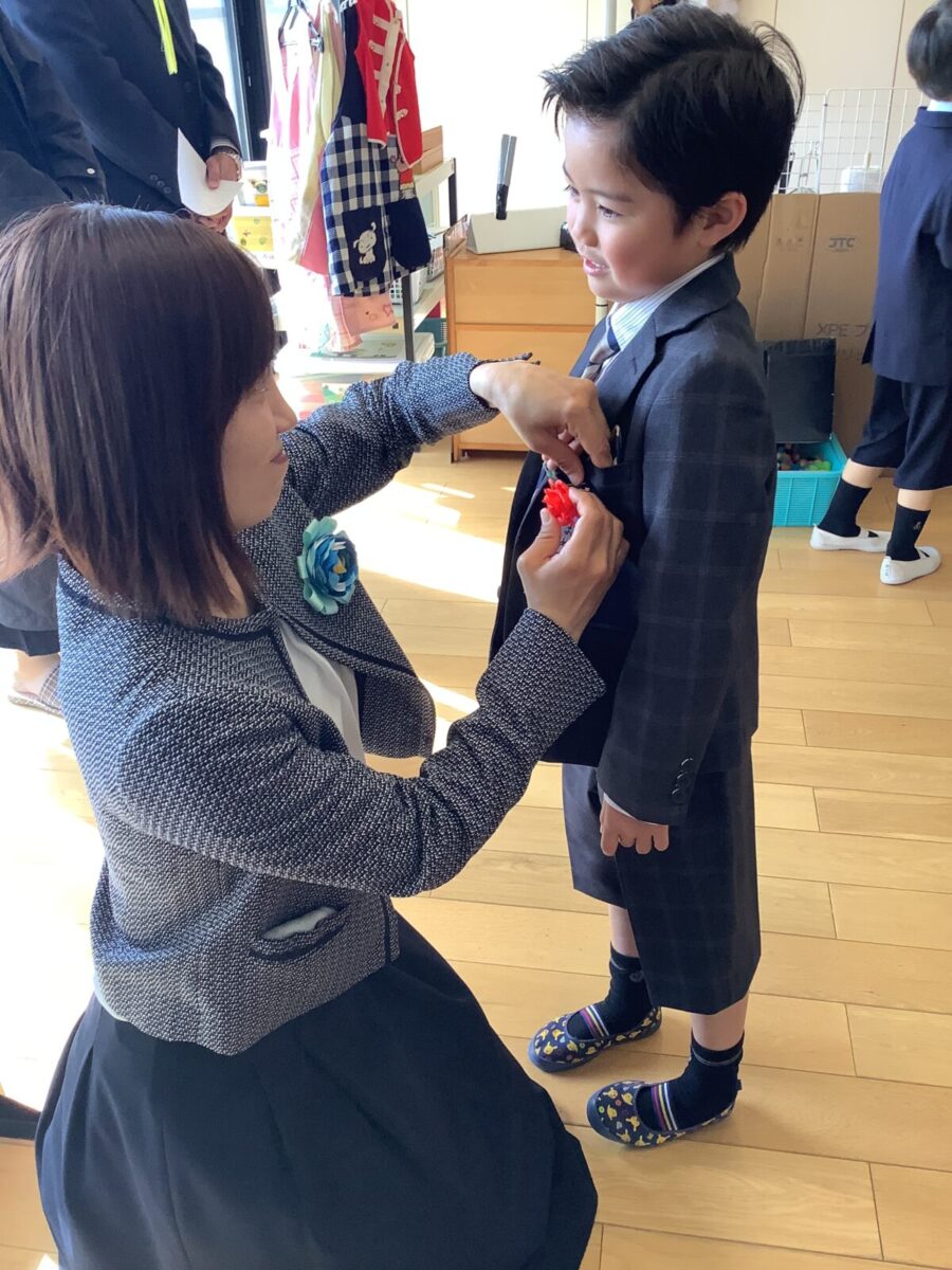 子どもたちはちょっぴり緊張しつつも、ワクワク笑顔で嬉しそうに登園。先生たちから「卒園おめでとう!」とたくさんお祝いの言葉をかけられて、照れている様子もとても可愛かったです。卒園のコサージュをつけてもらい、準備へ。