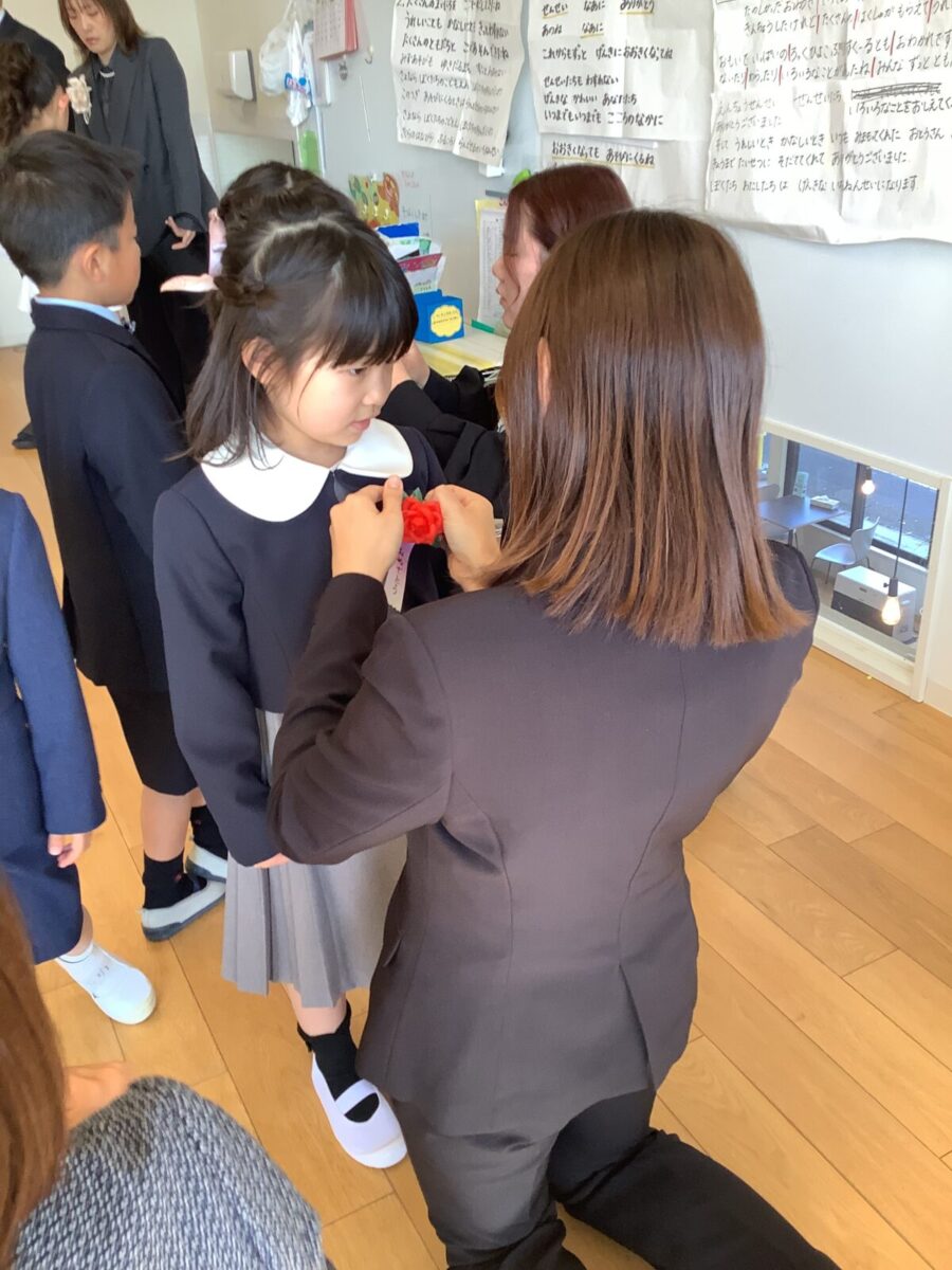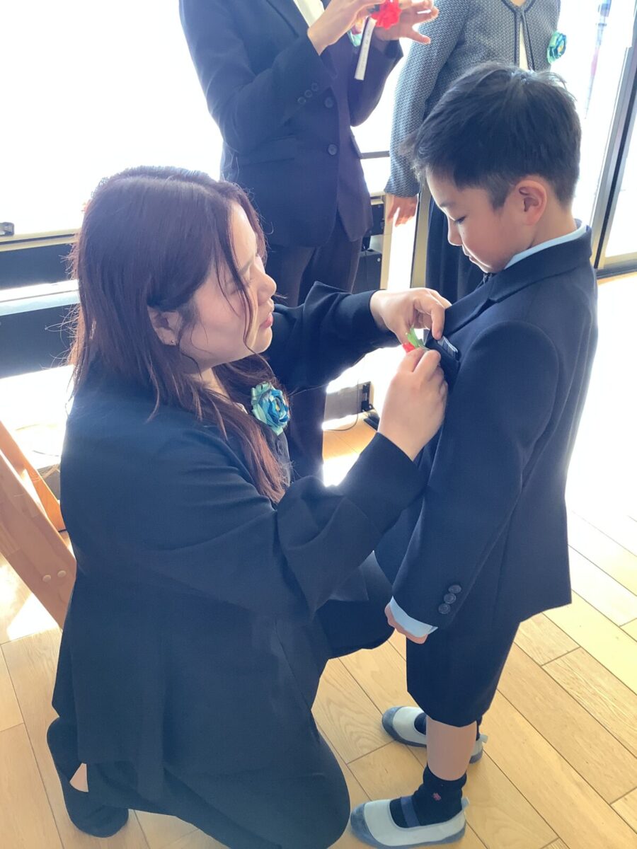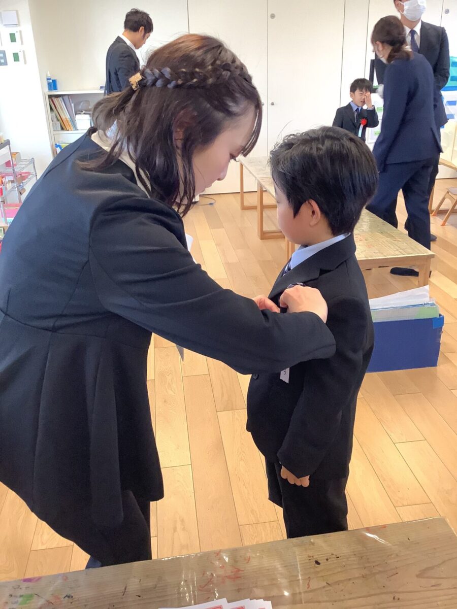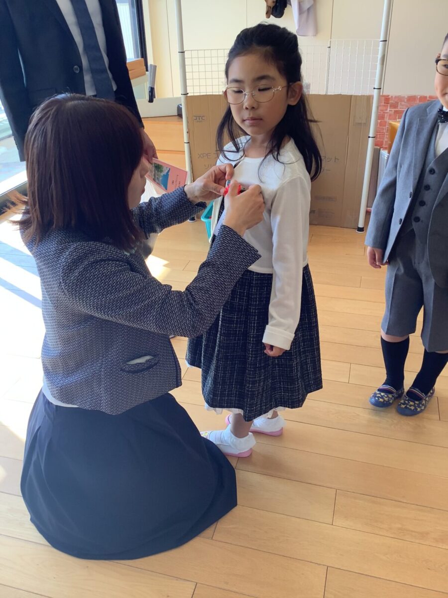 子どもたちはちょっぴり緊張しつつも、ワクワク笑顔で嬉しそうに登園。先生たちから「卒園おめでとう!」とたくさんお祝いの言葉をかけられて、照れている様子もとても可愛かったです。卒園のコサージュをつけてもらい、準備へ。
