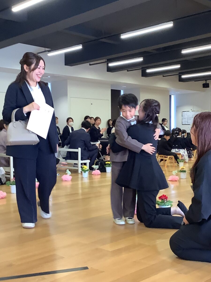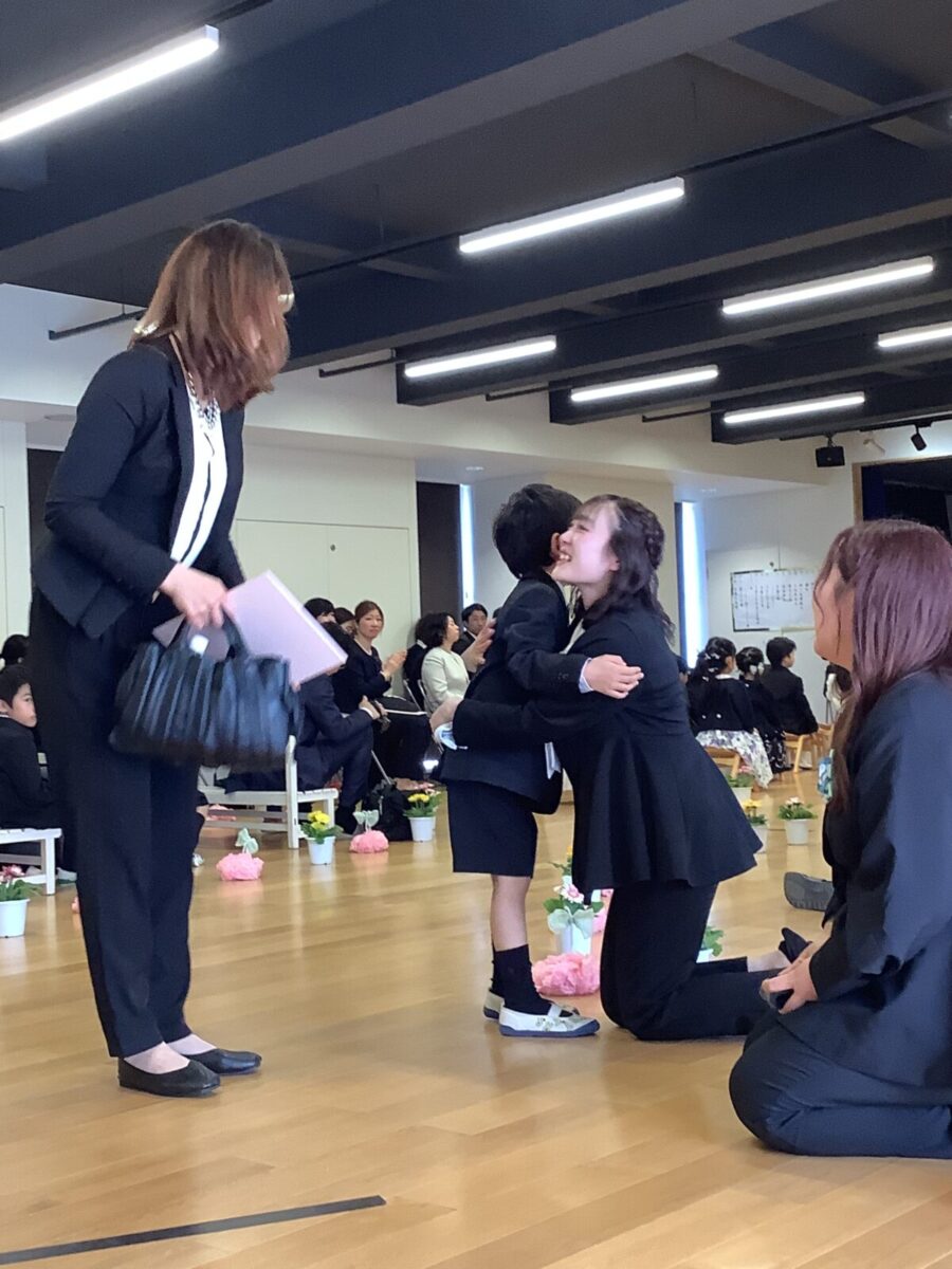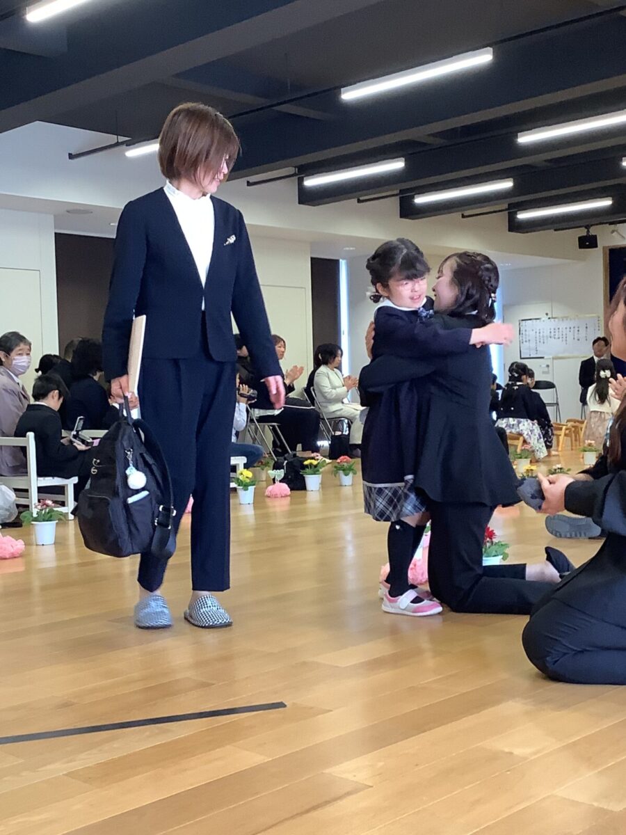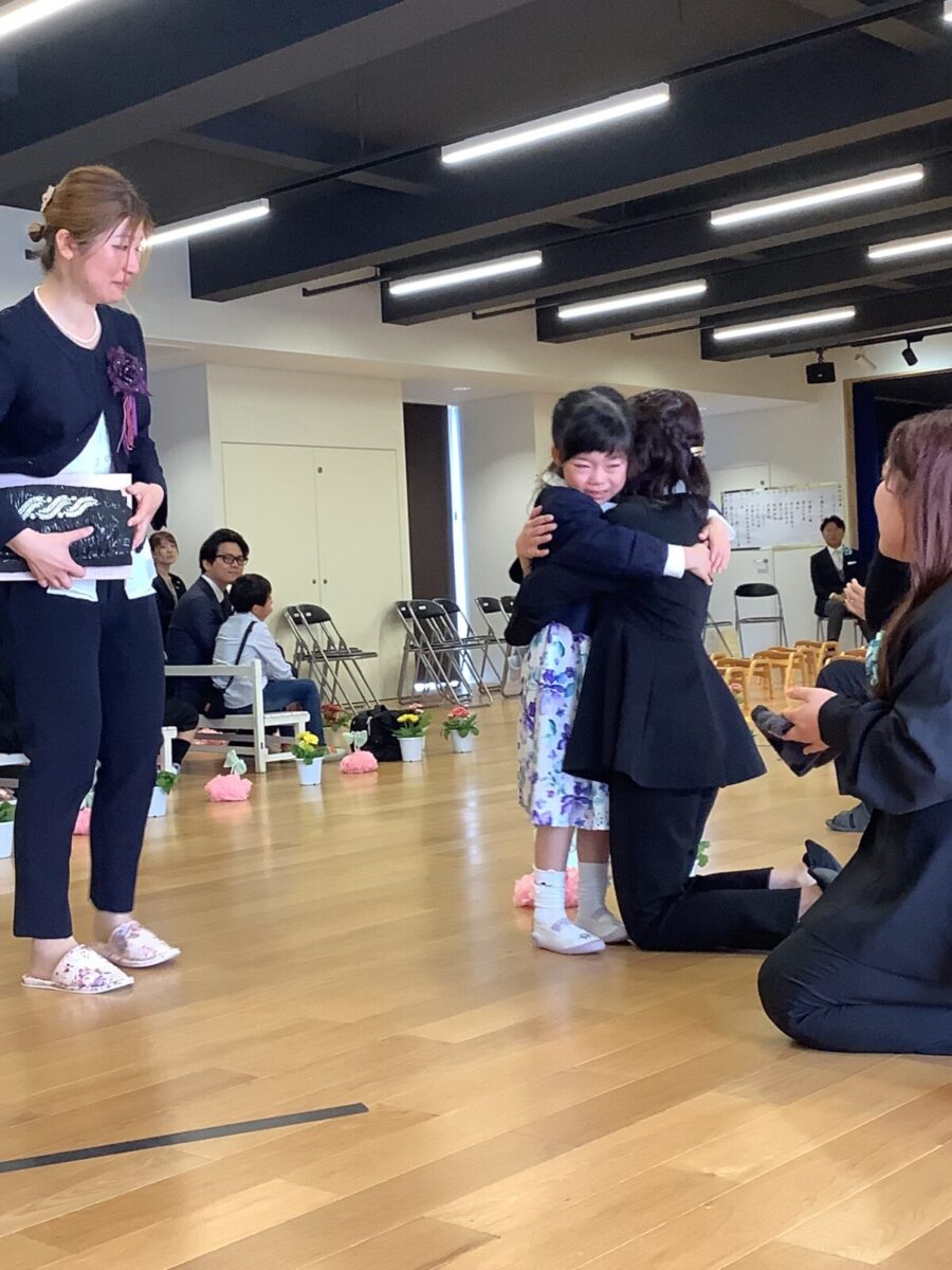 退場。最後に担任の先生とのお別れのハグです。涙する子どもたちの姿に思わずもらい泣き・・・。