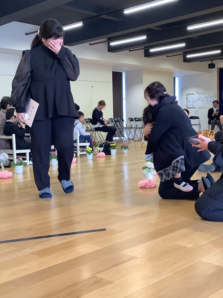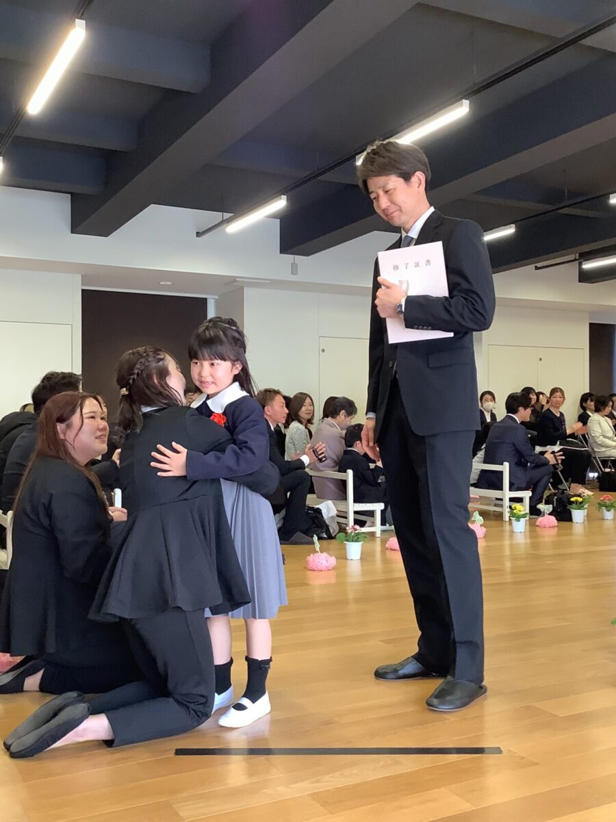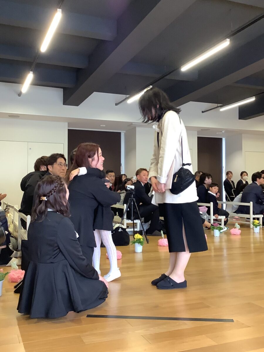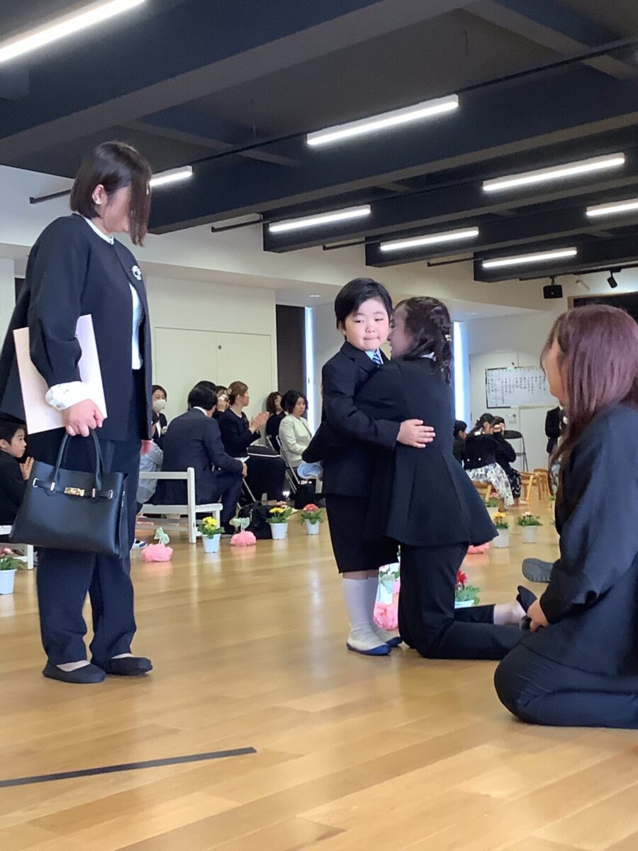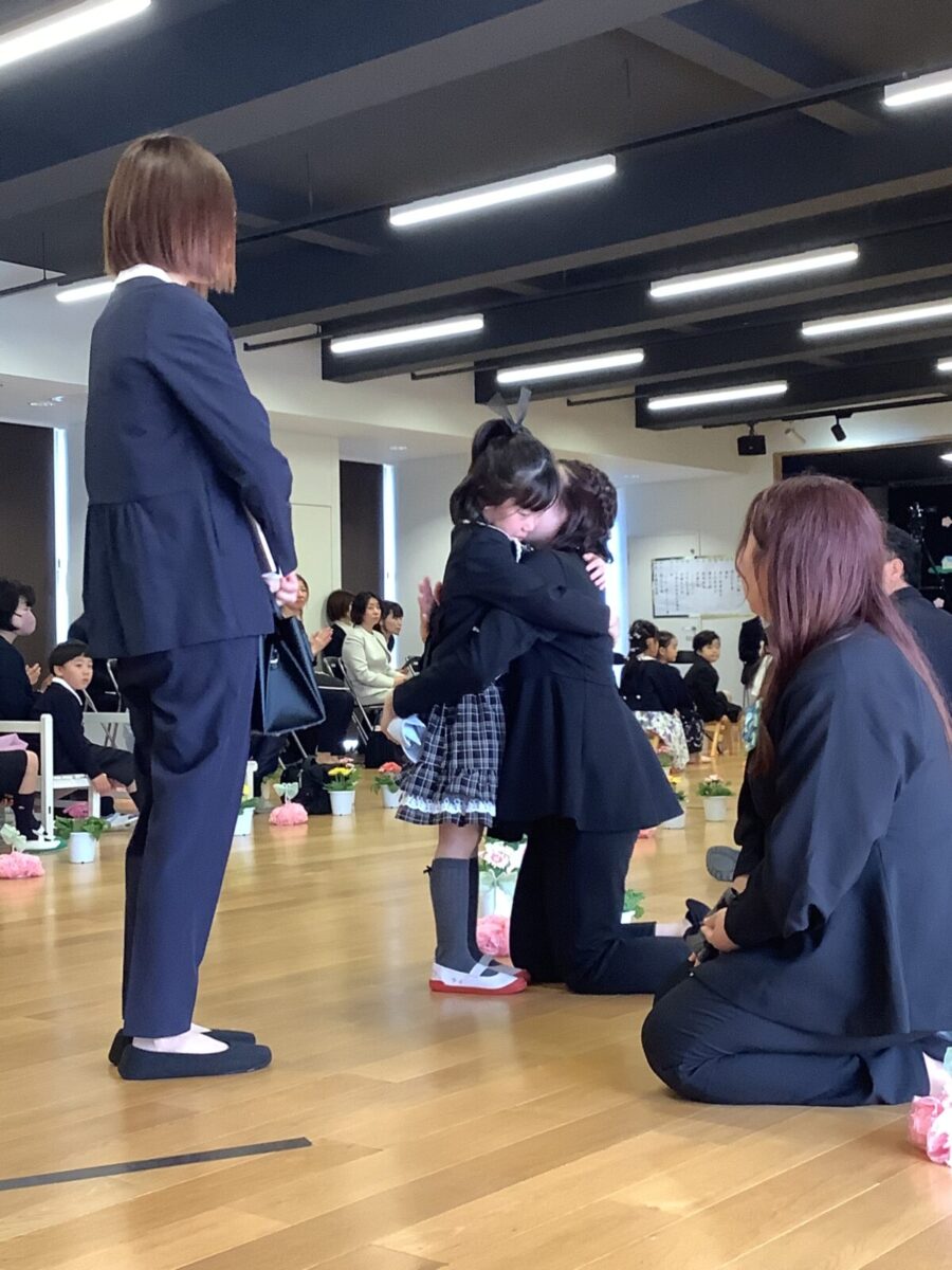 退場。最後に担任の先生とのお別れのハグです。涙する子どもたちの姿に思わずもらい泣き・・・。